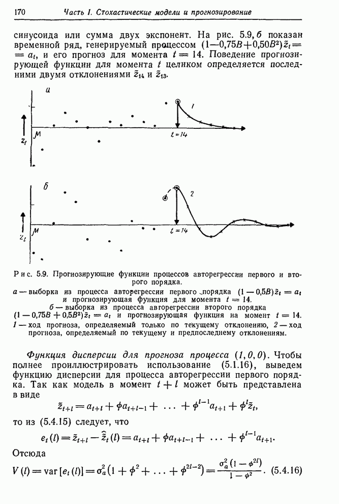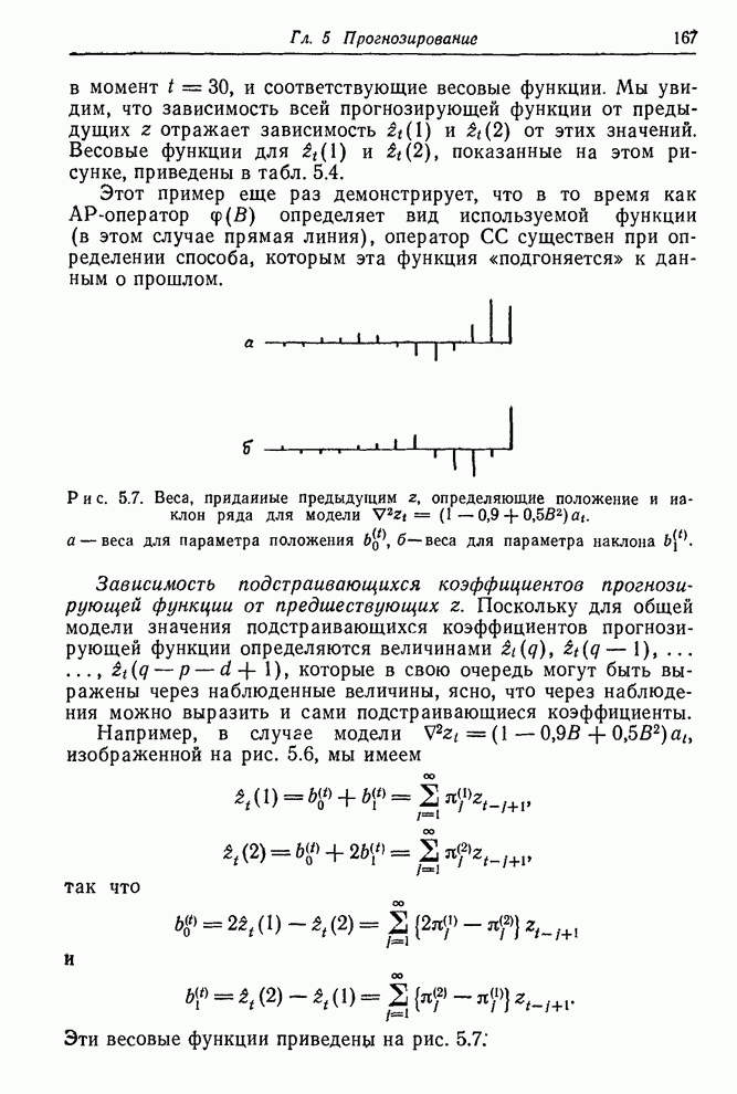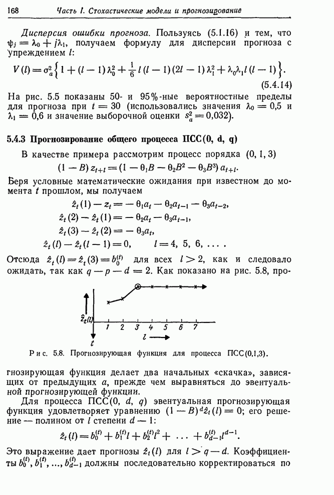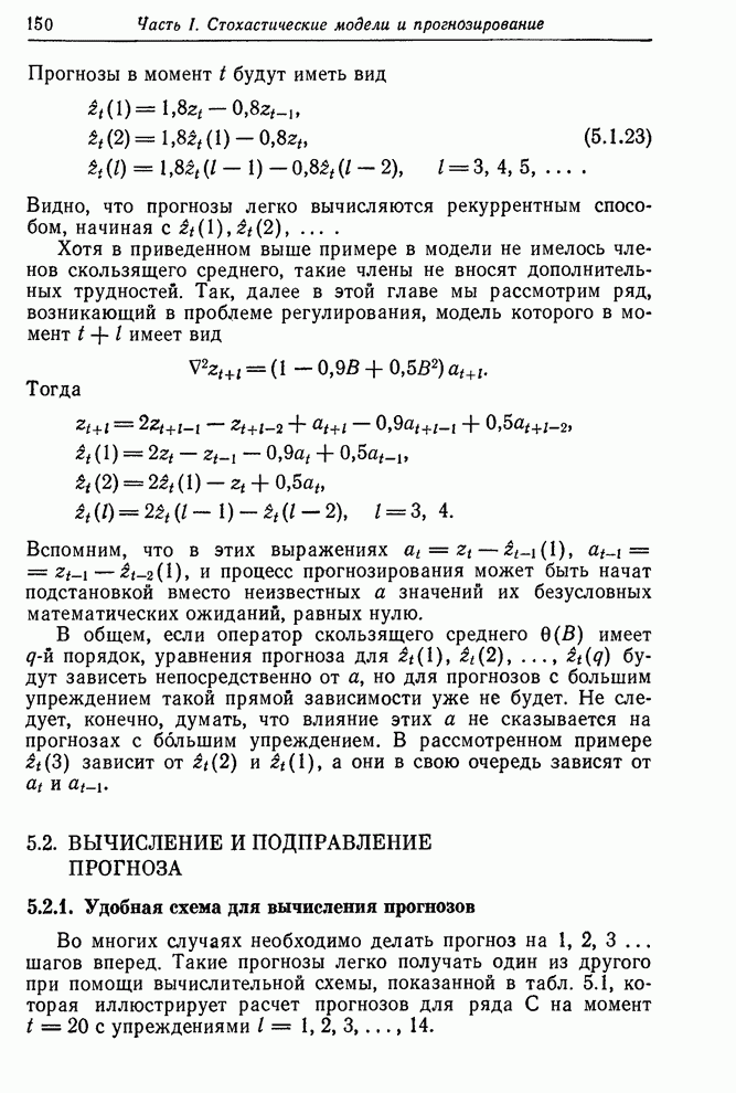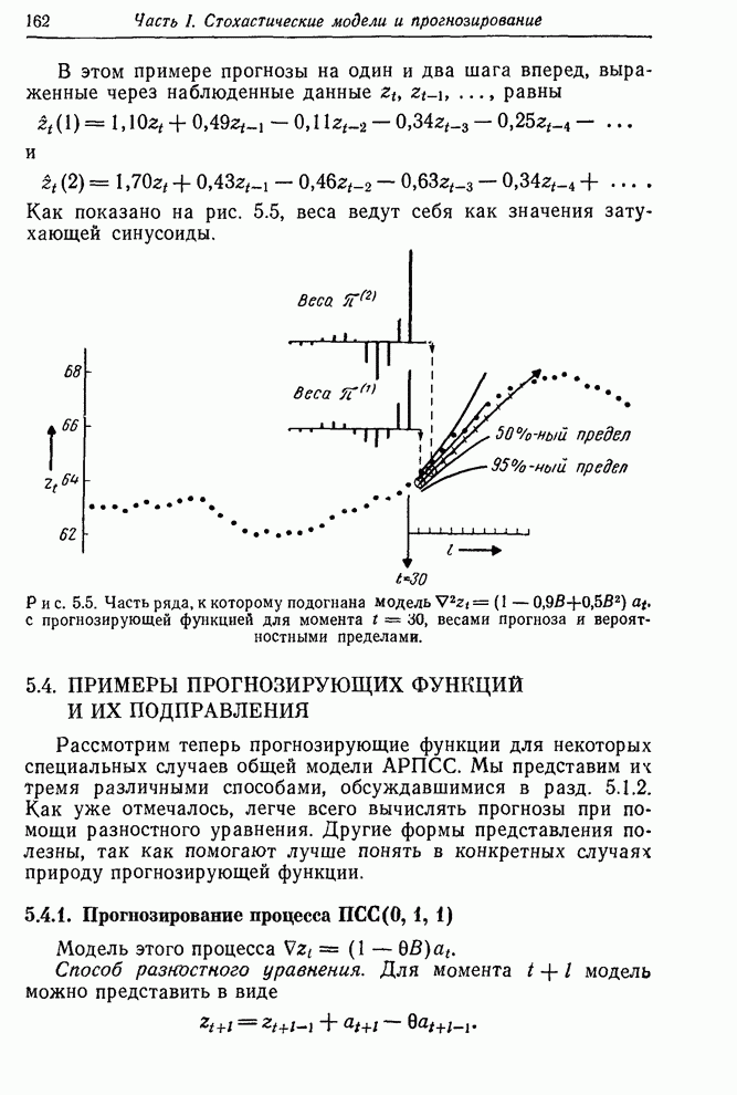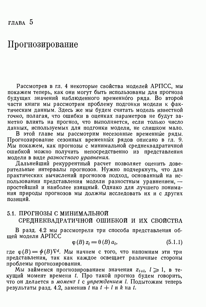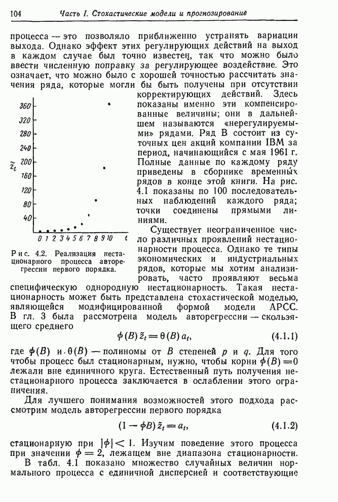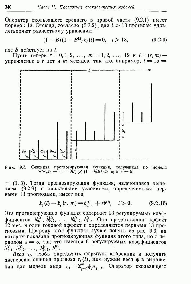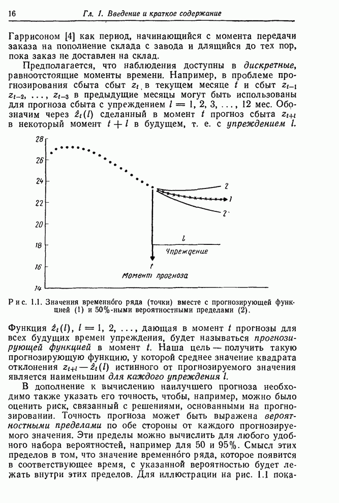 Рисунок 9 2 Ряд Прогнозирующая функция, ее коррекция и дисперсия ошибки прогноза. Как говорилось в гл. 5, способ разностного уравнения наиболее прост и удобен для фактического вычисления и коррекции прогнозов. Однако само разностное уравнение не объясняет в достаточной степени природу вычисляемых с его помощью прогнозов и характер коррекции. Чтобы оценить эти аспекты (а не предложить еще одну вычислительную процедуру), рассмотрим теперь прогнозирование с других точек зрения. Прогнозирующая функция. Используя (5.1.12), получаем