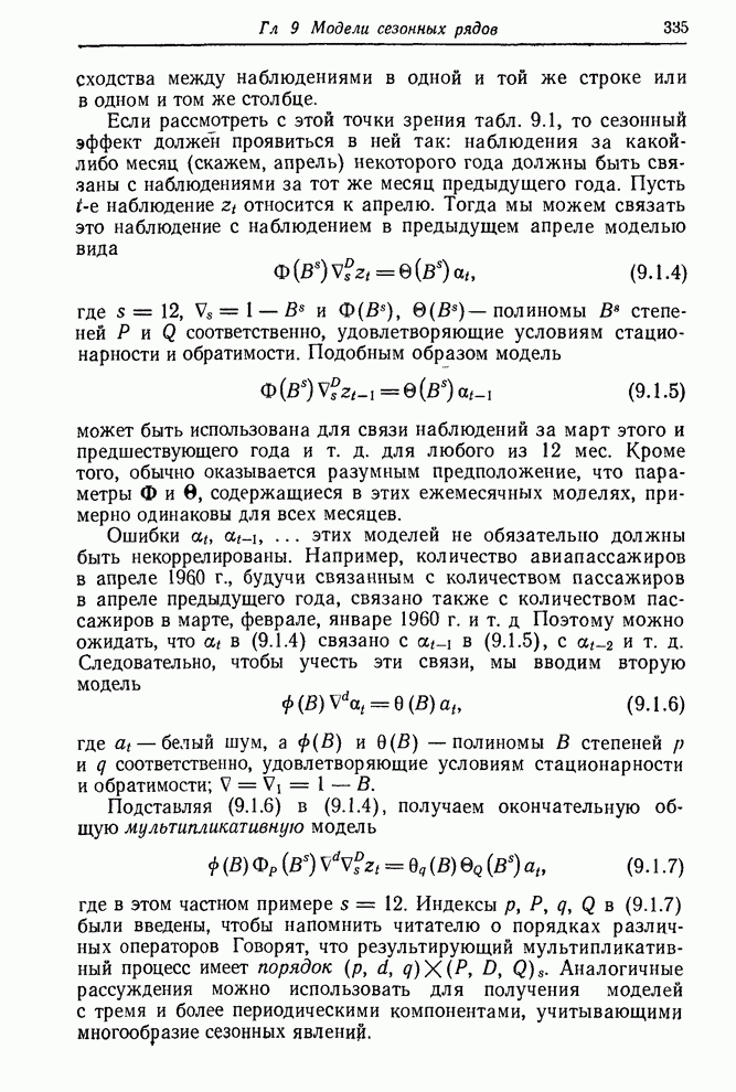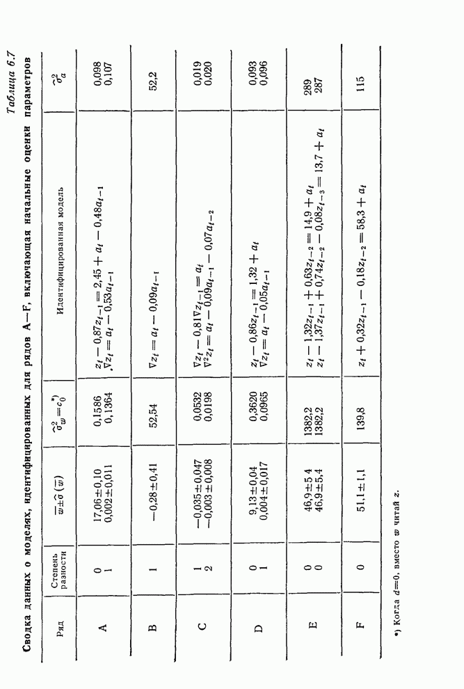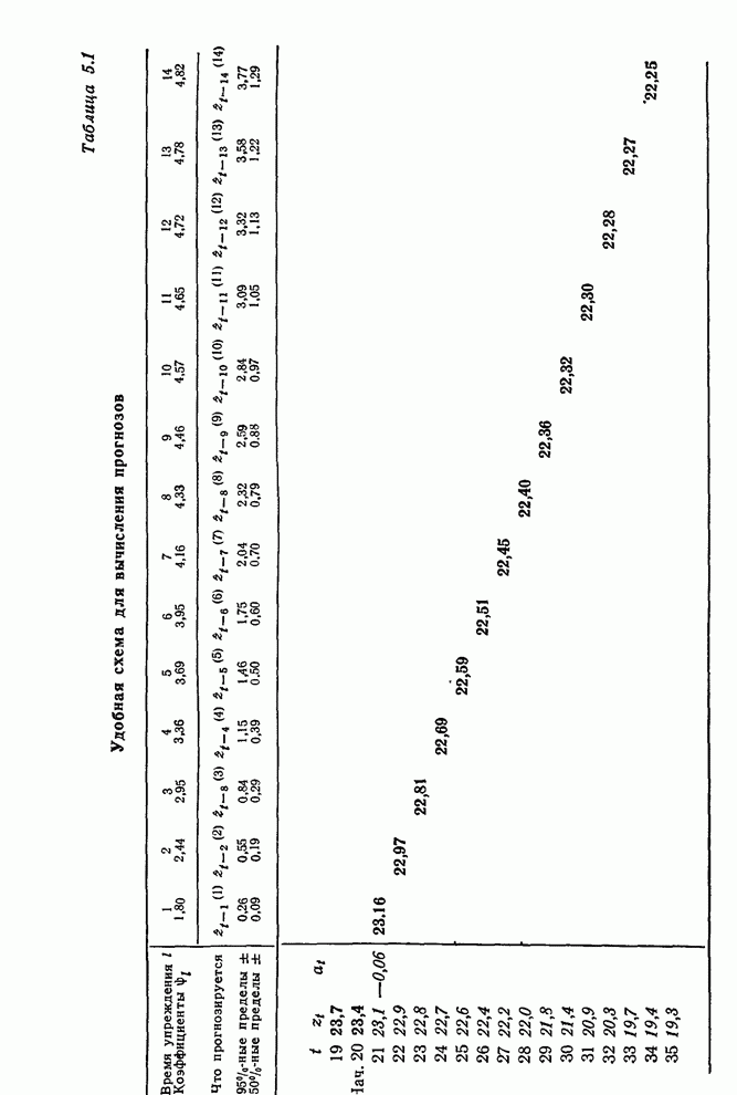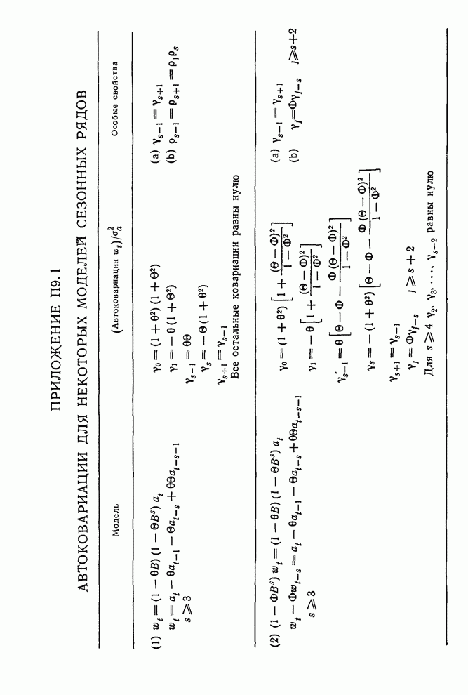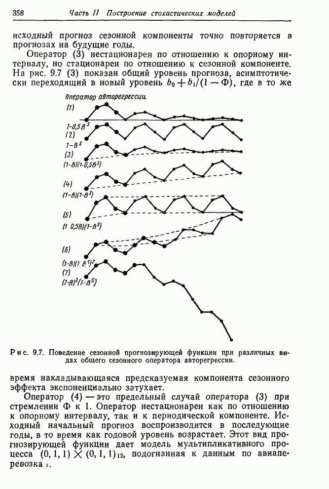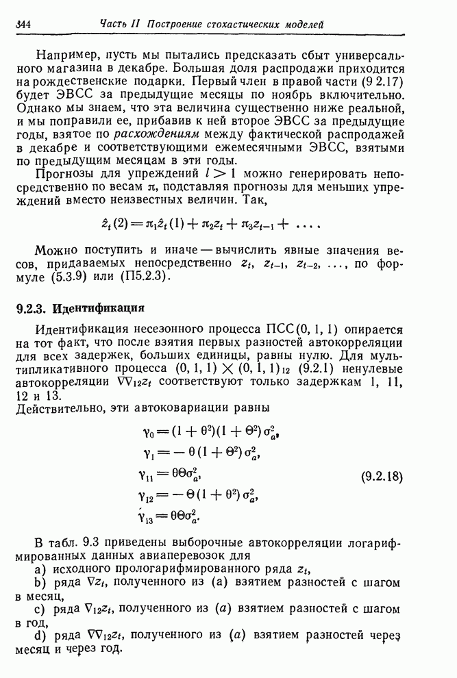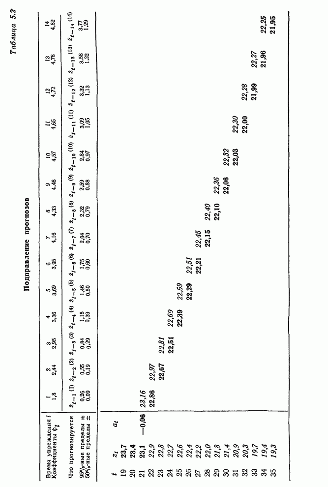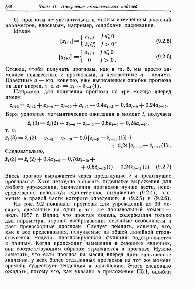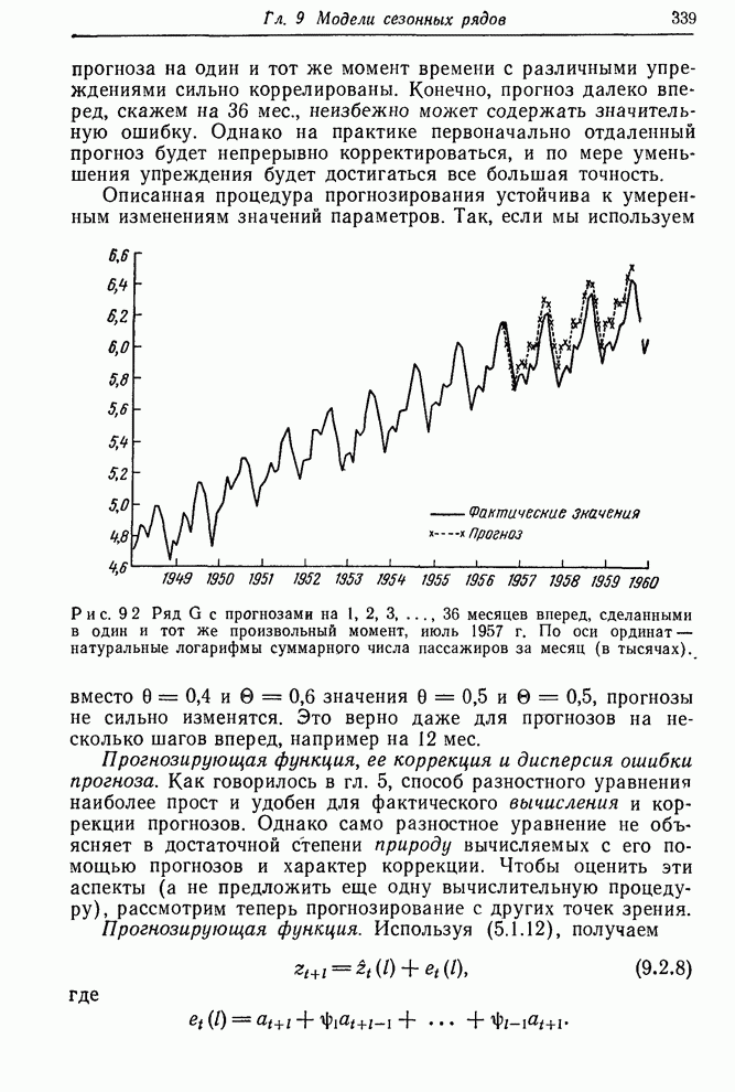 предыдущие На рис. 9.2 показаны прогнозы для упреждений до 36 месяцев, сделанные на один и тот же произвольный момент — июль 1957 г. Видно, что простая модель, содержащая только два параметра, хорошо воспроизводит сезонные особенности и дает превосходные прогнозы. Следует помнить, конечно, что, как и все предсказания, получаемые из общей линейной стохастической модели, прогнозирующая функция подстраивается к данным. Когда происходят изменения в сезонных явлениях, они соответствующим образом отражаются в прогнозе. Нужно заметить, что если прогноз на месяц вперед дает завышенное значение, у всех более отдаленных прогнозов на тот же момент времени существует тенденция к завышению. Этого следовало ожидать, потому что, как указано в приложении П5.1, ошибки прогноза на один и тот же момент времени с различными упреждениями сильно коррелированы. Конечно, прогноз далеко вперед, скажем на 36 мес, неизбежно может содержать значительную ошибку. Однако на практике первоначально отдаленный прогноз будет непрерывно корректироваться, и по мере уменьшения упреждения будет достигаться все большая точность. Описанная