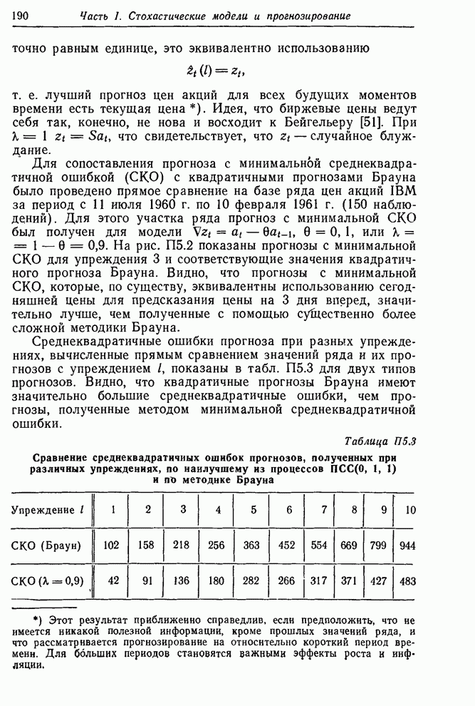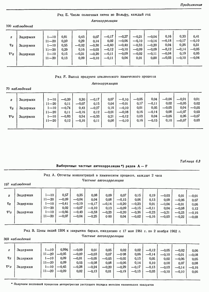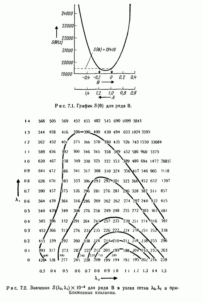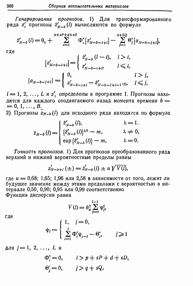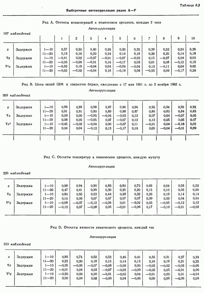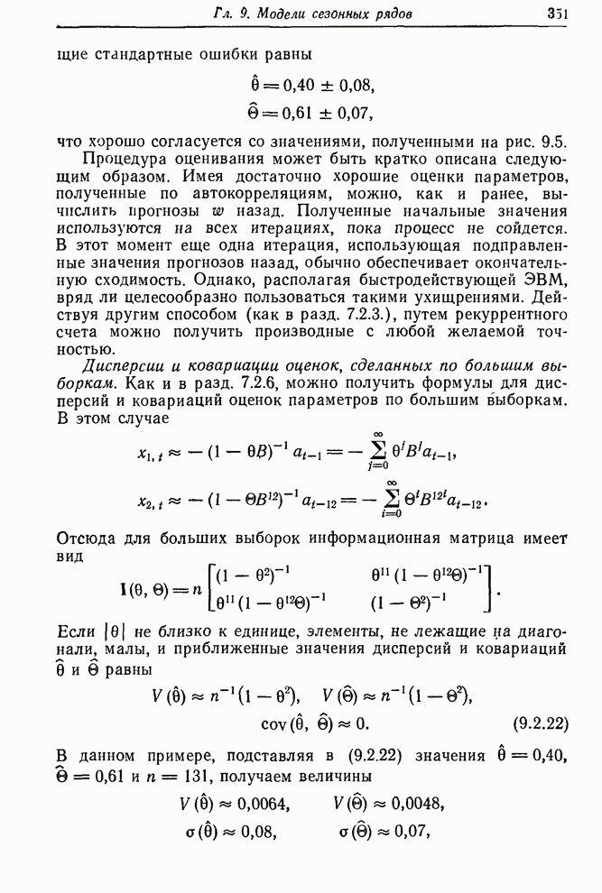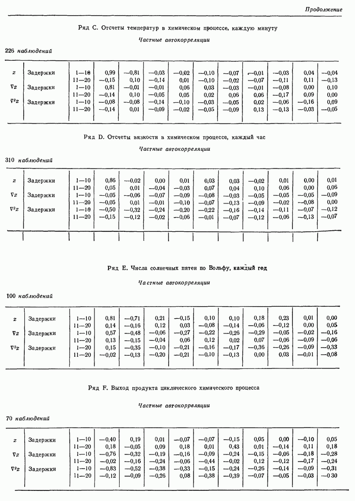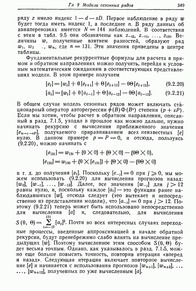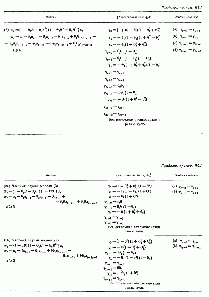 предыдущие На рис. 9.2 показаны прогнозы для упреждений до 36 месяцев, сделанные на один и тот же произвольный момент — июль 1957 г. Видно, что простая модель, содержащая только два параметра, хорошо воспроизводит сезонные особенности и дает превосходные прогнозы. Следует помнить, конечно, что, как и все предсказания, получаемые из общей линейной стохастической модели, прогнозирующая функция подстраивается к данным. Когда происходят изменения в сезонных явлениях, они соответствующим образом отражаются в прогнозе. Нужно заметить, что если прогноз на месяц вперед дает завышенное значение, у всех более отдаленных прогнозов на тот же момент времени существует тенденция к завышению. Этого следовало ожидать, потому что, как указано в приложении П5.1, ошибки прогноза на один и тот же момент времени с различными упреждениями сильно коррелированы. Конечно, прогноз далеко вперед, скажем на 36 мес, неизбежно может содержать значительную ошибку. Однако на практике первоначально отдаленный прогноз будет непрерывно корректироваться, и по мере уменьшения упреждения будет достигаться все большая точность. Описанная