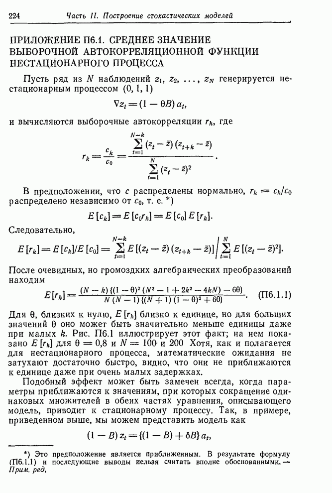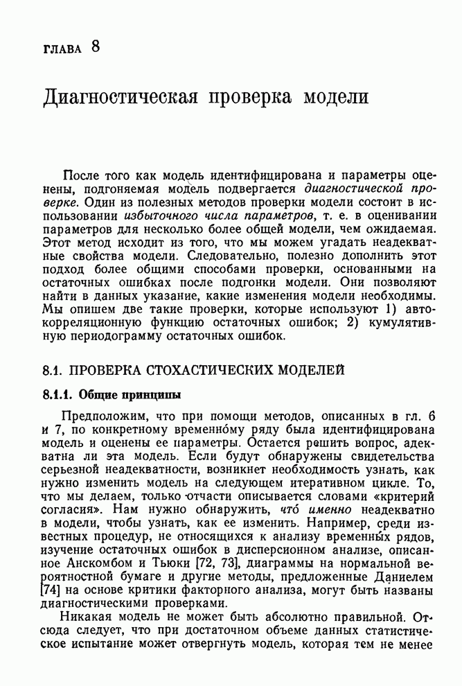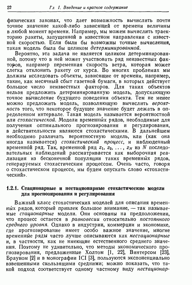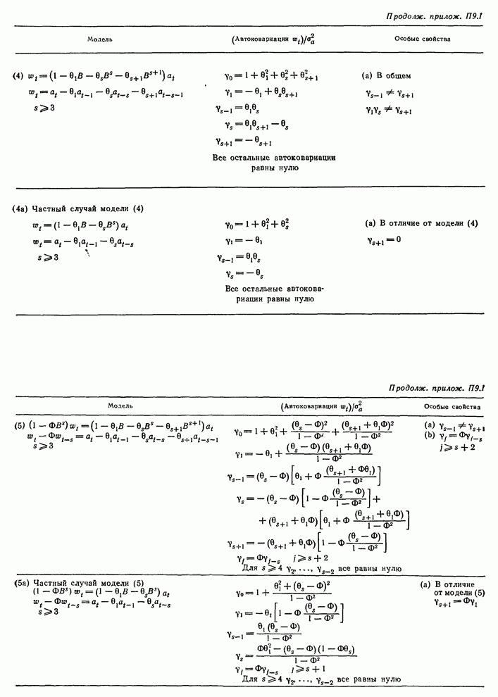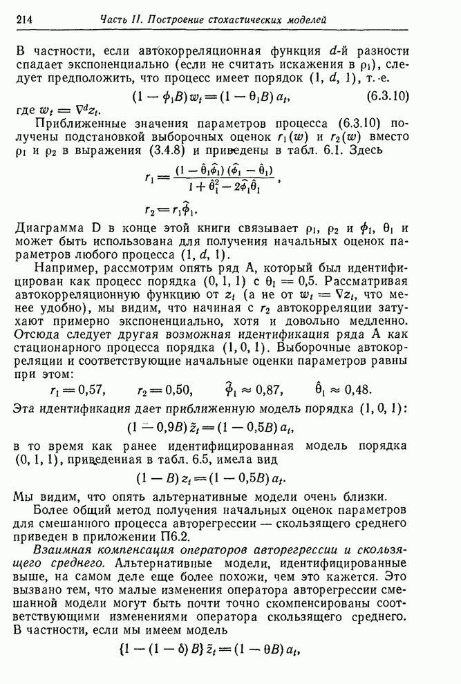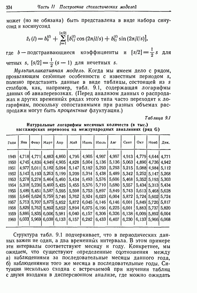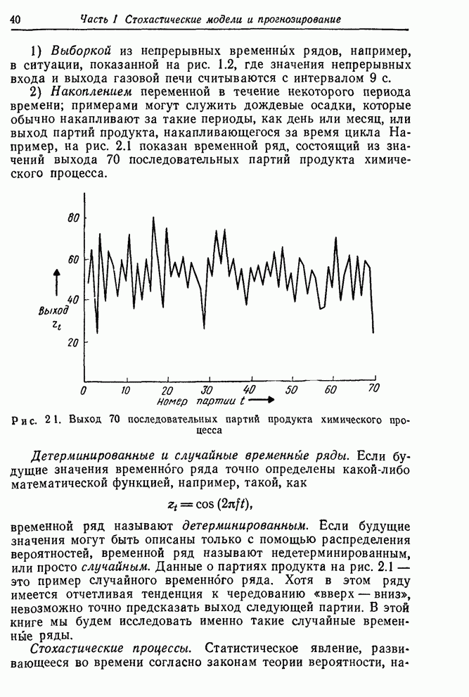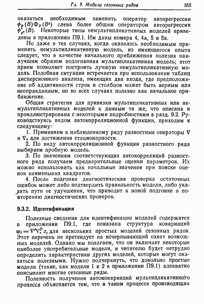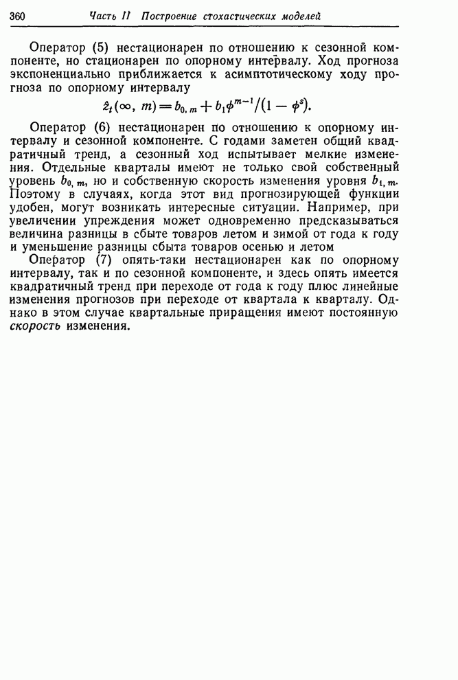 предыдущие На рис. 9.2 показаны прогнозы для упреждений до 36 месяцев, сделанные на один и тот же произвольный момент — июль 1957 г. Видно, что простая модель, содержащая только два параметра, хорошо воспроизводит сезонные особенности и дает превосходные прогнозы. Следует помнить, конечно, что, как и все предсказания, получаемые из общей линейной стохастической модели, прогнозирующая функция подстраивается к данным. Когда происходят изменения в сезонных явлениях, они соответствующим образом отражаются в прогнозе. Нужно заметить, что если прогноз на месяц вперед дает завышенное значение, у всех более отдаленных прогнозов на тот же момент времени существует тенденция к завышению. Этого следовало ожидать, потому что, как указано в приложении П5.1, ошибки прогноза на один и тот же момент времени с различными упреждениями сильно коррелированы. Конечно, прогноз далеко вперед, скажем на 36 мес, неизбежно может содержать значительную ошибку. Однако на практике первоначально отдаленный прогноз будет непрерывно корректироваться, и по мере уменьшения упреждения будет достигаться все большая точность. Описанная
