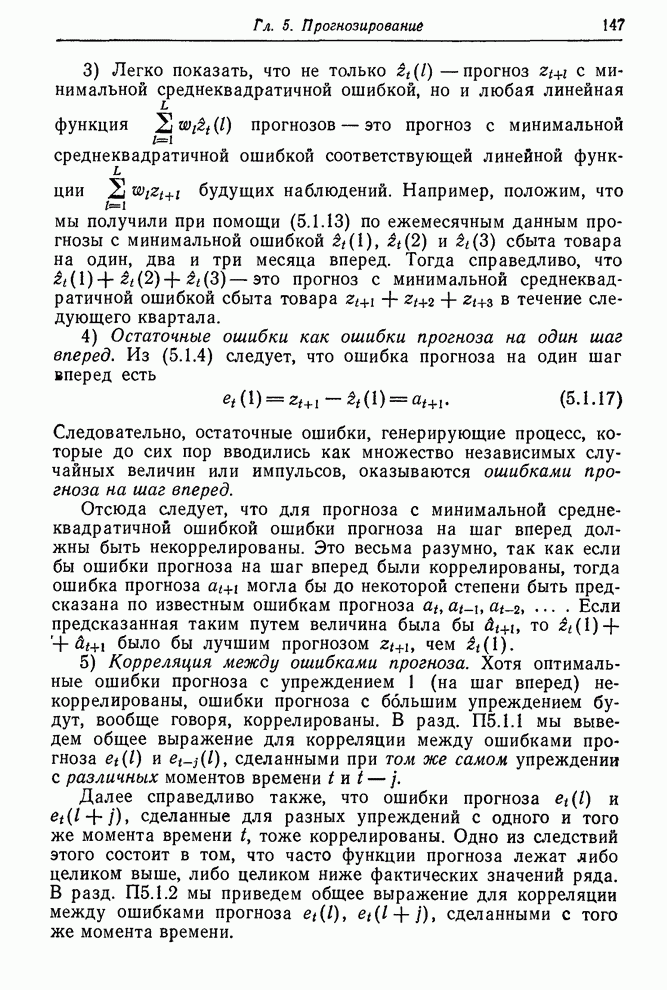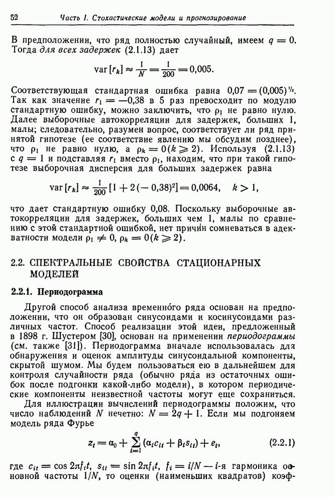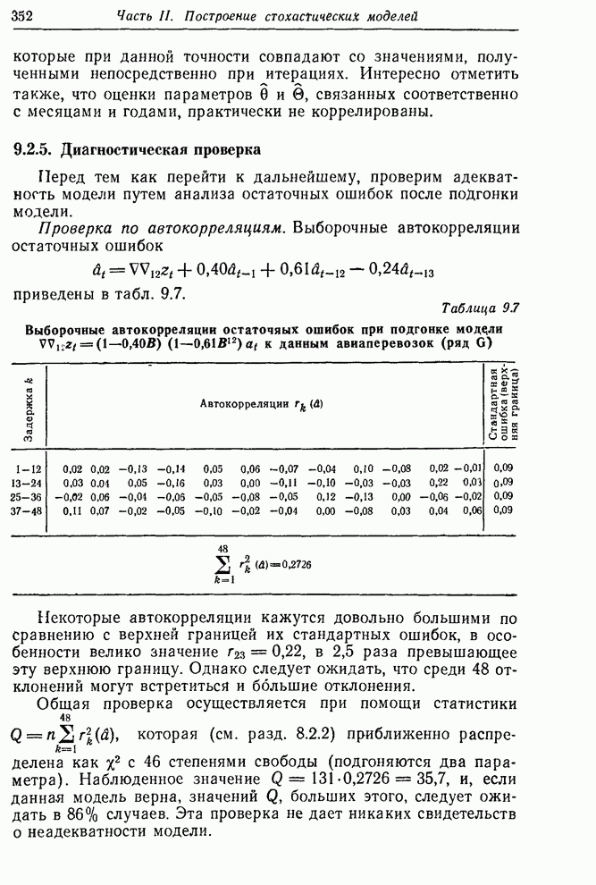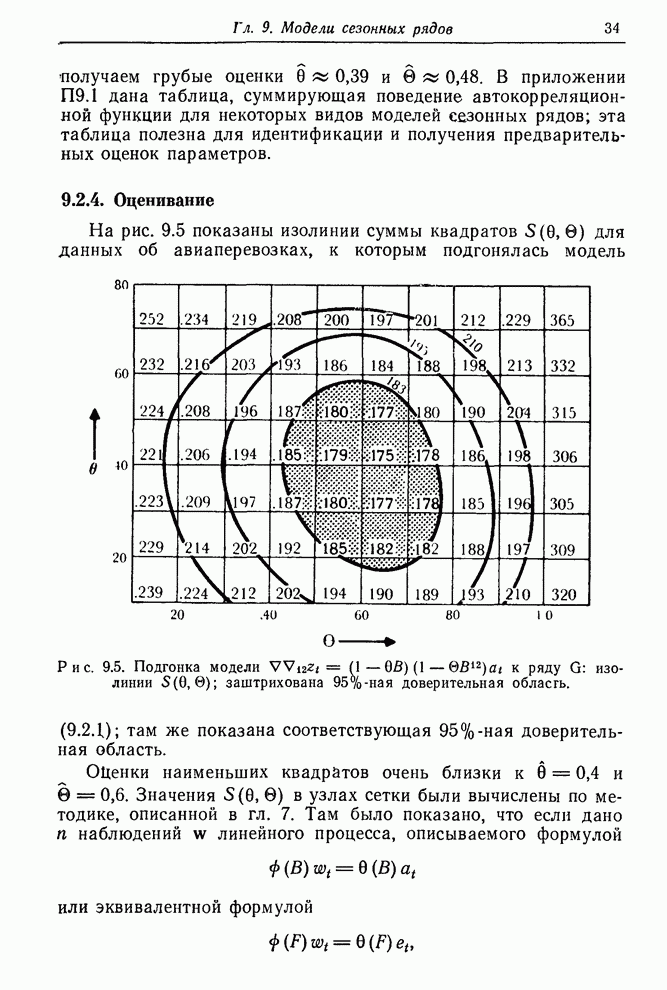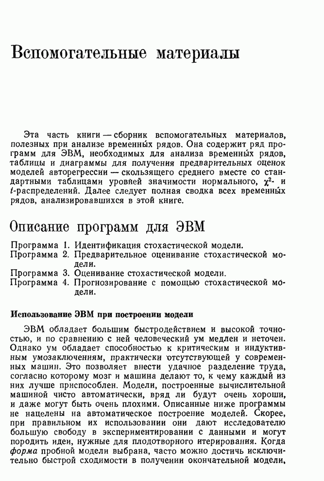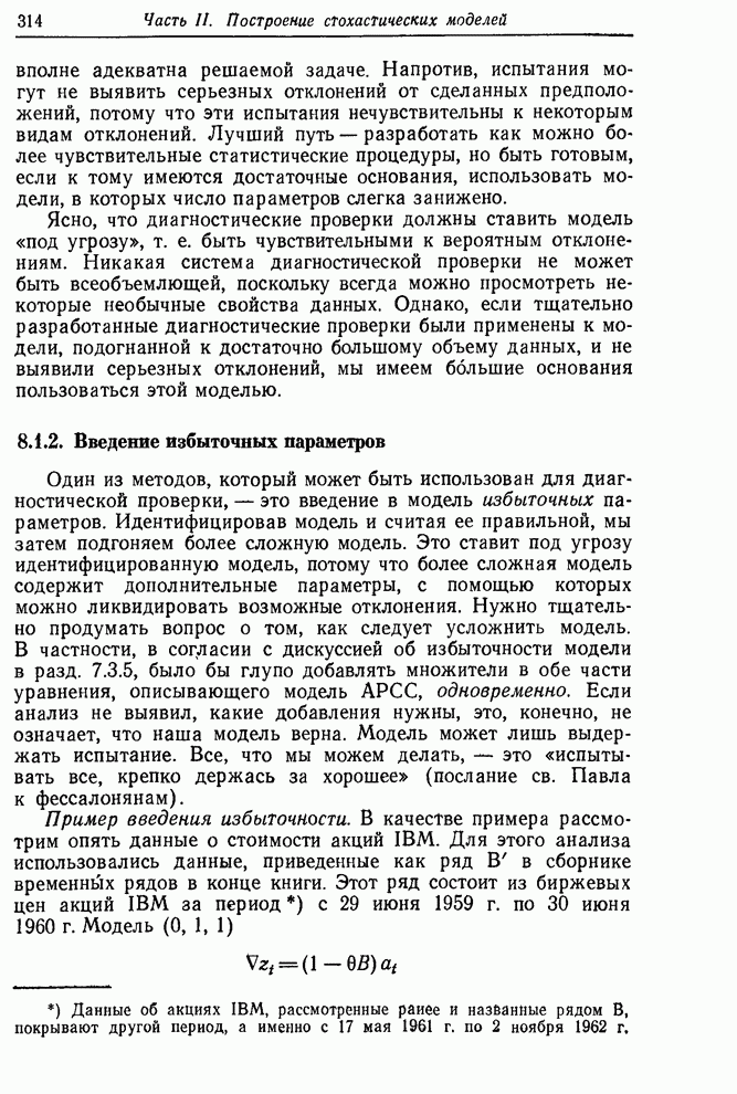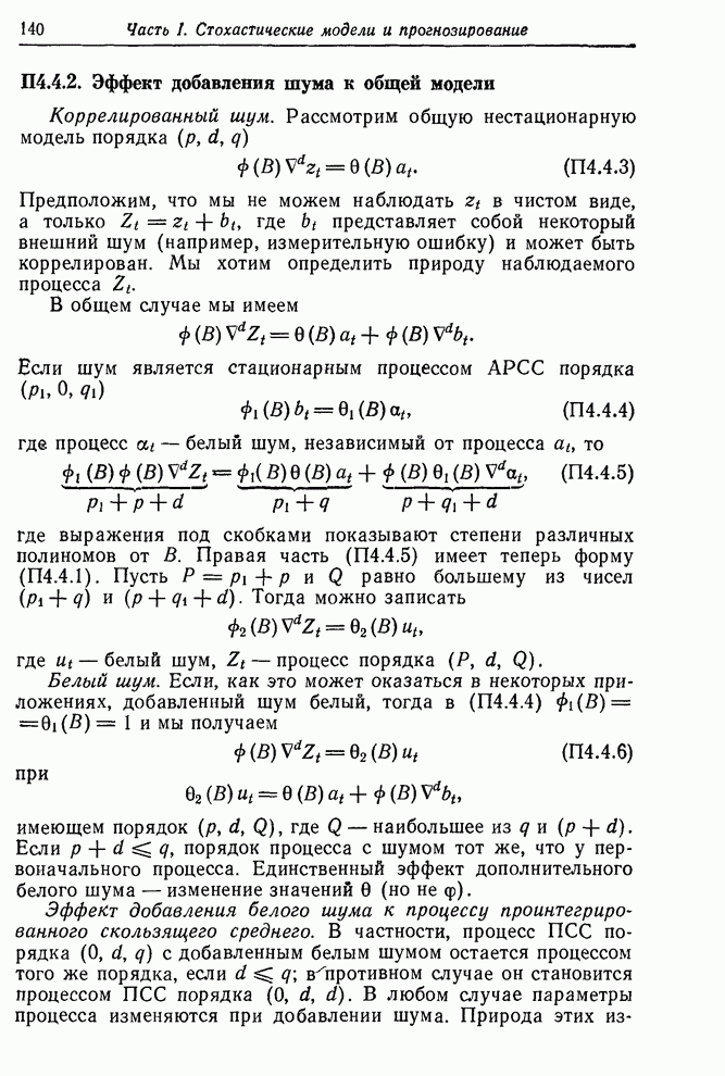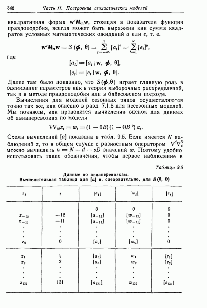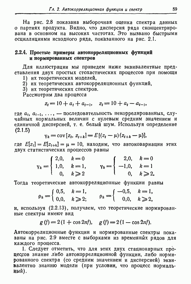 предыдущие На рис. 9.2 показаны прогнозы для упреждений до 36 месяцев, сделанные на один и тот же произвольный момент — июль 1957 г. Видно, что простая модель, содержащая только два параметра, хорошо воспроизводит сезонные особенности и дает превосходные прогнозы. Следует помнить, конечно, что, как и все предсказания, получаемые из общей линейной стохастической модели, прогнозирующая функция подстраивается к данным. Когда происходят изменения в сезонных явлениях, они соответствующим образом отражаются в прогнозе. Нужно заметить, что если прогноз на месяц вперед дает завышенное значение, у всех более отдаленных прогнозов на тот же момент времени существует тенденция к завышению. Этого следовало ожидать, потому что, как указано в приложении П5.1, ошибки прогноза на один и тот же момент времени с различными упреждениями сильно коррелированы. Конечно, прогноз далеко вперед, скажем на 36 мес, неизбежно может содержать значительную ошибку. Однако на практике первоначально отдаленный прогноз будет непрерывно корректироваться, и по мере уменьшения упреждения будет достигаться все большая точность. Описанная