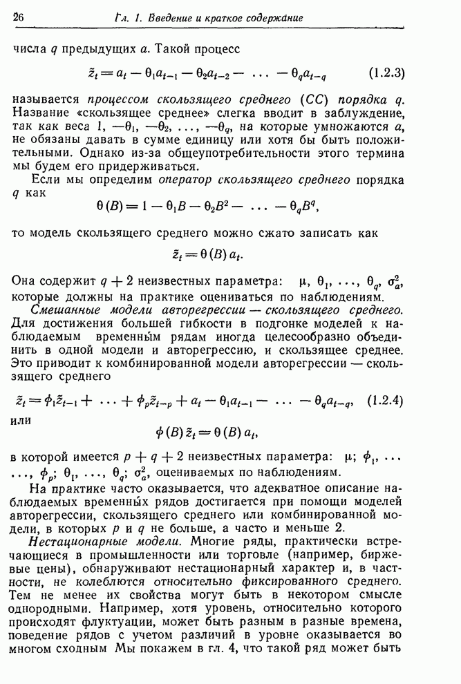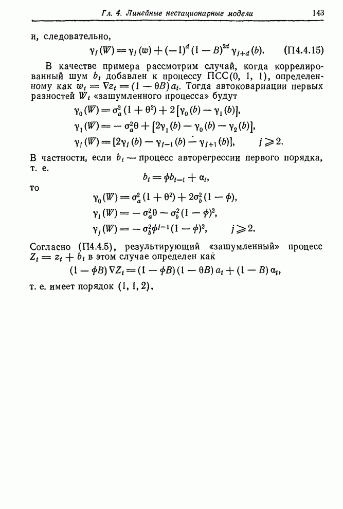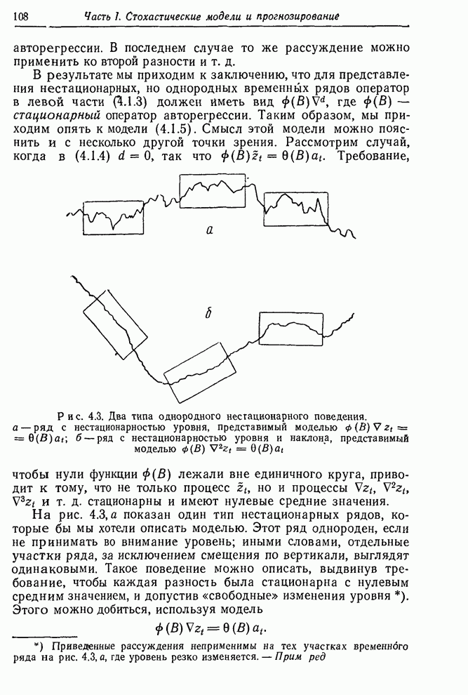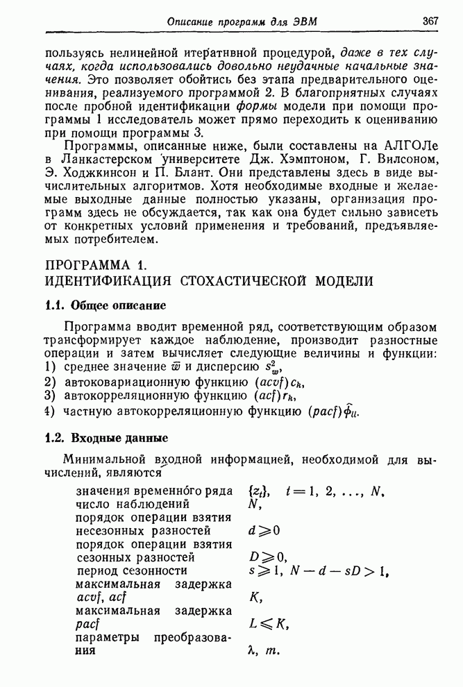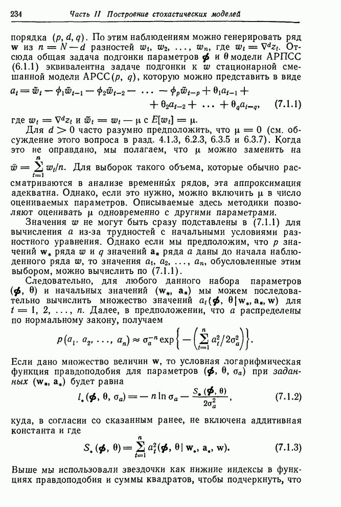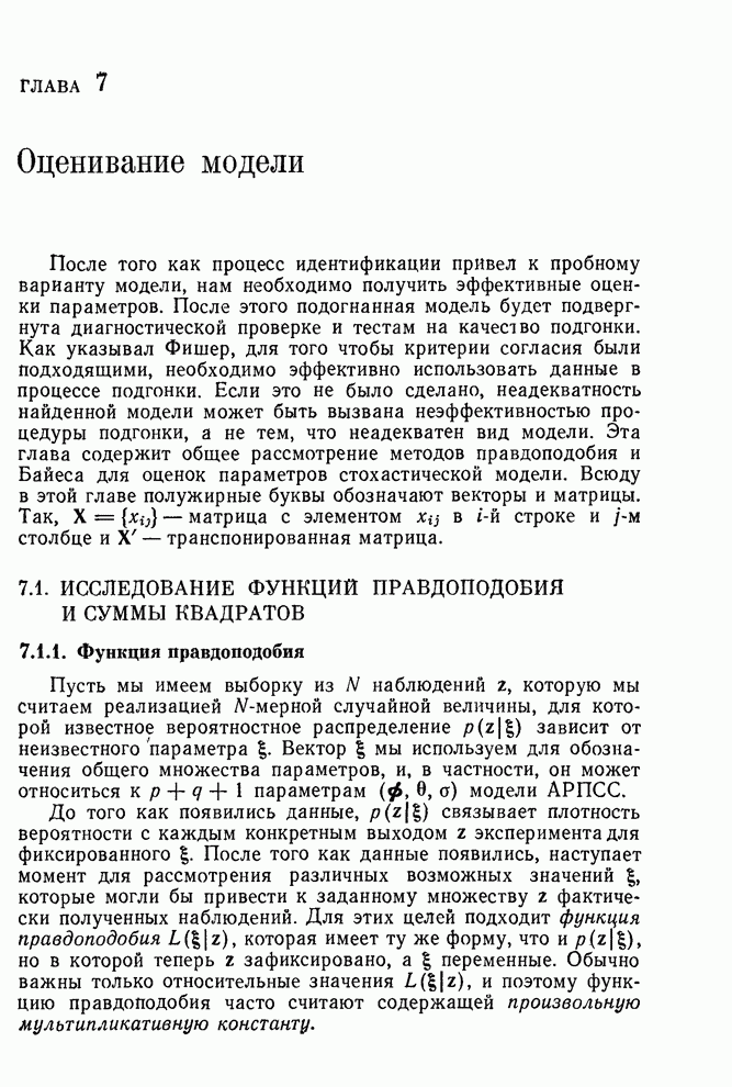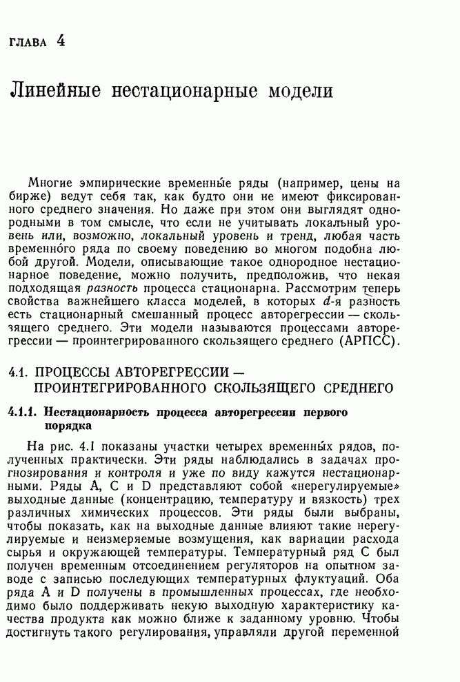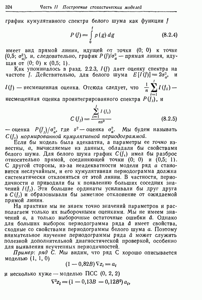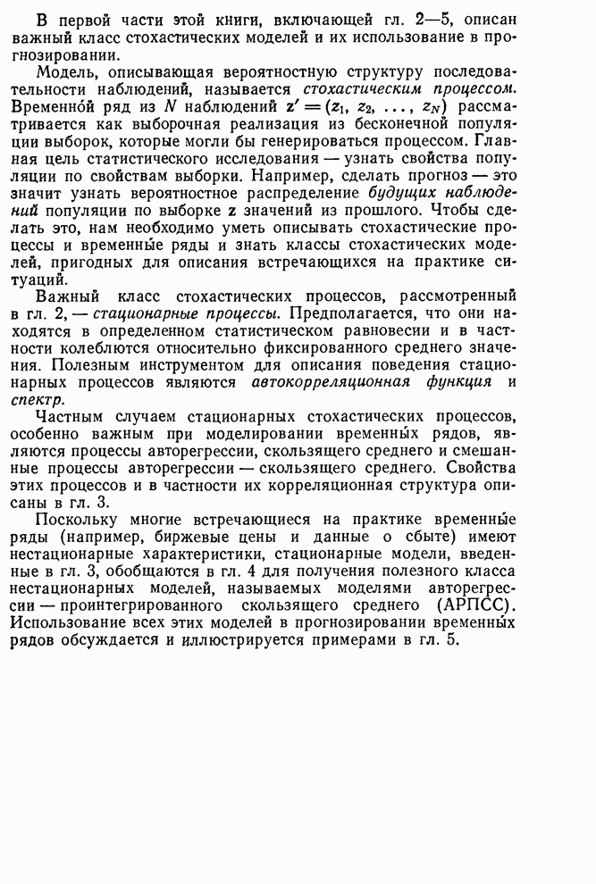предыдущие На рис. 9.2 показаны прогнозы для упреждений до 36 месяцев, сделанные на один и тот же произвольный момент — июль 1957 г. Видно, что простая модель, содержащая только два параметра, хорошо воспроизводит сезонные особенности и дает превосходные прогнозы. Следует помнить, конечно, что, как и все предсказания, получаемые из общей линейной стохастической модели, прогнозирующая функция подстраивается к данным. Когда происходят изменения в сезонных явлениях, они соответствующим образом отражаются в прогнозе. Нужно заметить, что если прогноз на месяц вперед дает завышенное значение, у всех более отдаленных прогнозов на тот же момент времени существует тенденция к завышению. Этого следовало ожидать, потому что, как указано в приложении П5.1, ошибки прогноза на один и тот же момент времени с различными упреждениями сильно коррелированы. Конечно, прогноз далеко вперед, скажем на 36 мес, неизбежно может содержать значительную ошибку. Однако на практике первоначально отдаленный прогноз будет непрерывно корректироваться, и по мере уменьшения упреждения будет достигаться все большая точность. Описанная