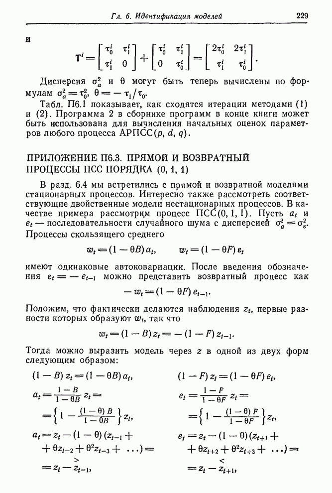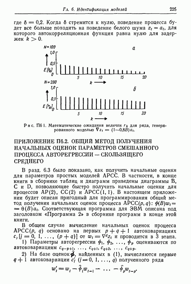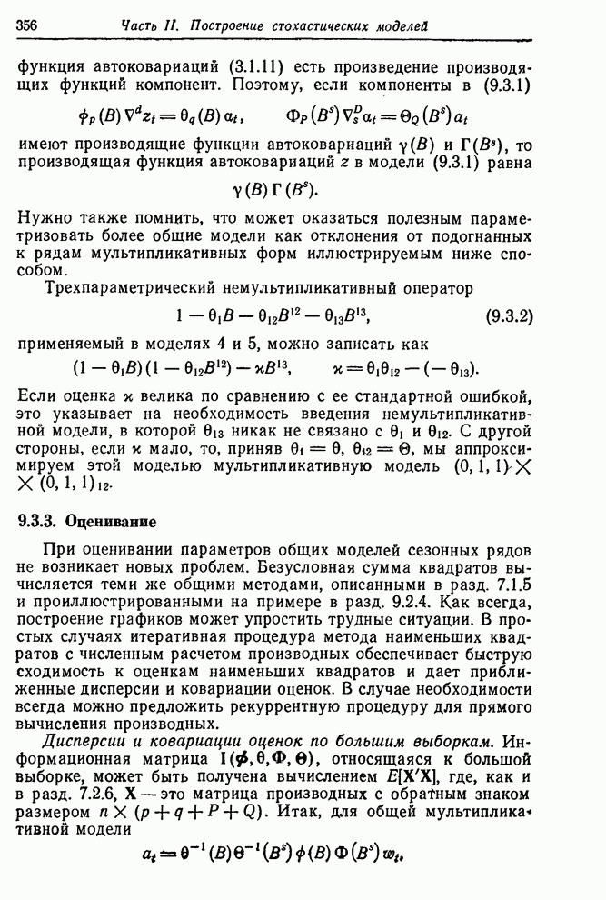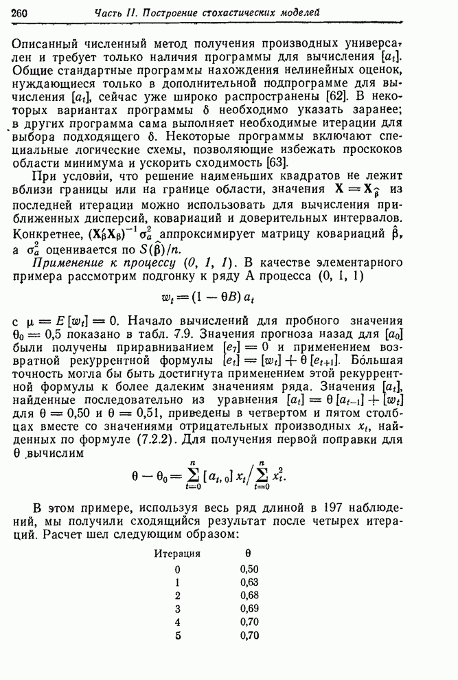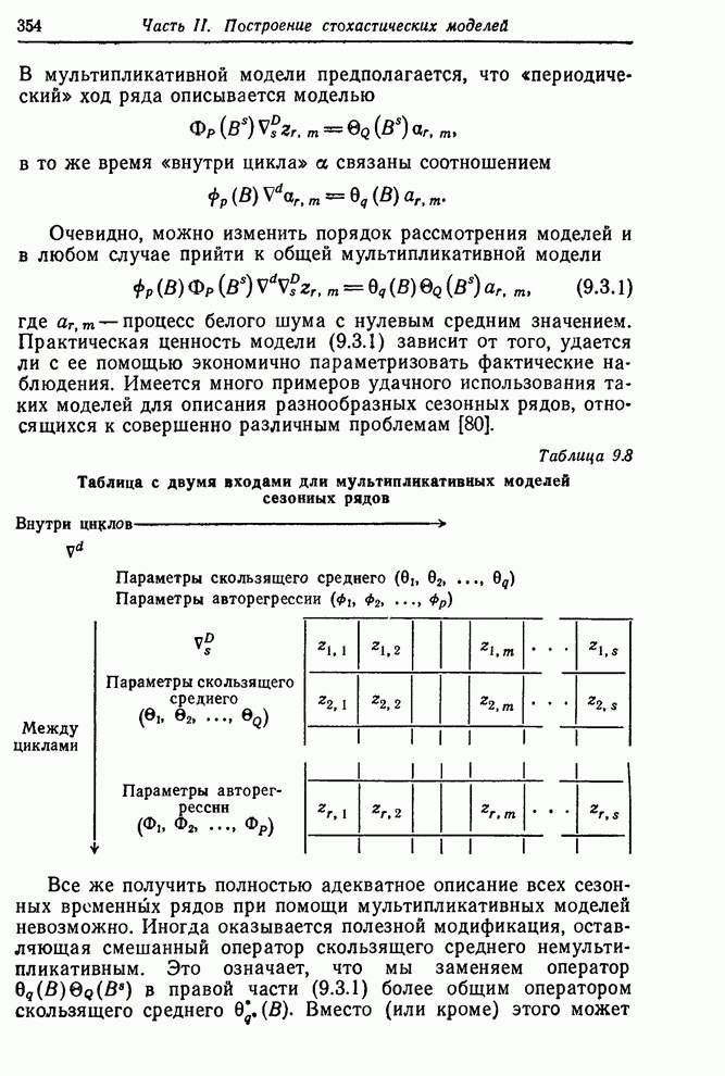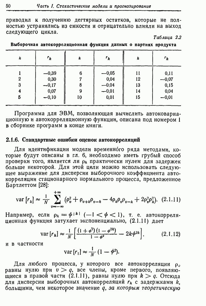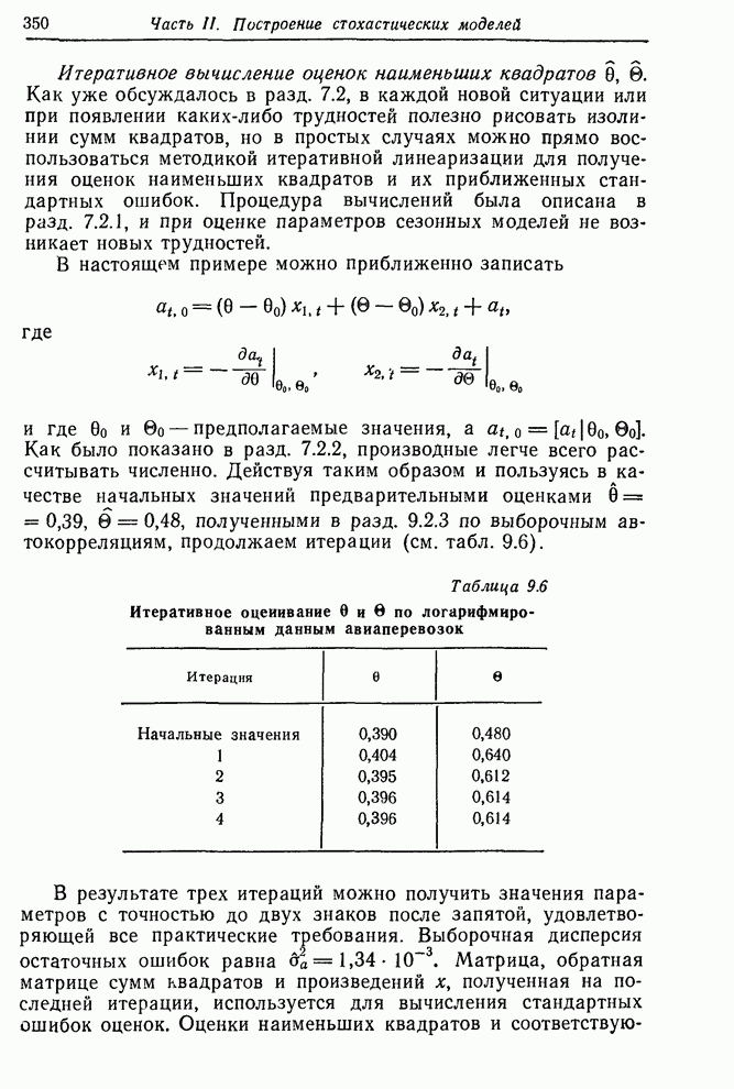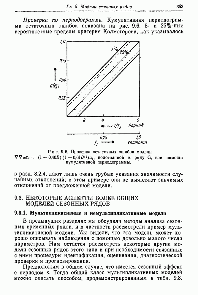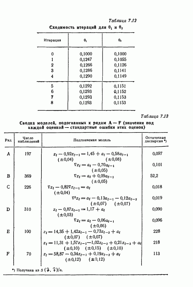 предыдущие На рис. 9.2 показаны прогнозы для упреждений до 36 месяцев, сделанные на один и тот же произвольный момент — июль 1957 г. Видно, что простая модель, содержащая только два параметра, хорошо воспроизводит сезонные особенности и дает превосходные прогнозы. Следует помнить, конечно, что, как и все предсказания, получаемые из общей линейной стохастической модели, прогнозирующая функция подстраивается к данным. Когда происходят изменения в сезонных явлениях, они соответствующим образом отражаются в прогнозе. Нужно заметить, что если прогноз на месяц вперед дает завышенное значение, у всех более отдаленных прогнозов на тот же момент времени существует тенденция к завышению. Этого следовало ожидать, потому что, как указано в приложении П5.1, ошибки прогноза на один и тот же момент времени с различными упреждениями сильно коррелированы. Конечно, прогноз далеко вперед, скажем на 36 мес, неизбежно может содержать значительную ошибку. Однако на практике первоначально отдаленный прогноз будет непрерывно корректироваться, и по мере уменьшения упреждения будет достигаться все большая точность. Описанная