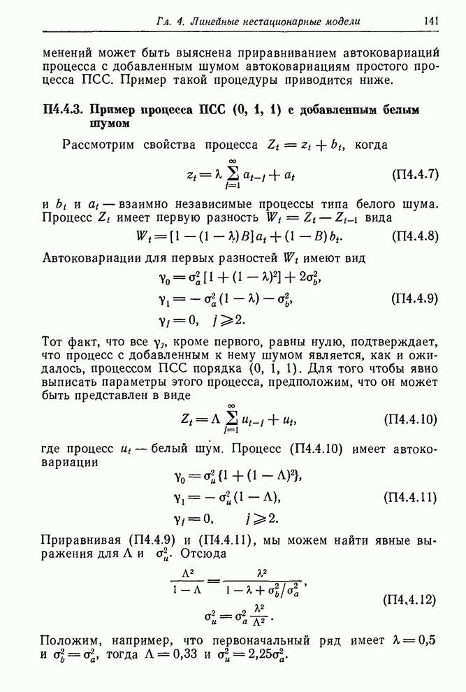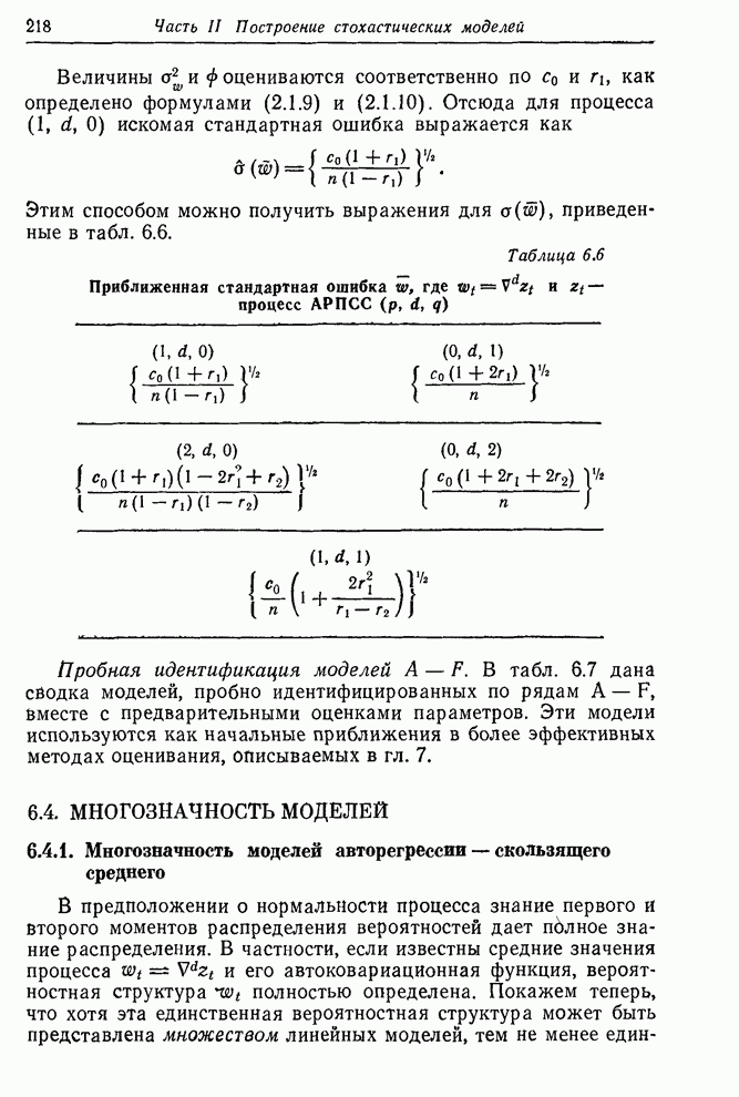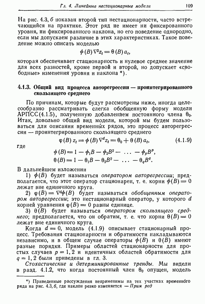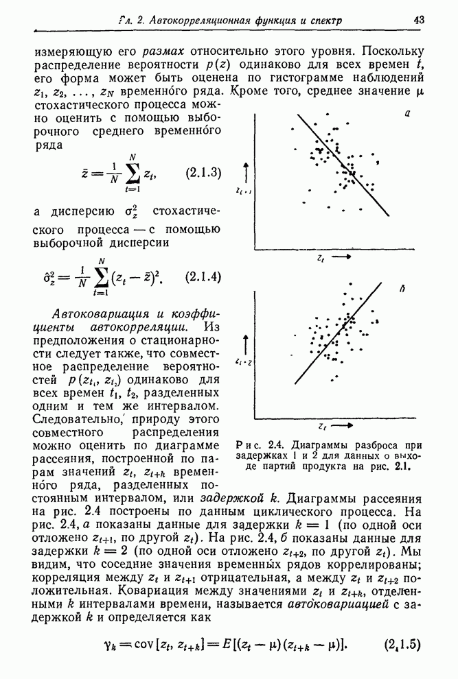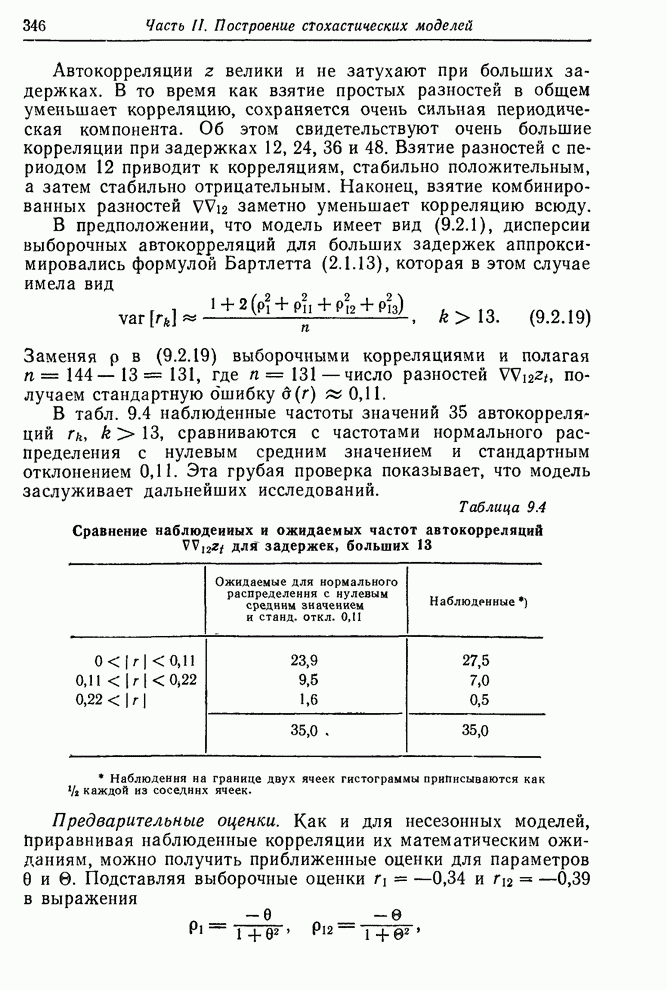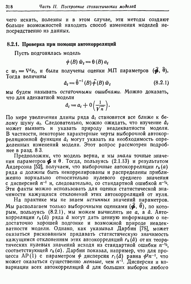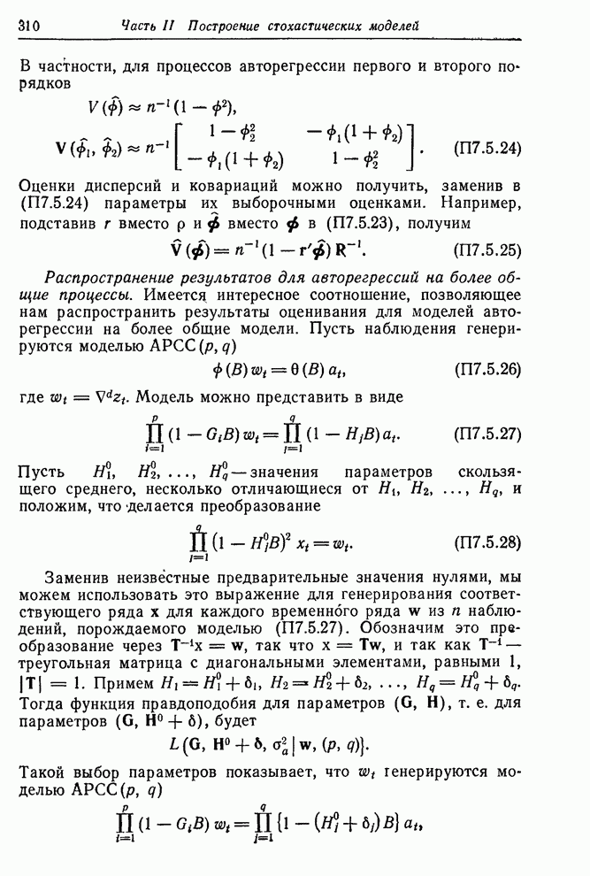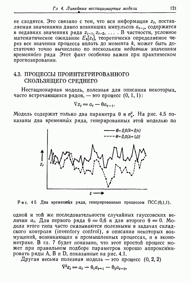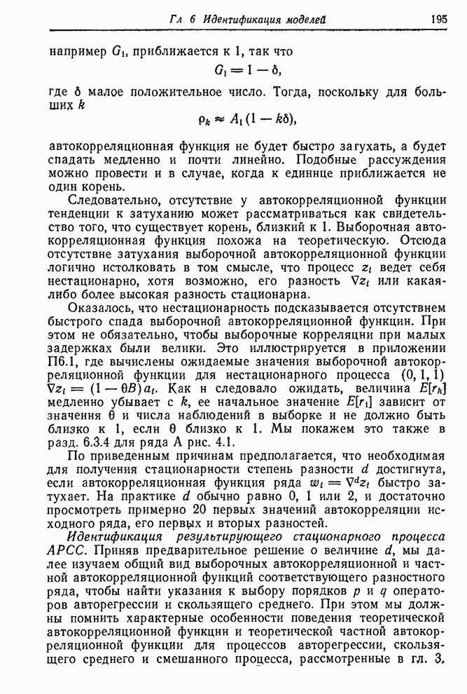 предыдущие На рис. 9.2 показаны прогнозы для упреждений до 36 месяцев, сделанные на один и тот же произвольный момент — июль 1957 г. Видно, что простая модель, содержащая только два параметра, хорошо воспроизводит сезонные особенности и дает превосходные прогнозы. Следует помнить, конечно, что, как и все предсказания, получаемые из общей линейной стохастической модели, прогнозирующая функция подстраивается к данным. Когда происходят изменения в сезонных явлениях, они соответствующим образом отражаются в прогнозе. Нужно заметить, что если прогноз на месяц вперед дает завышенное значение, у всех более отдаленных прогнозов на тот же момент времени существует тенденция к завышению. Этого следовало ожидать, потому что, как указано в приложении П5.1, ошибки прогноза на один и тот же момент времени с различными упреждениями сильно коррелированы. Конечно, прогноз далеко вперед, скажем на 36 мес, неизбежно может содержать значительную ошибку. Однако на практике первоначально отдаленный прогноз будет непрерывно корректироваться, и по мере уменьшения упреждения будет достигаться все большая точность. Описанная