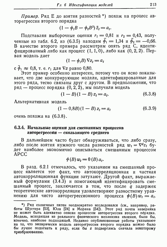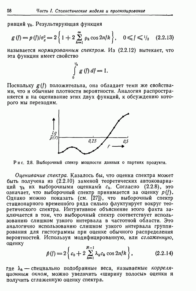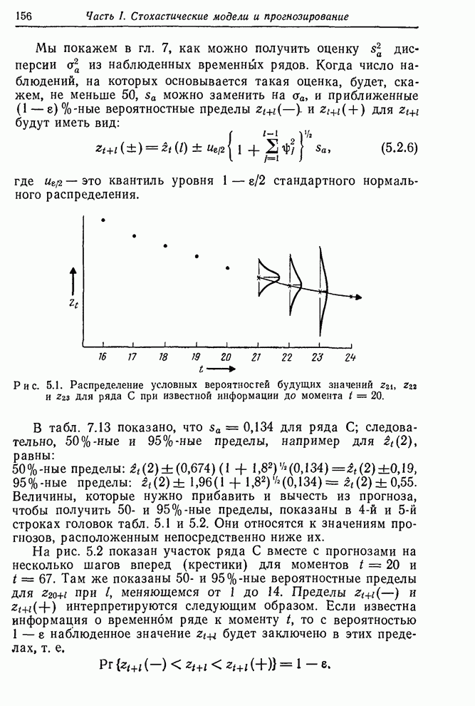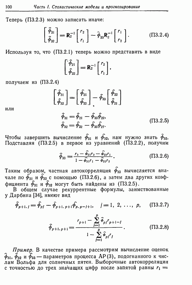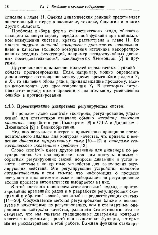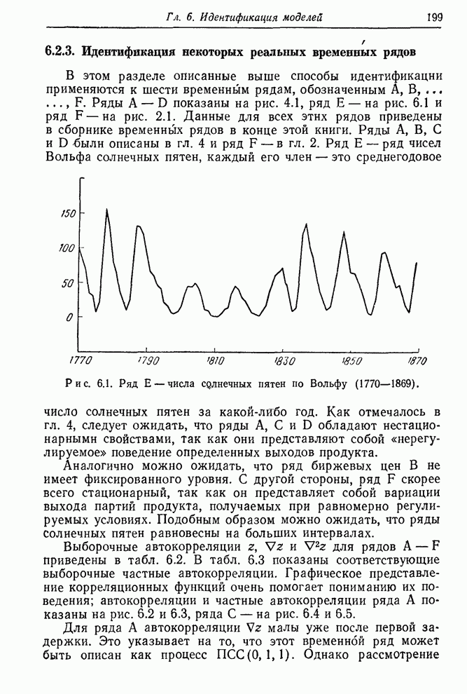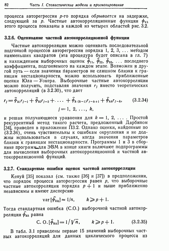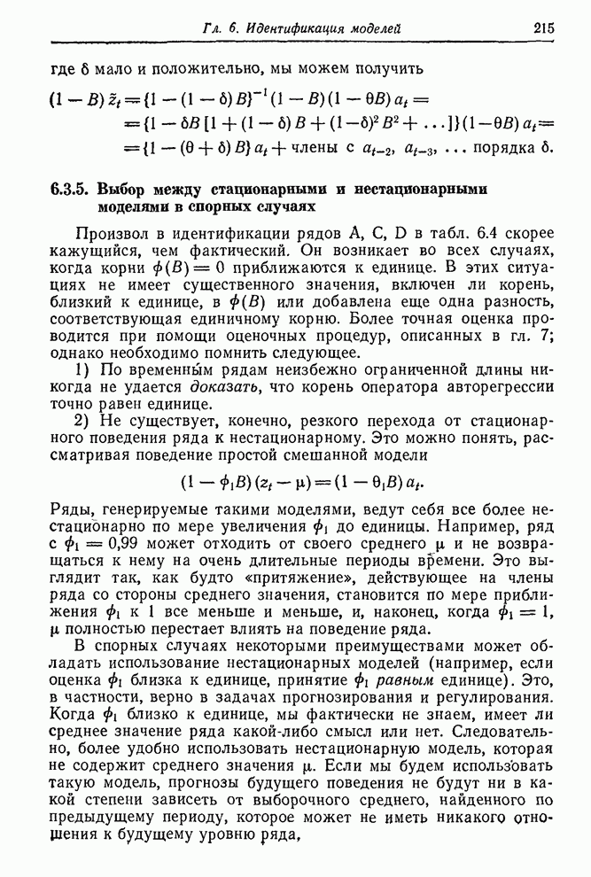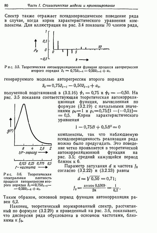 предыдущие На рис. 9.2 показаны прогнозы для упреждений до 36 месяцев, сделанные на один и тот же произвольный момент — июль 1957 г. Видно, что простая модель, содержащая только два параметра, хорошо воспроизводит сезонные особенности и дает превосходные прогнозы. Следует помнить, конечно, что, как и все предсказания, получаемые из общей линейной стохастической модели, прогнозирующая функция подстраивается к данным. Когда происходят изменения в сезонных явлениях, они соответствующим образом отражаются в прогнозе. Нужно заметить, что если прогноз на месяц вперед дает завышенное значение, у всех более отдаленных прогнозов на тот же момент времени существует тенденция к завышению. Этого следовало ожидать, потому что, как указано в приложении П5.1, ошибки прогноза на один и тот же момент времени с различными упреждениями сильно коррелированы. Конечно, прогноз далеко вперед, скажем на 36 мес, неизбежно может содержать значительную ошибку. Однако на практике первоначально отдаленный прогноз будет непрерывно корректироваться, и по мере уменьшения упреждения будет достигаться все большая точность. Описанная
