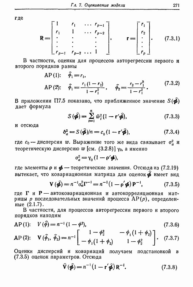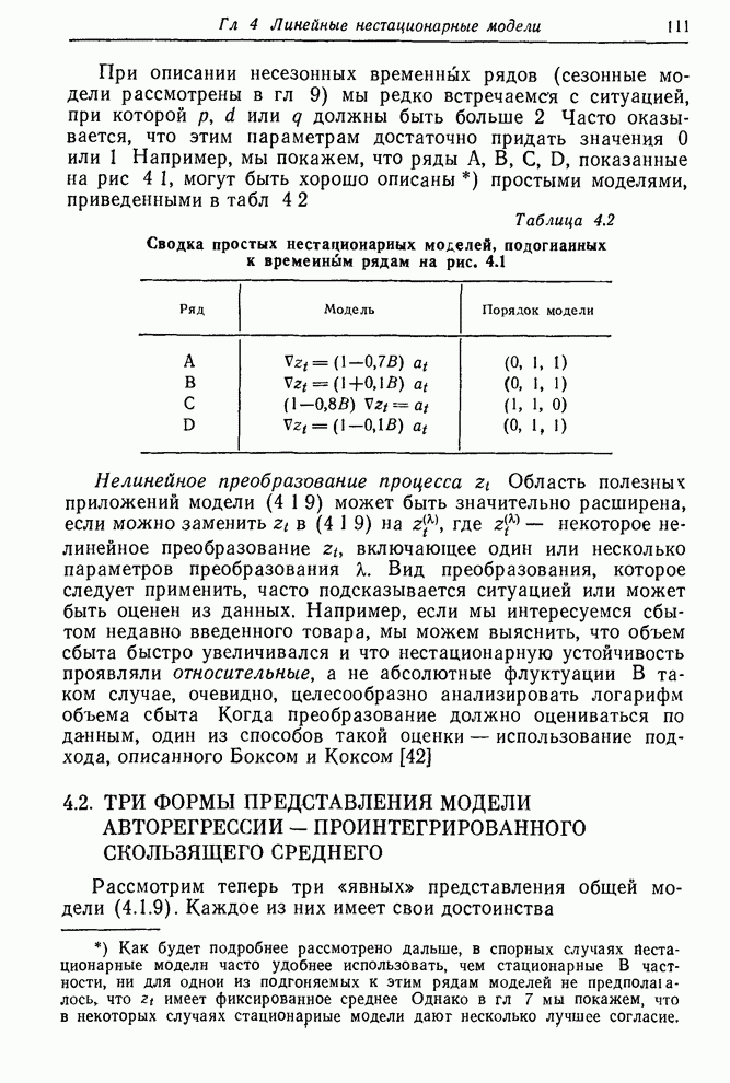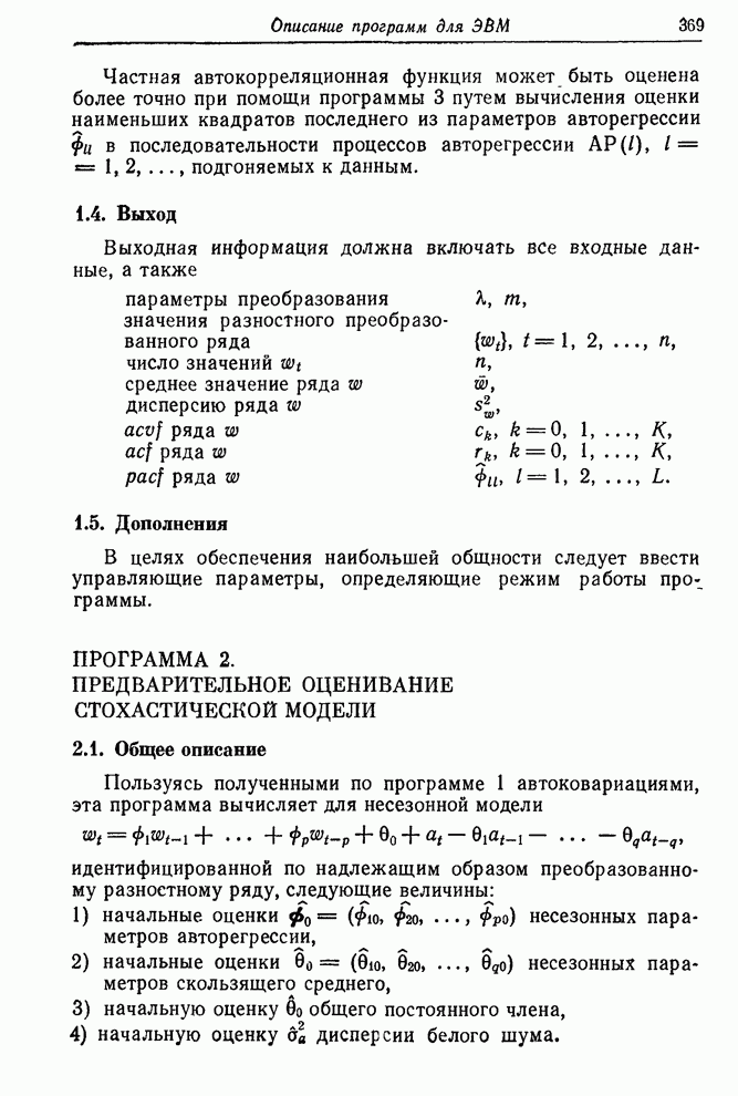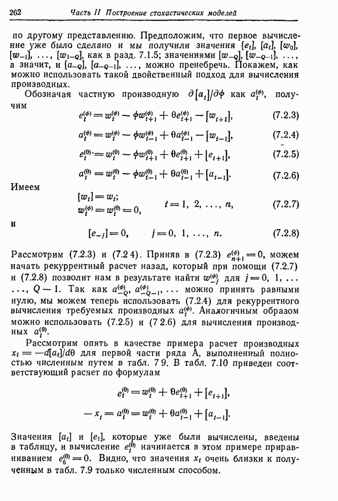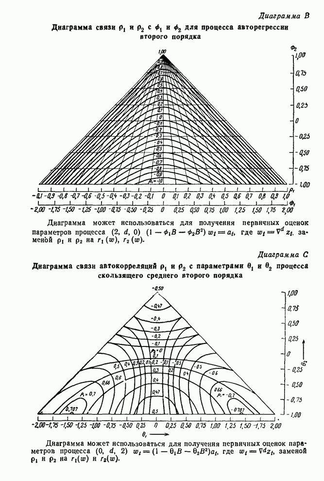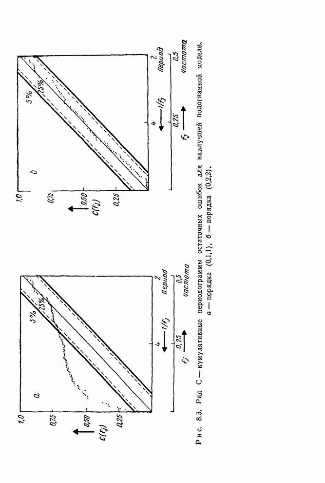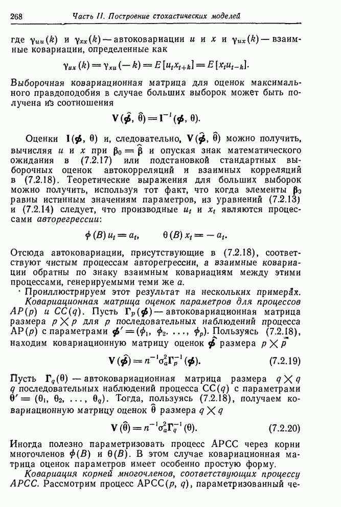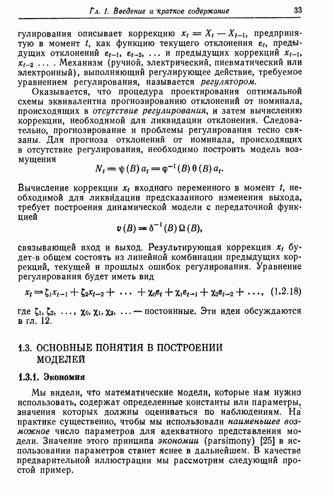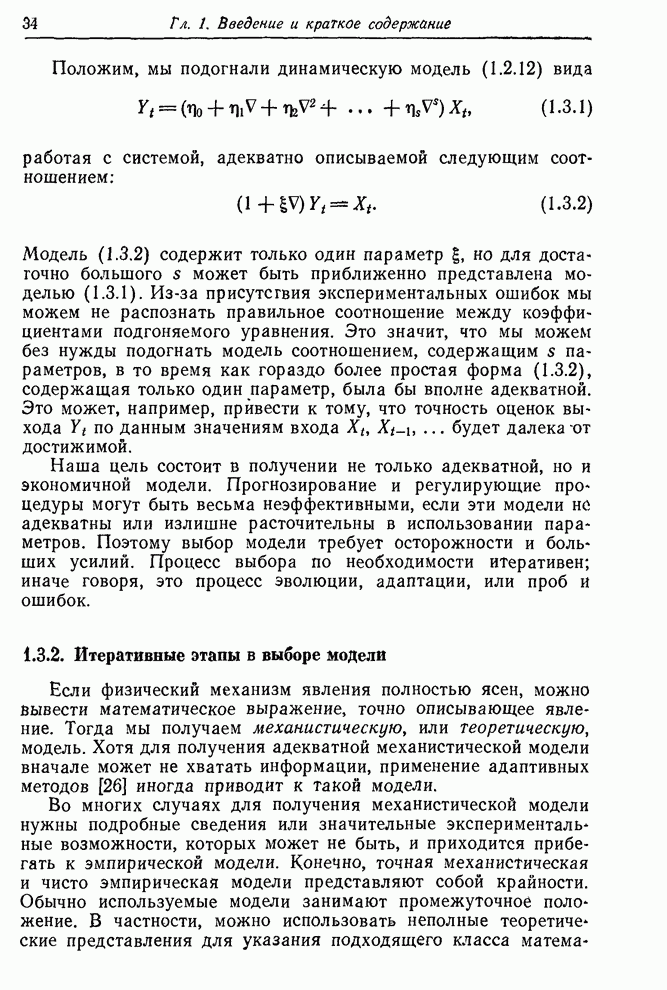предыдущие На рис. 9.2 показаны прогнозы для упреждений до 36 месяцев, сделанные на один и тот же произвольный момент — июль 1957 г. Видно, что простая модель, содержащая только два параметра, хорошо воспроизводит сезонные особенности и дает превосходные прогнозы. Следует помнить, конечно, что, как и все предсказания, получаемые из общей линейной стохастической модели, прогнозирующая функция подстраивается к данным. Когда происходят изменения в сезонных явлениях, они соответствующим образом отражаются в прогнозе. Нужно заметить, что если прогноз на месяц вперед дает завышенное значение, у всех более отдаленных прогнозов на тот же момент времени существует тенденция к завышению. Этого следовало ожидать, потому что, как указано в приложении П5.1, ошибки прогноза на один и тот же момент времени с различными упреждениями сильно коррелированы. Конечно, прогноз далеко вперед, скажем на 36 мес, неизбежно может содержать значительную ошибку. Однако на практике первоначально отдаленный прогноз будет непрерывно корректироваться, и по мере уменьшения упреждения будет достигаться все большая точность. Описанная