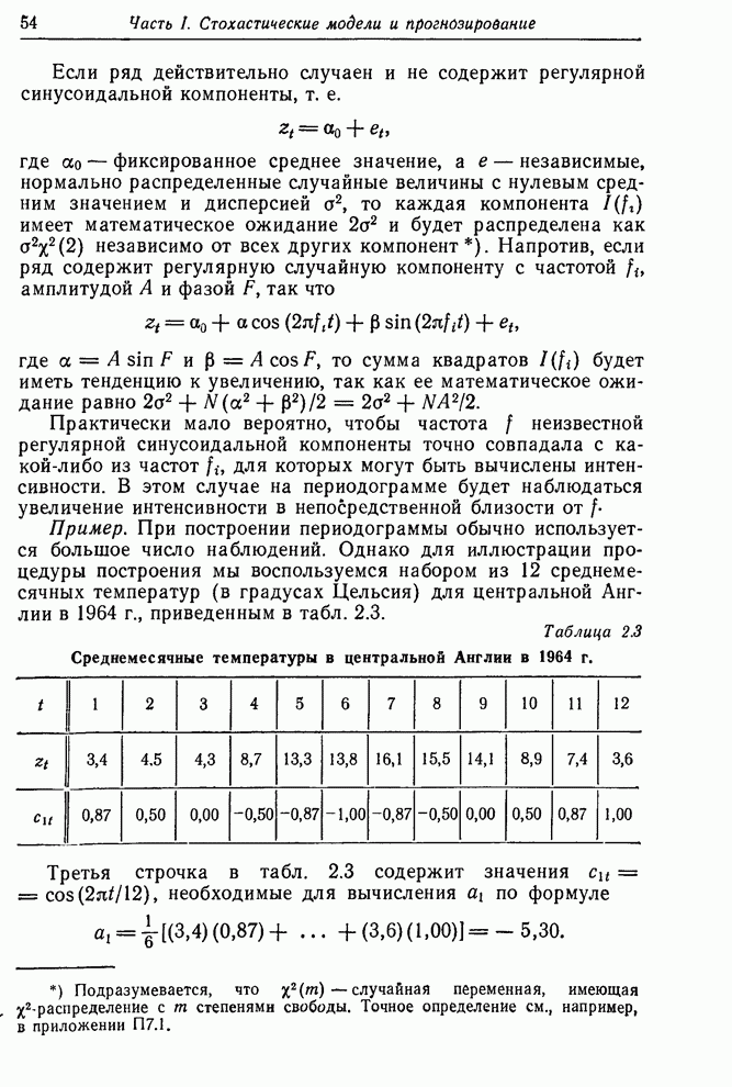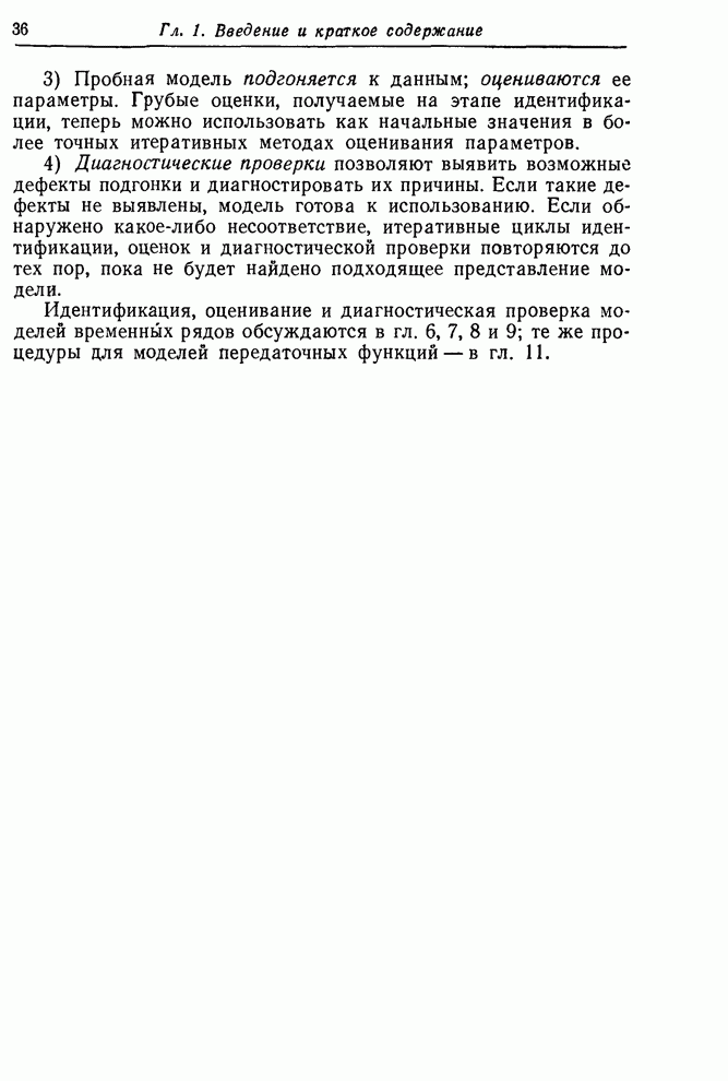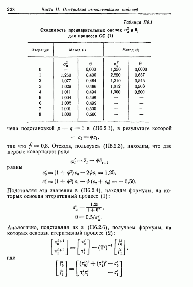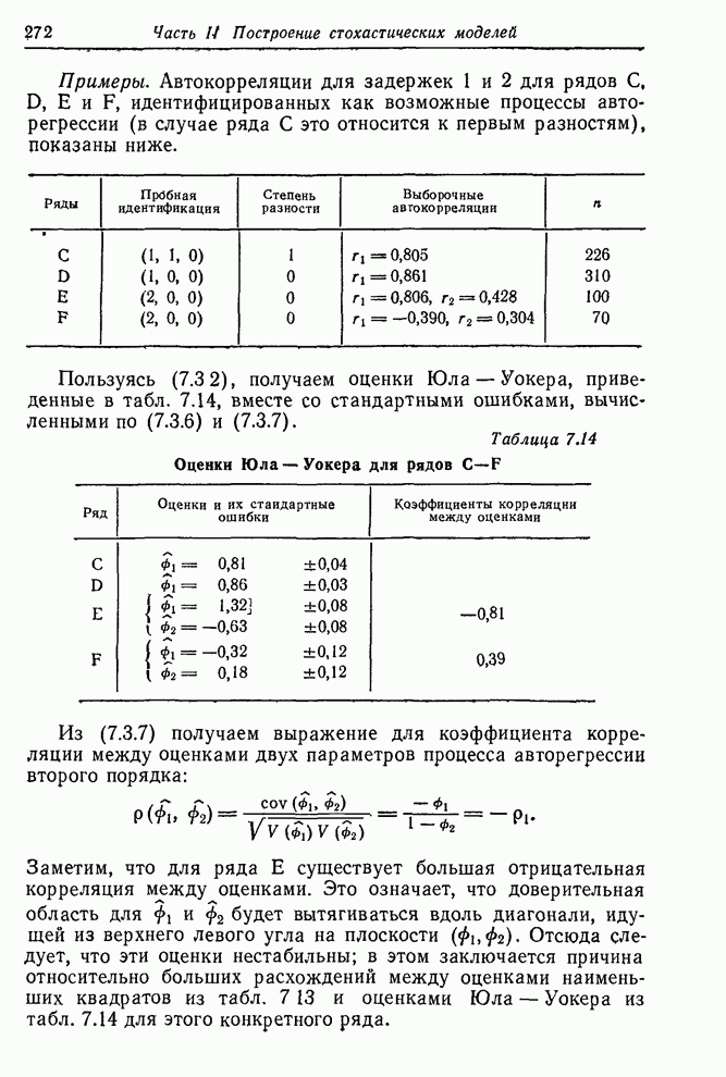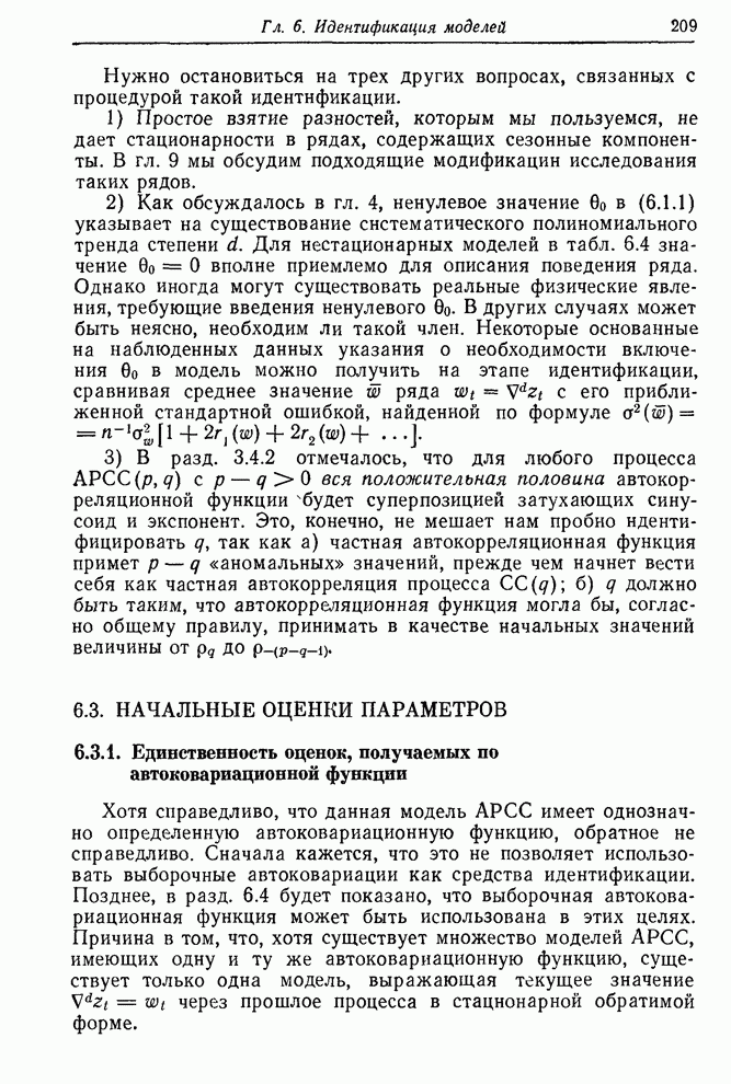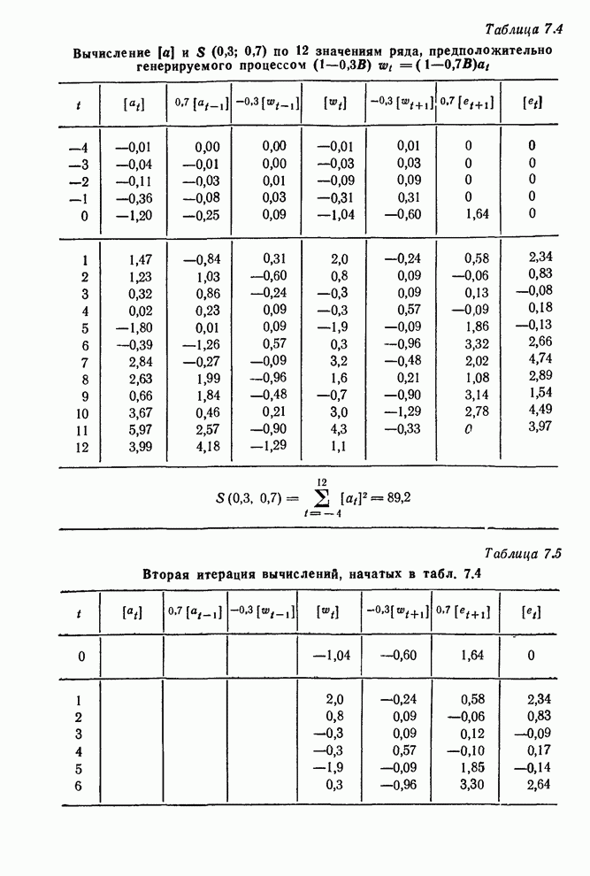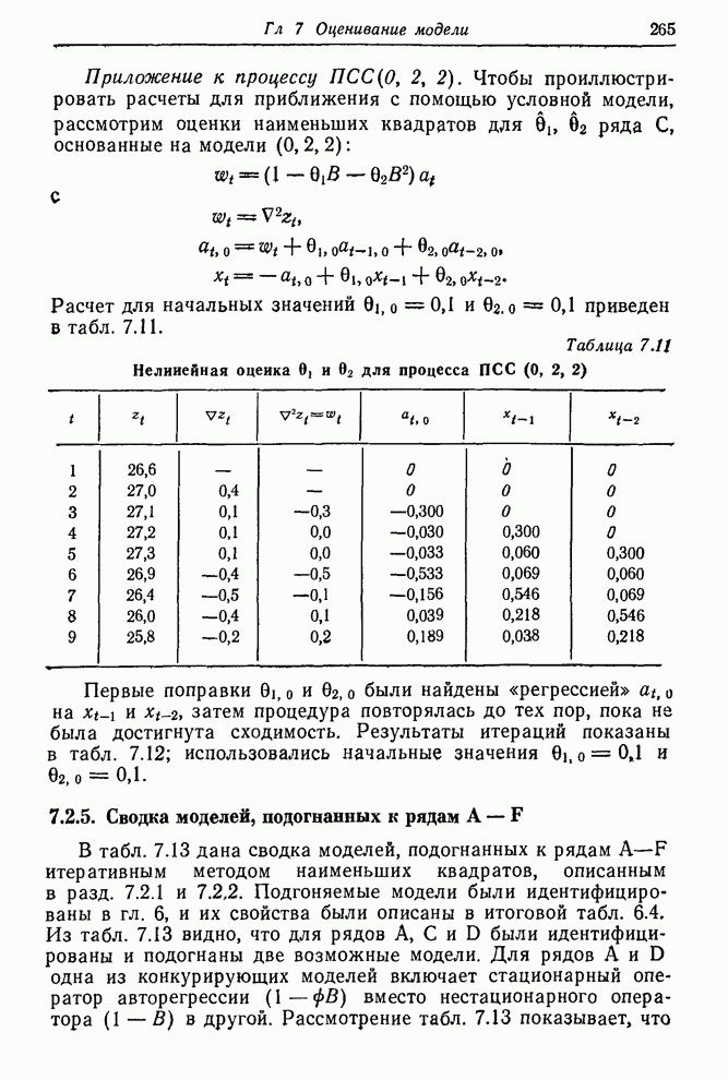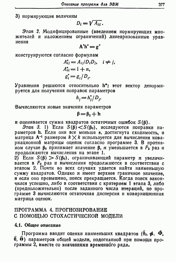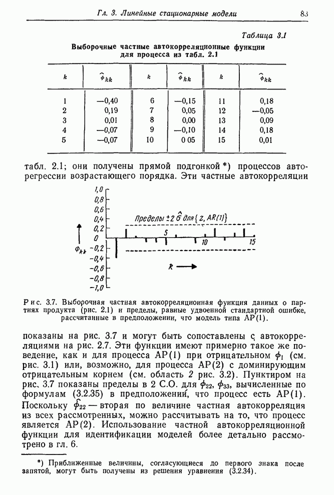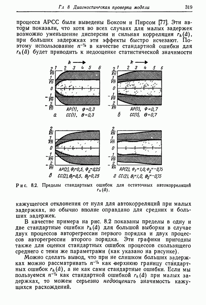 предыдущие На рис. 9.2 показаны прогнозы для упреждений до 36 месяцев, сделанные на один и тот же произвольный момент — июль 1957 г. Видно, что простая модель, содержащая только два параметра, хорошо воспроизводит сезонные особенности и дает превосходные прогнозы. Следует помнить, конечно, что, как и все предсказания, получаемые из общей линейной стохастической модели, прогнозирующая функция подстраивается к данным. Когда происходят изменения в сезонных явлениях, они соответствующим образом отражаются в прогнозе. Нужно заметить, что если прогноз на месяц вперед дает завышенное значение, у всех более отдаленных прогнозов на тот же момент времени существует тенденция к завышению. Этого следовало ожидать, потому что, как указано в приложении П5.1, ошибки прогноза на один и тот же момент времени с различными упреждениями сильно коррелированы. Конечно, прогноз далеко вперед, скажем на 36 мес, неизбежно может содержать значительную ошибку. Однако на практике первоначально отдаленный прогноз будет непрерывно корректироваться, и по мере уменьшения упреждения будет достигаться все большая точность. Описанная