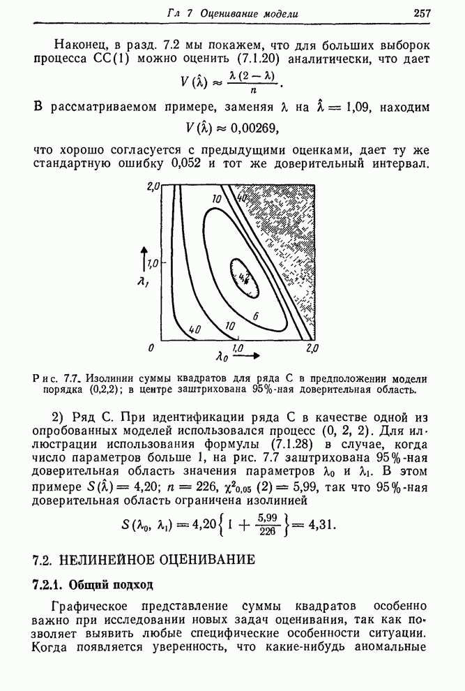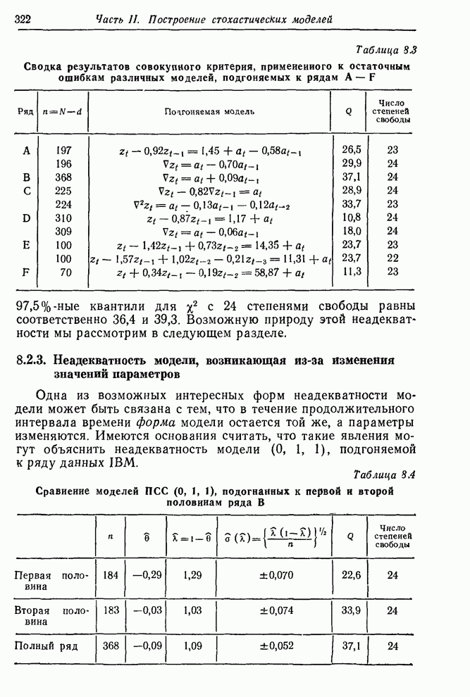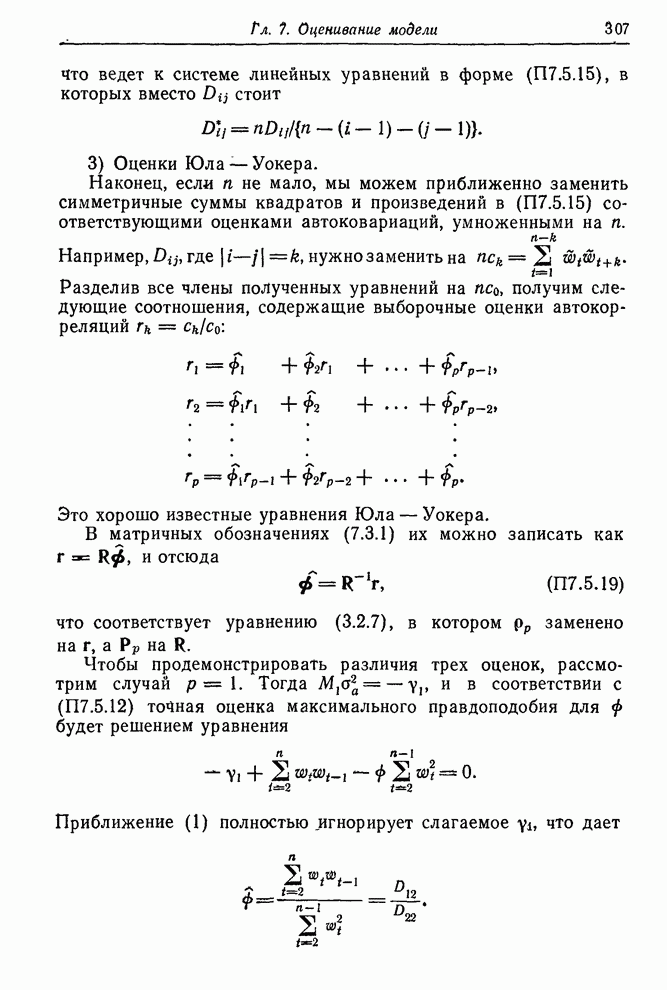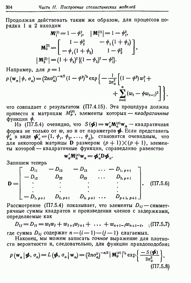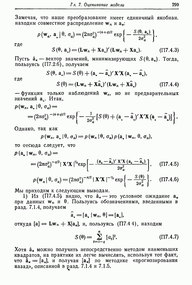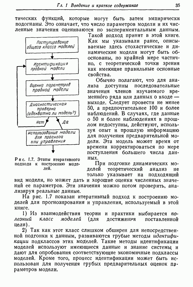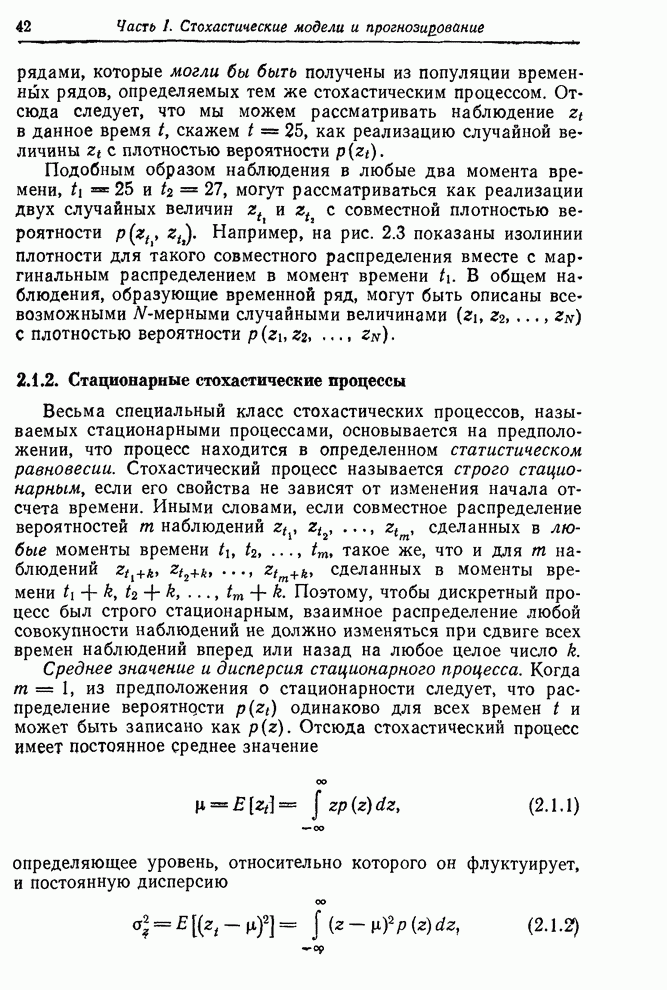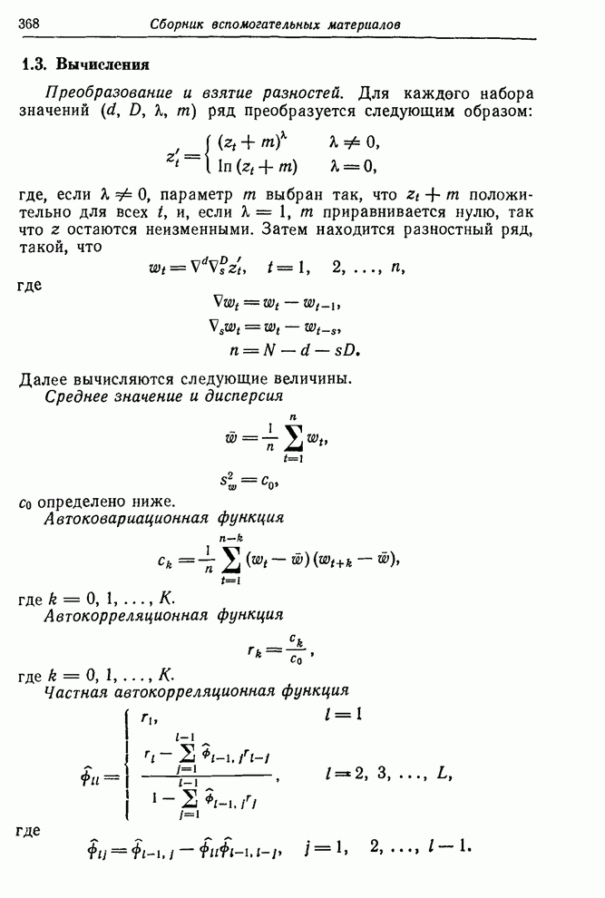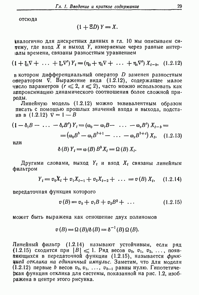 предыдущие На рис. 9.2 показаны прогнозы для упреждений до 36 месяцев, сделанные на один и тот же произвольный момент — июль 1957 г. Видно, что простая модель, содержащая только два параметра, хорошо воспроизводит сезонные особенности и дает превосходные прогнозы. Следует помнить, конечно, что, как и все предсказания, получаемые из общей линейной стохастической модели, прогнозирующая функция подстраивается к данным. Когда происходят изменения в сезонных явлениях, они соответствующим образом отражаются в прогнозе. Нужно заметить, что если прогноз на месяц вперед дает завышенное значение, у всех более отдаленных прогнозов на тот же момент времени существует тенденция к завышению. Этого следовало ожидать, потому что, как указано в приложении П5.1, ошибки прогноза на один и тот же момент времени с различными упреждениями сильно коррелированы. Конечно, прогноз далеко вперед, скажем на 36 мес, неизбежно может содержать значительную ошибку. Однако на практике первоначально отдаленный прогноз будет непрерывно корректироваться, и по мере уменьшения упреждения будет достигаться все большая точность. Описанная