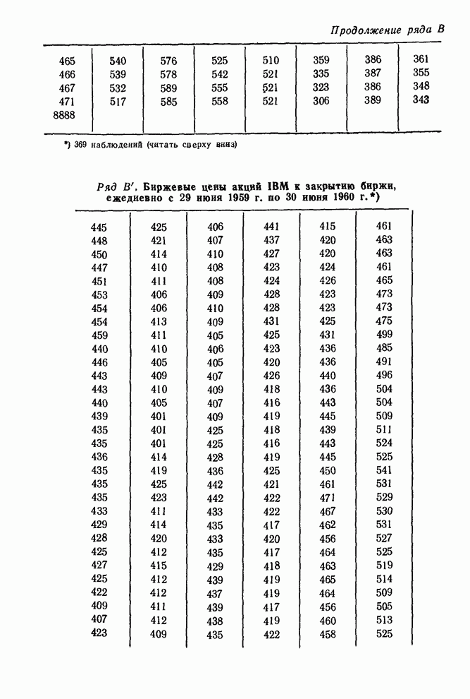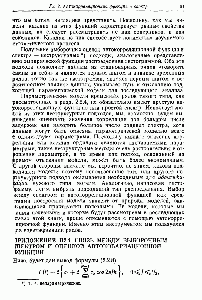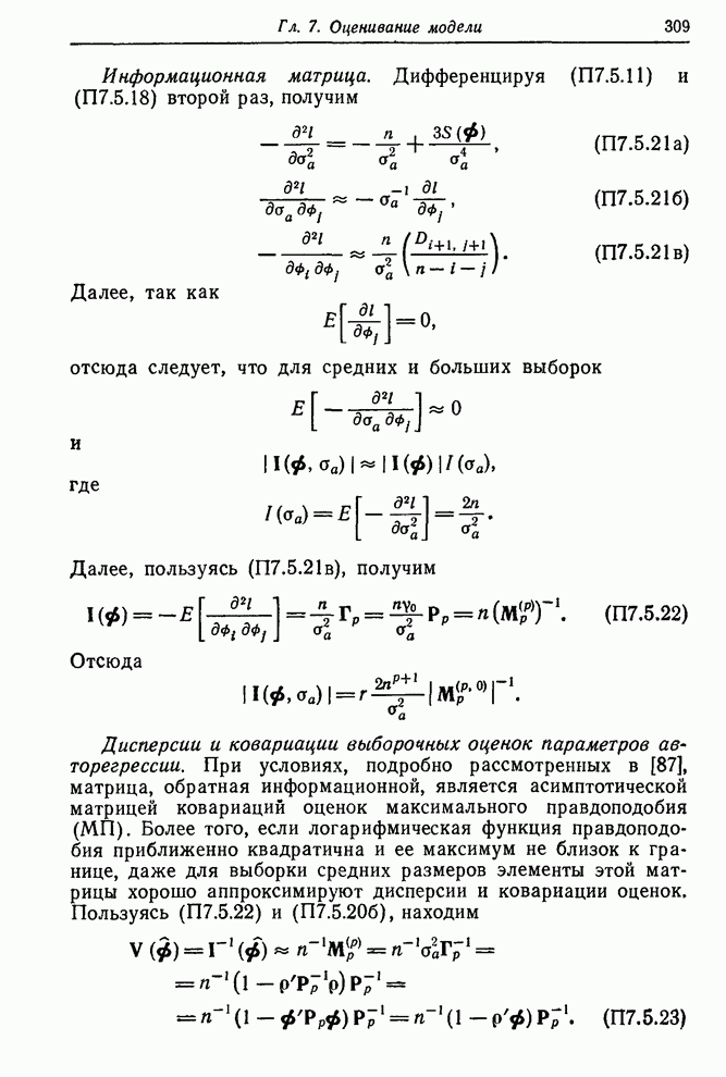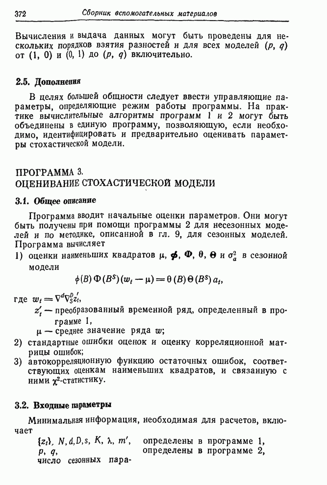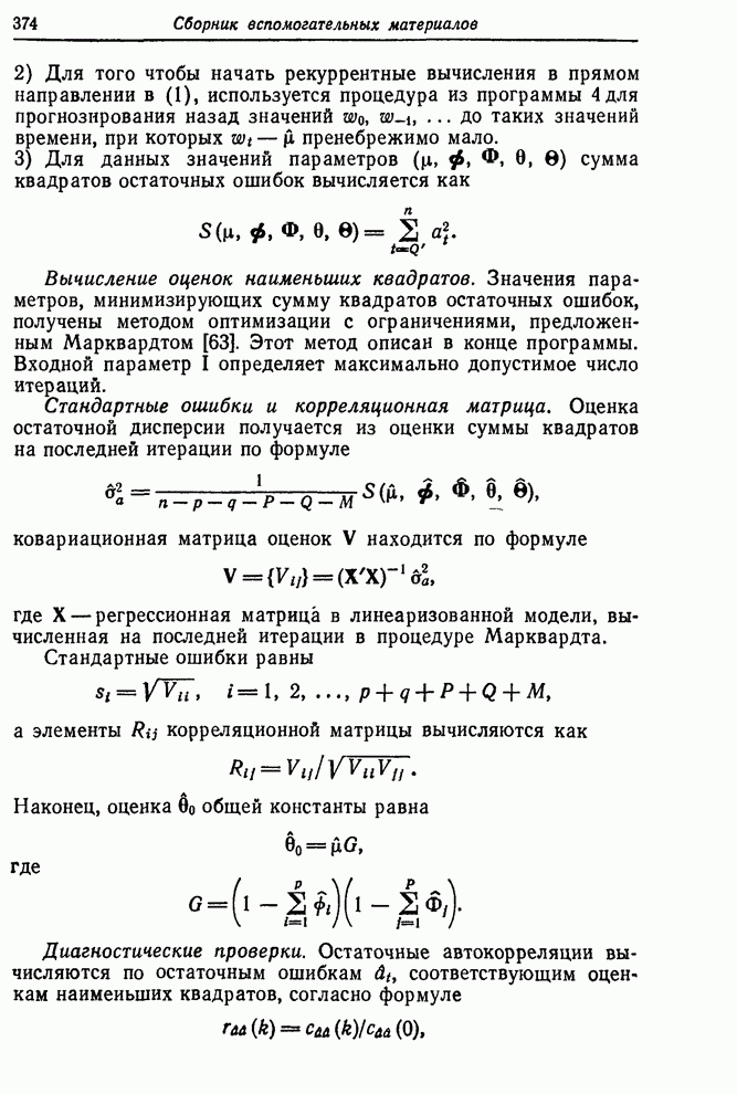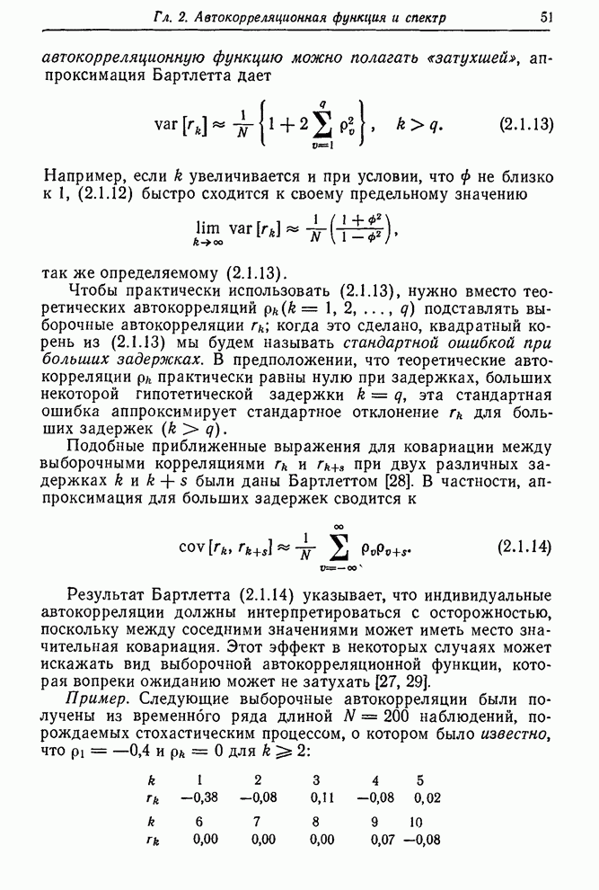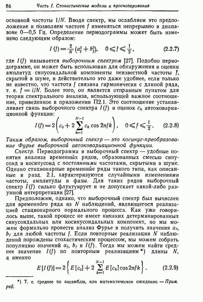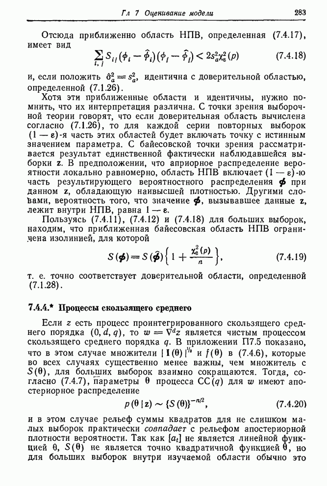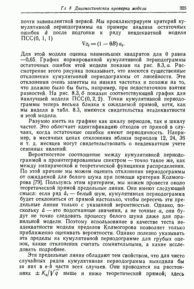 предыдущие На рис. 9.2 показаны прогнозы для упреждений до 36 месяцев, сделанные на один и тот же произвольный момент — июль 1957 г. Видно, что простая модель, содержащая только два параметра, хорошо воспроизводит сезонные особенности и дает превосходные прогнозы. Следует помнить, конечно, что, как и все предсказания, получаемые из общей линейной стохастической модели, прогнозирующая функция подстраивается к данным. Когда происходят изменения в сезонных явлениях, они соответствующим образом отражаются в прогнозе. Нужно заметить, что если прогноз на месяц вперед дает завышенное значение, у всех более отдаленных прогнозов на тот же момент времени существует тенденция к завышению. Этого следовало ожидать, потому что, как указано в приложении П5.1, ошибки прогноза на один и тот же момент времени с различными упреждениями сильно коррелированы. Конечно, прогноз далеко вперед, скажем на 36 мес, неизбежно может содержать значительную ошибку. Однако на практике первоначально отдаленный прогноз будет непрерывно корректироваться, и по мере уменьшения упреждения будет достигаться все большая точность. Описанная