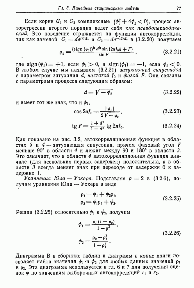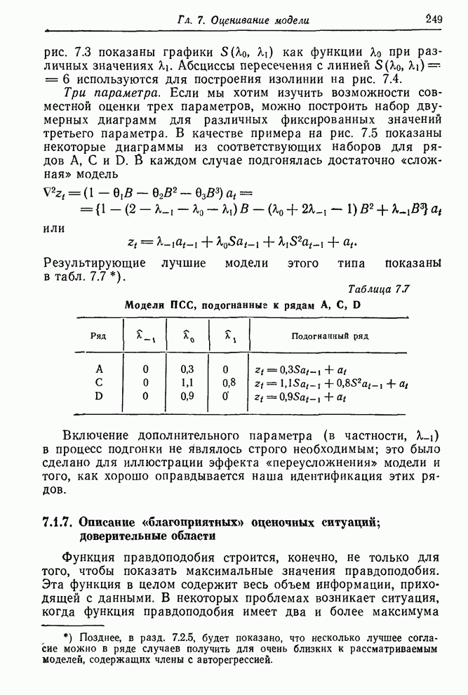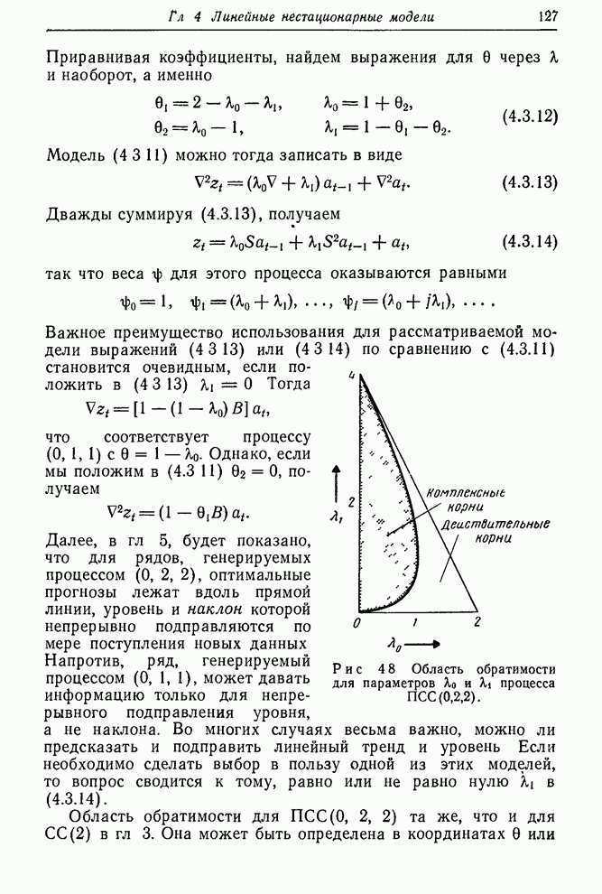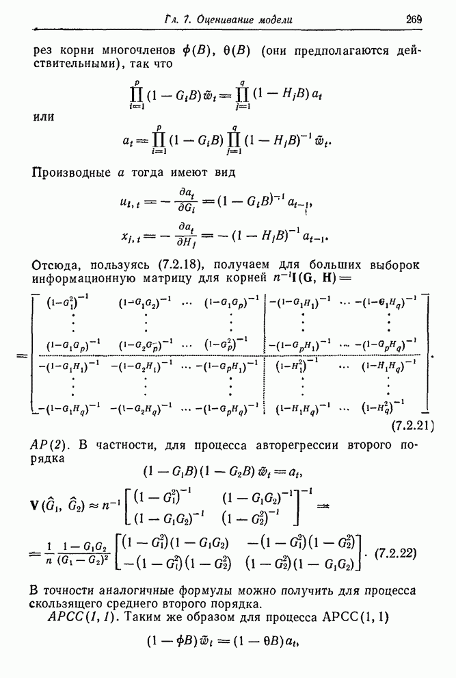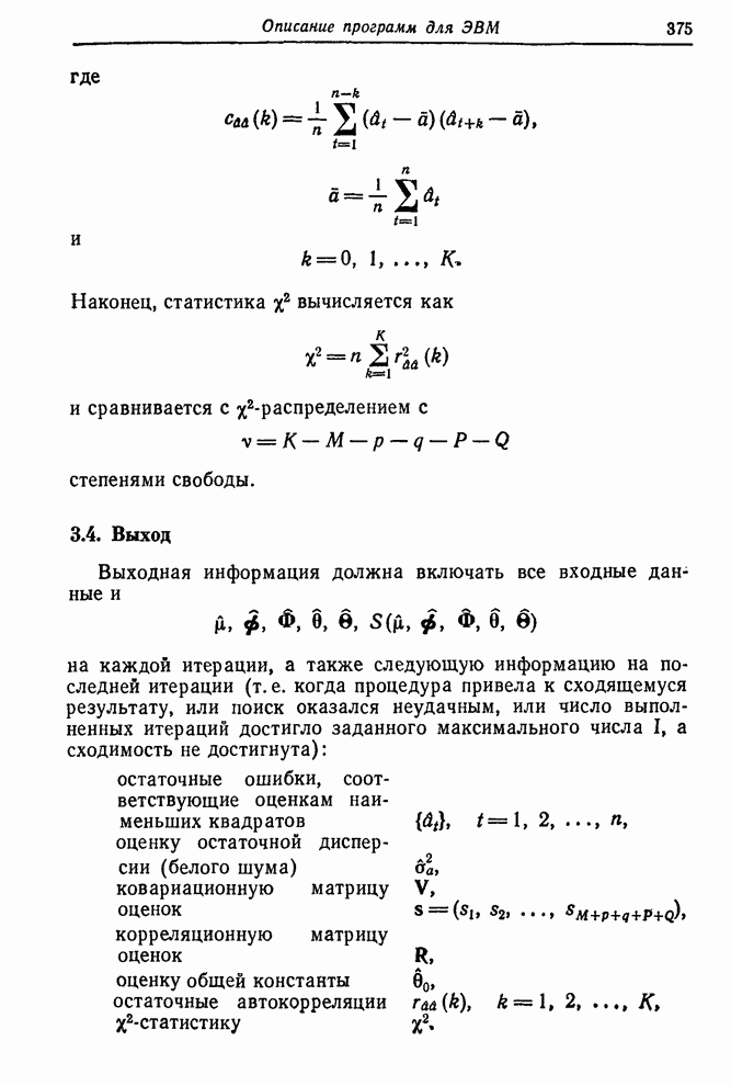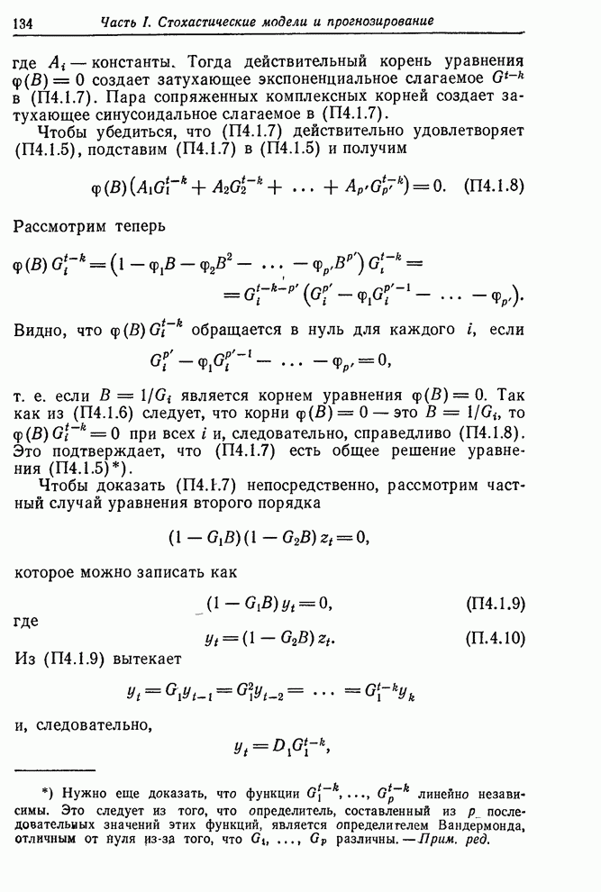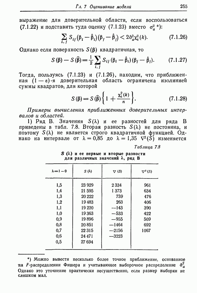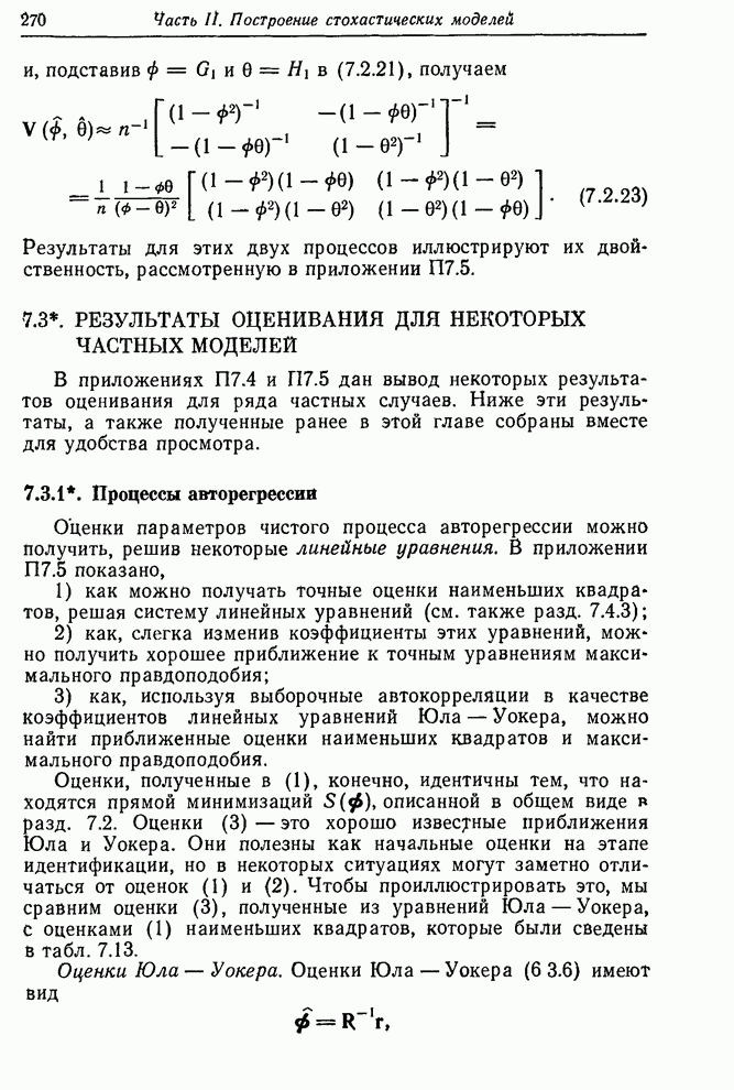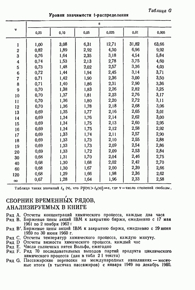 предыдущие На рис. 9.2 показаны прогнозы для упреждений до 36 месяцев, сделанные на один и тот же произвольный момент — июль 1957 г. Видно, что простая модель, содержащая только два параметра, хорошо воспроизводит сезонные особенности и дает превосходные прогнозы. Следует помнить, конечно, что, как и все предсказания, получаемые из общей линейной стохастической модели, прогнозирующая функция подстраивается к данным. Когда происходят изменения в сезонных явлениях, они соответствующим образом отражаются в прогнозе. Нужно заметить, что если прогноз на месяц вперед дает завышенное значение, у всех более отдаленных прогнозов на тот же момент времени существует тенденция к завышению. Этого следовало ожидать, потому что, как указано в приложении П5.1, ошибки прогноза на один и тот же момент времени с различными упреждениями сильно коррелированы. Конечно, прогноз далеко вперед, скажем на 36 мес, неизбежно может содержать значительную ошибку. Однако на практике первоначально отдаленный прогноз будет непрерывно корректироваться, и по мере уменьшения упреждения будет достигаться все большая точность. Описанная