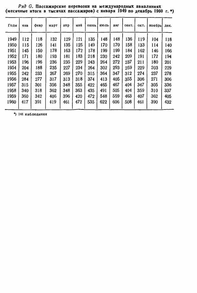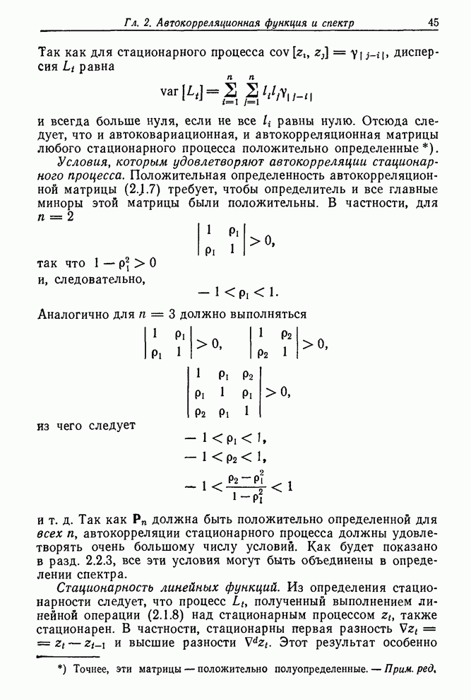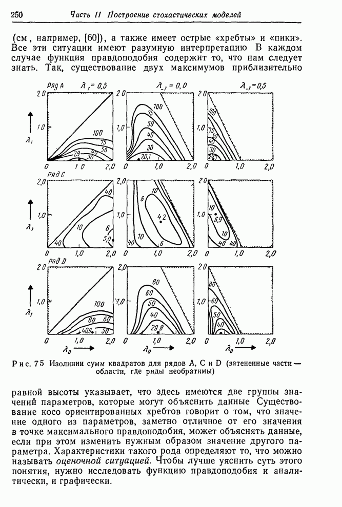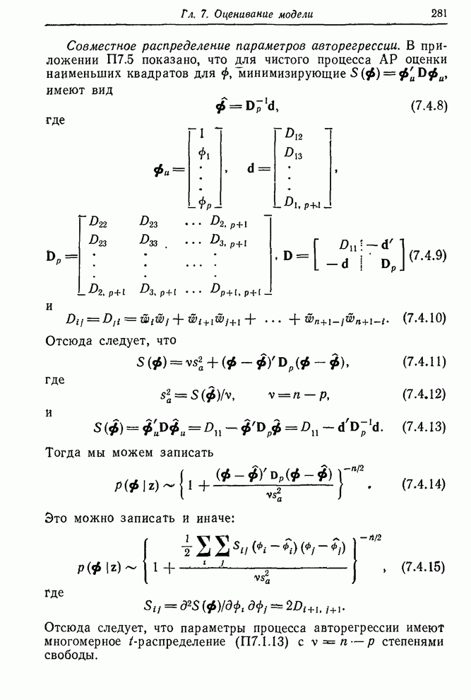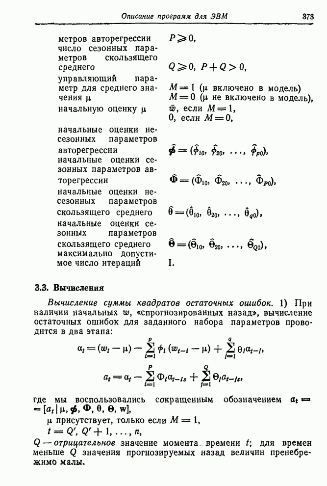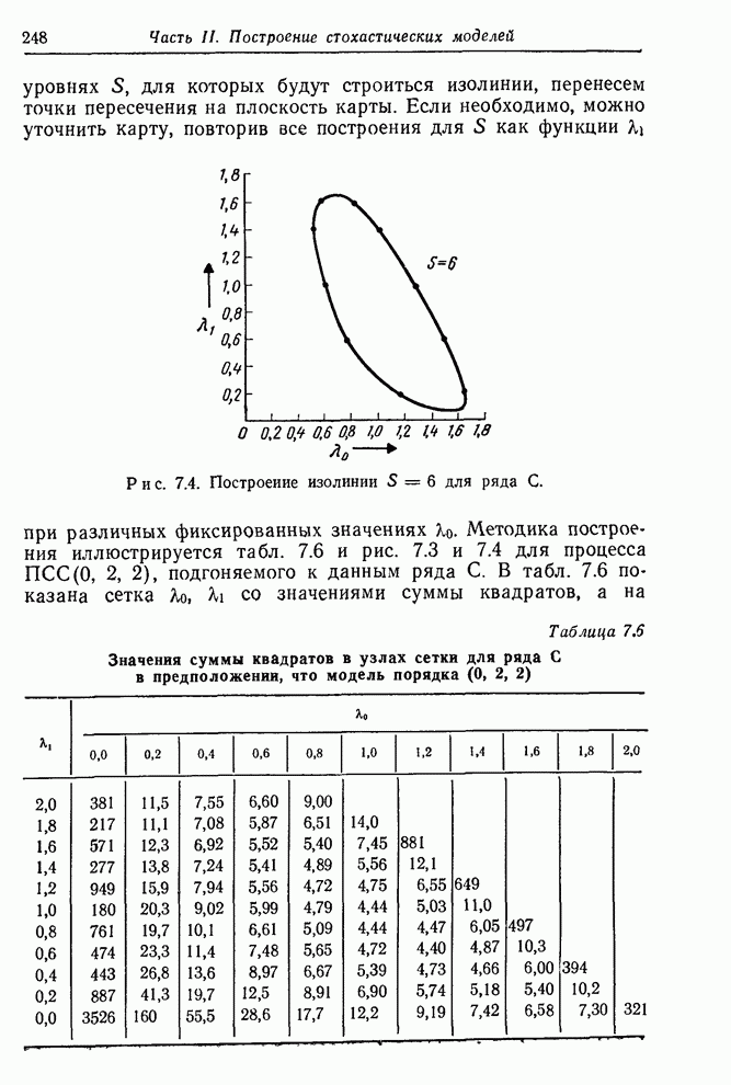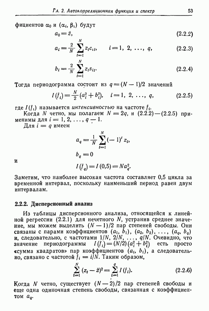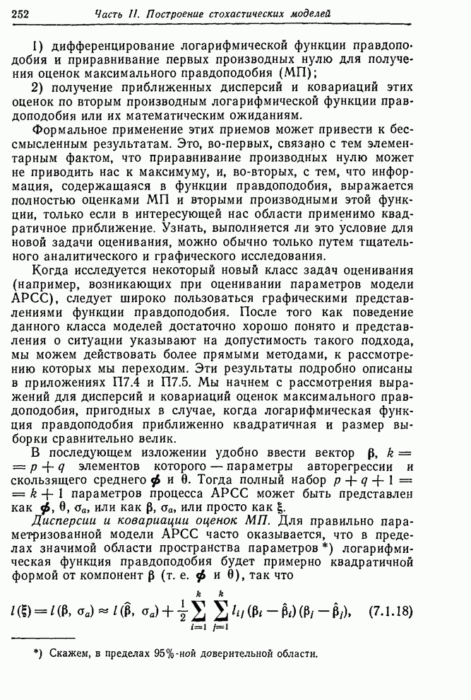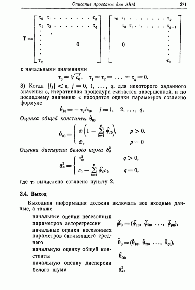 предыдущие На рис. 9.2 показаны прогнозы для упреждений до 36 месяцев, сделанные на один и тот же произвольный момент — июль 1957 г. Видно, что простая модель, содержащая только два параметра, хорошо воспроизводит сезонные особенности и дает превосходные прогнозы. Следует помнить, конечно, что, как и все предсказания, получаемые из общей линейной стохастической модели, прогнозирующая функция подстраивается к данным. Когда происходят изменения в сезонных явлениях, они соответствующим образом отражаются в прогнозе. Нужно заметить, что если прогноз на месяц вперед дает завышенное значение, у всех более отдаленных прогнозов на тот же момент времени существует тенденция к завышению. Этого следовало ожидать, потому что, как указано в приложении П5.1, ошибки прогноза на один и тот же момент времени с различными упреждениями сильно коррелированы. Конечно, прогноз далеко вперед, скажем на 36 мес, неизбежно может содержать значительную ошибку. Однако на практике первоначально отдаленный прогноз будет непрерывно корректироваться, и по мере уменьшения упреждения будет достигаться все большая точность. Описанная