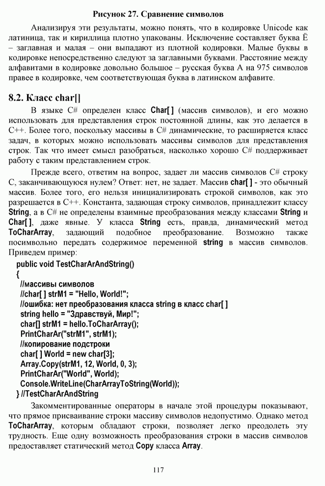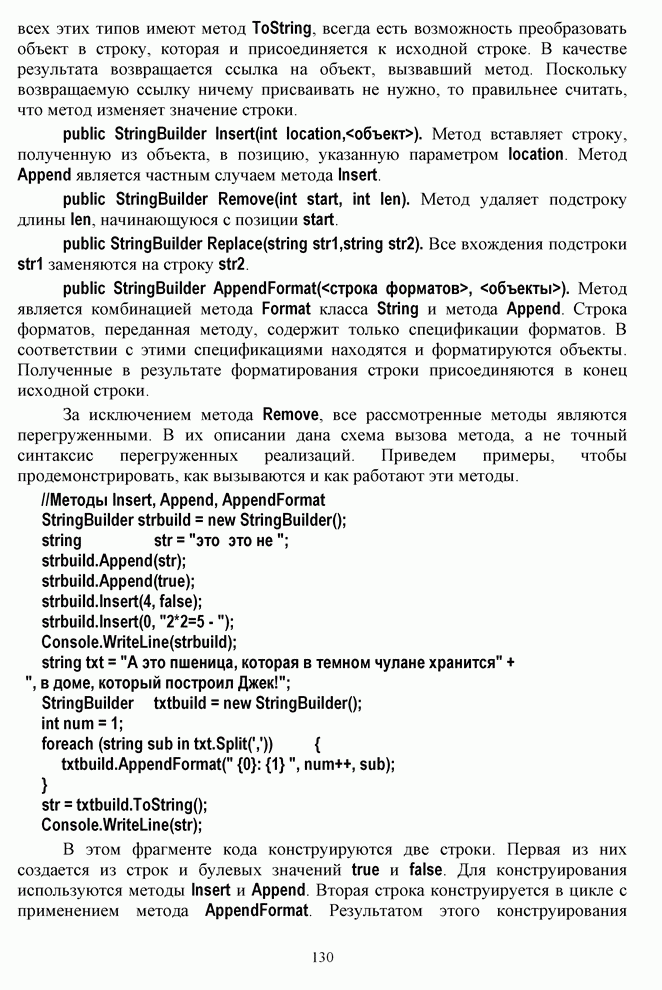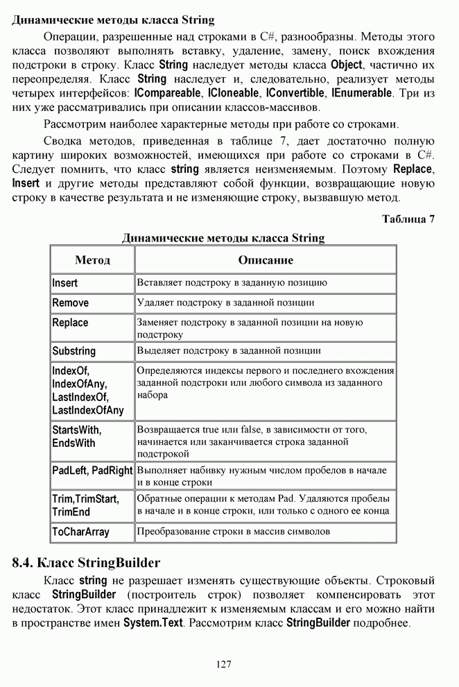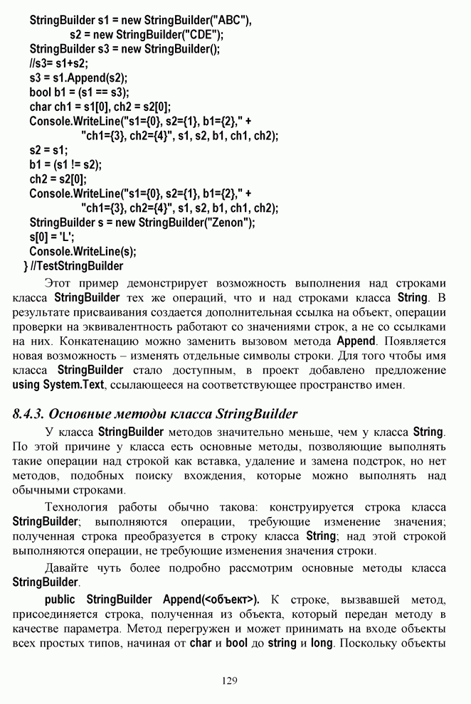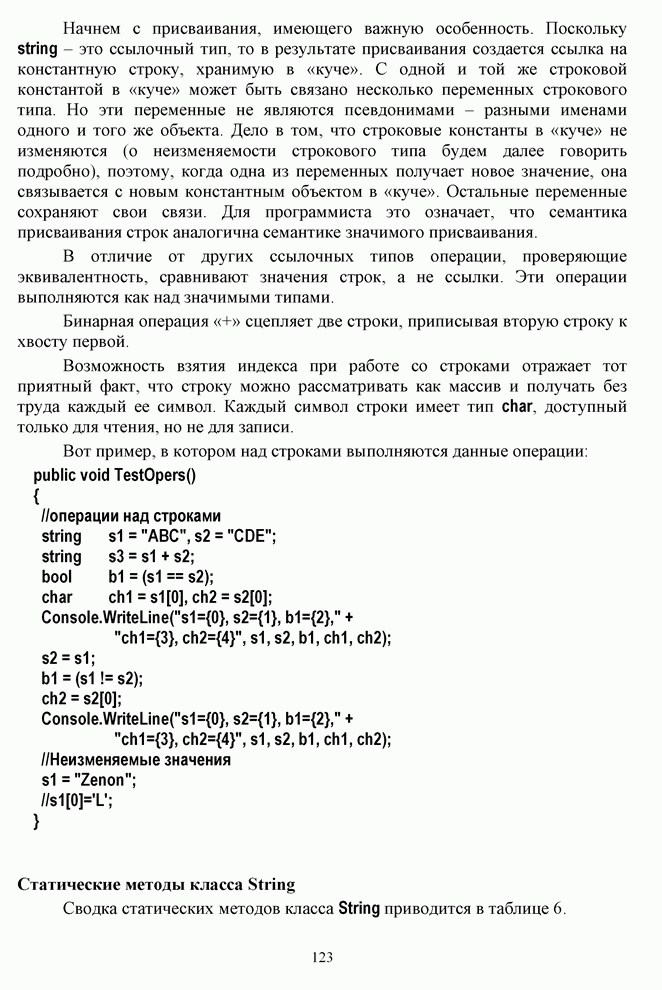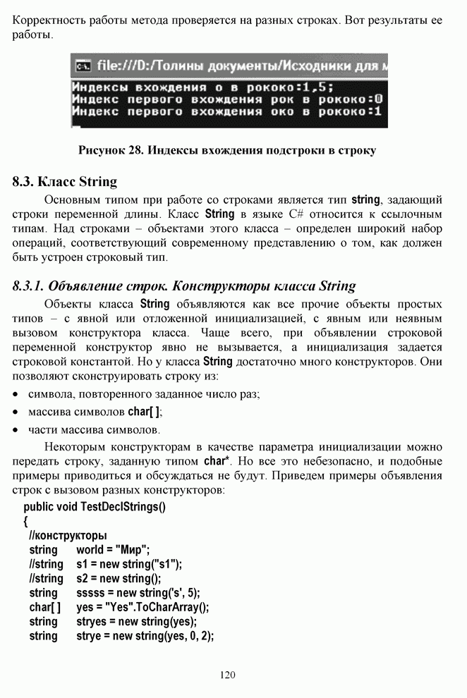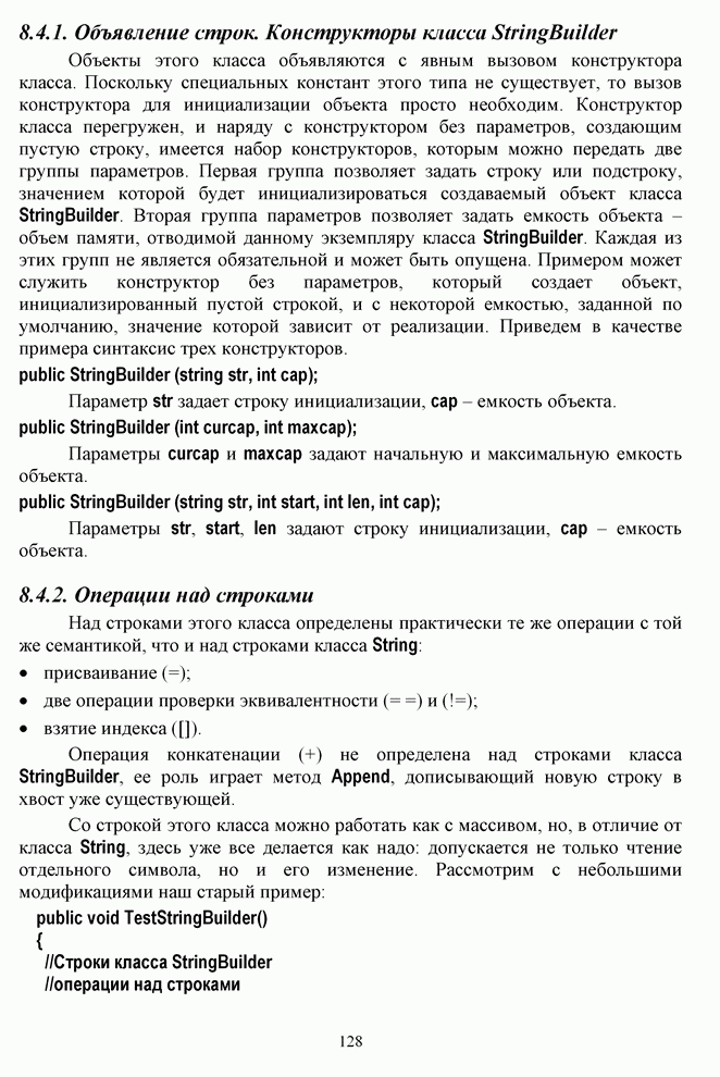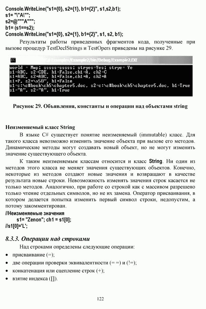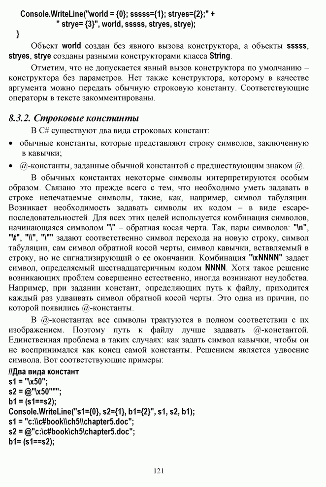 8.3.1. Объявление строк. Конструкторы класса StringОбъекты класса String объявляются как все прочие объекты простых типов - с явной или отложенной инициализацией, с явным или неявным вызовом конструктора класса. Чаще всего, при объявлении строковой переменной конструктор явно не вызывается, а инициализация задается строковой константой. Но у класса String достаточно много конструкторов. Они позволяют сконструировать строку из: - символа, повторенного заданное число раз; - массива символов char[ ]; - части массива символов. Некоторым конструкторам в качестве параметра инициализации можно передать строку, заданную типом char*. Но все это небезопасно, и подобные примеры приводиться и обсуждаться не будут. Приведем примеры объявления строк с вызовом разных конструкторов: public void TestDeclStrings() {