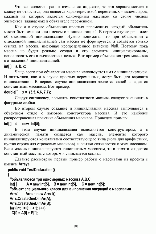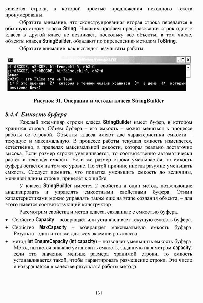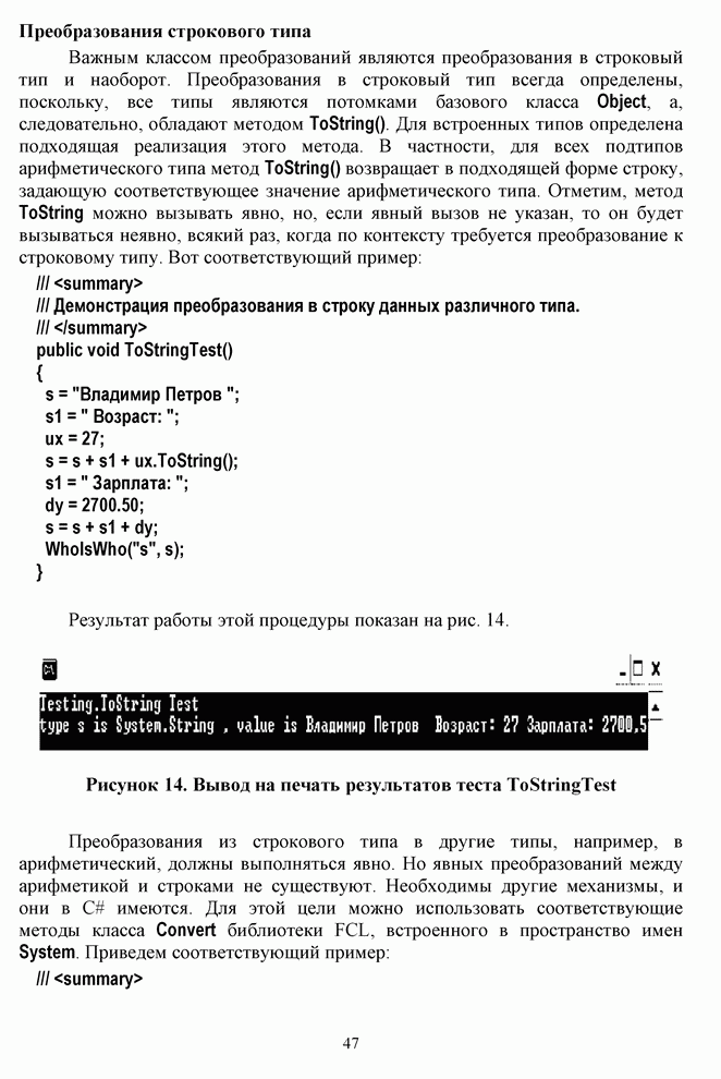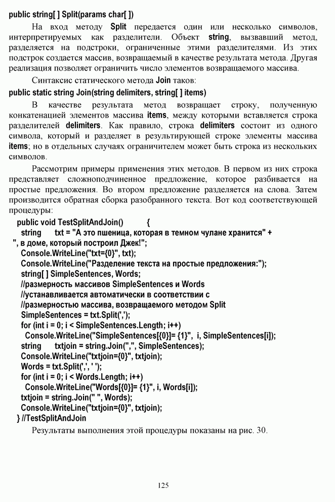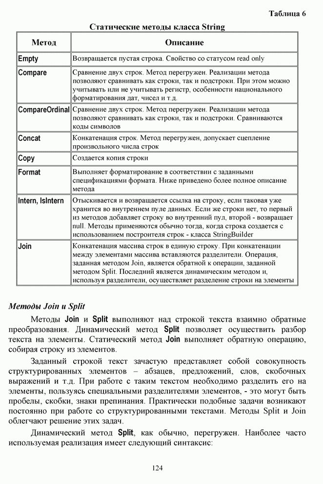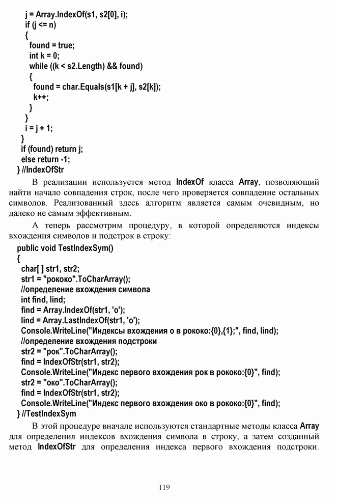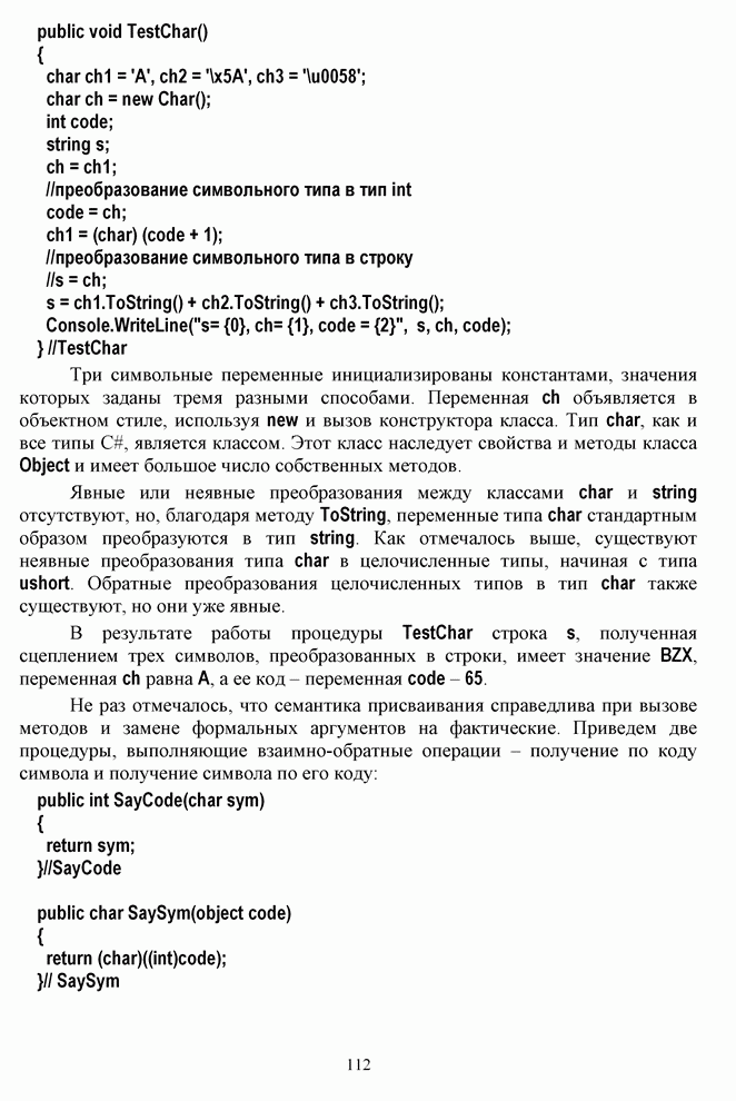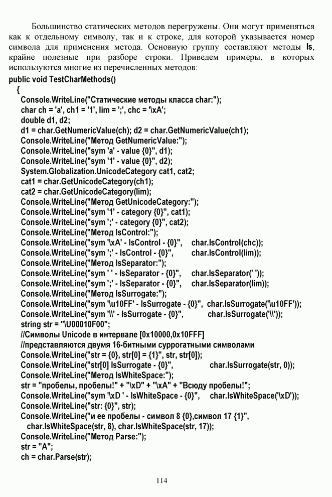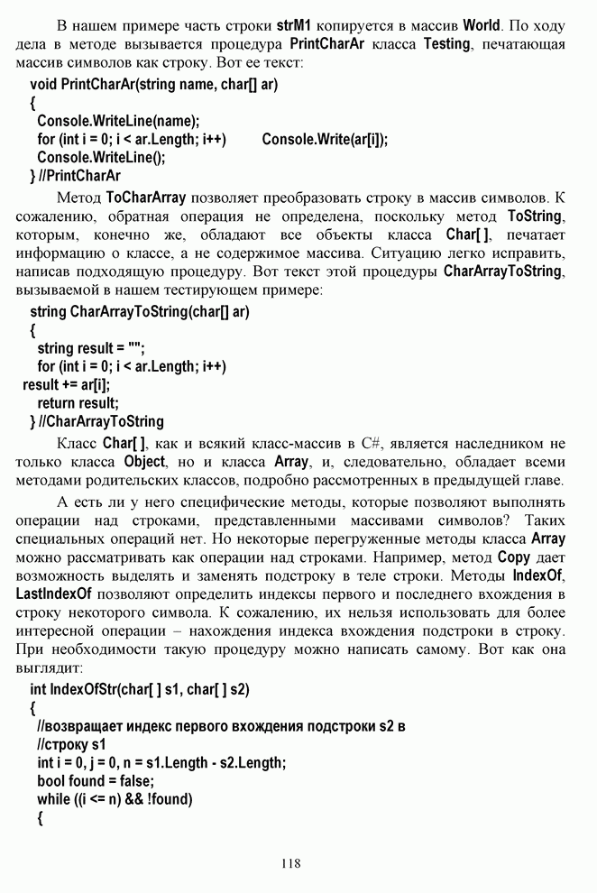 8.3.1. Объявление строк. Конструкторы класса StringОбъекты класса String объявляются как все прочие объекты простых типов - с явной или отложенной инициализацией, с явным или неявным вызовом конструктора класса. Чаще всего, при объявлении строковой переменной конструктор явно не вызывается, а инициализация задается строковой константой. Но у класса String достаточно много конструкторов. Они позволяют сконструировать строку из: - символа, повторенного заданное число раз; - массива символов char[ ]; - части массива символов. Некоторым конструкторам в качестве параметра инициализации можно передать строку, заданную типом char*. Но все это небезопасно, и подобные примеры приводиться и обсуждаться не будут. Приведем примеры объявления строк с вызовом разных конструкторов: public void TestDeclStrings() {