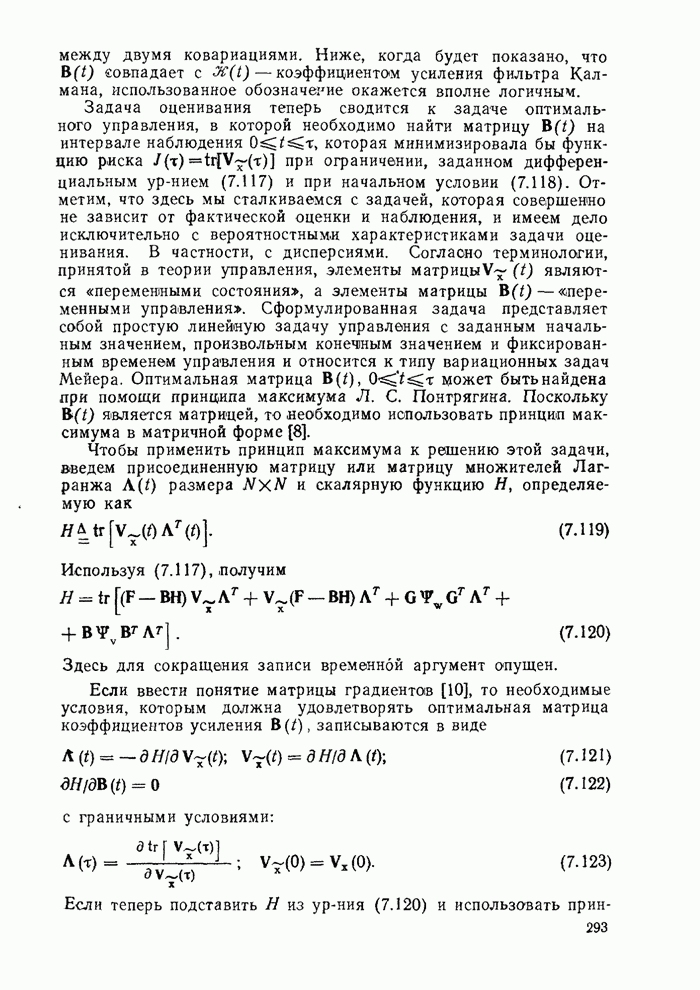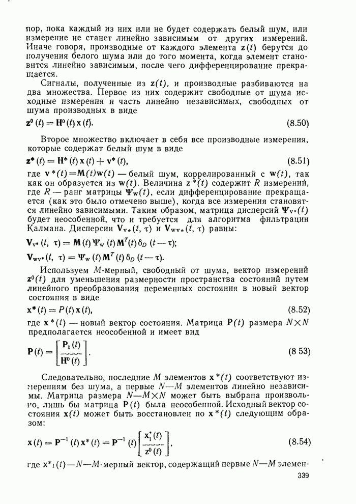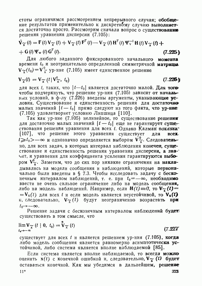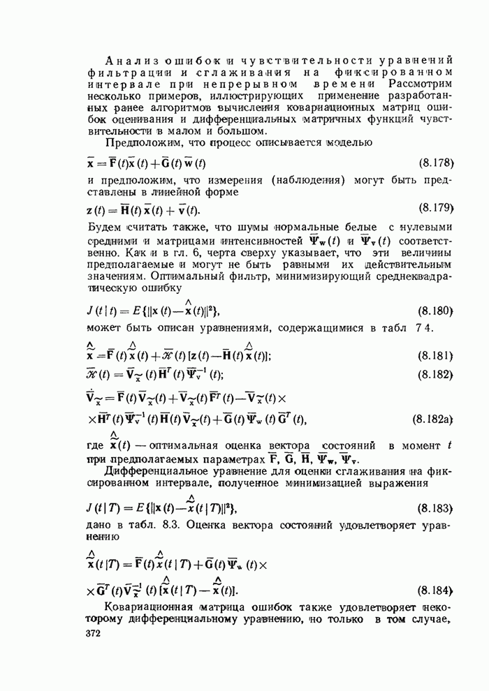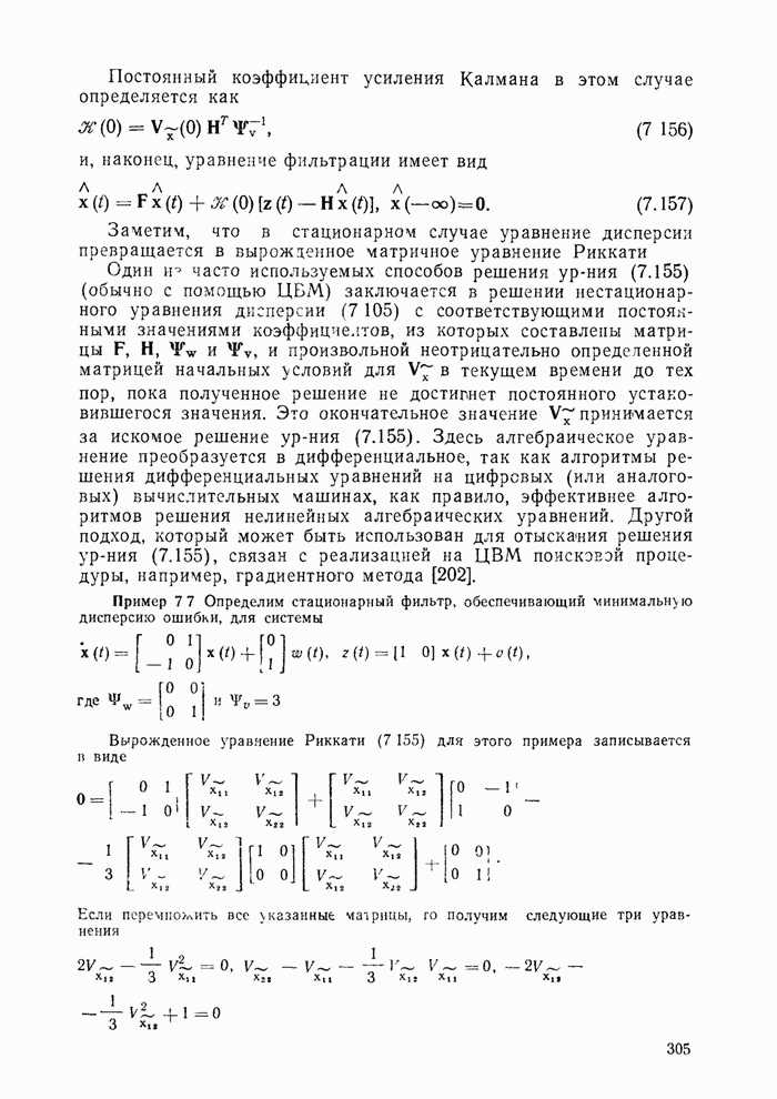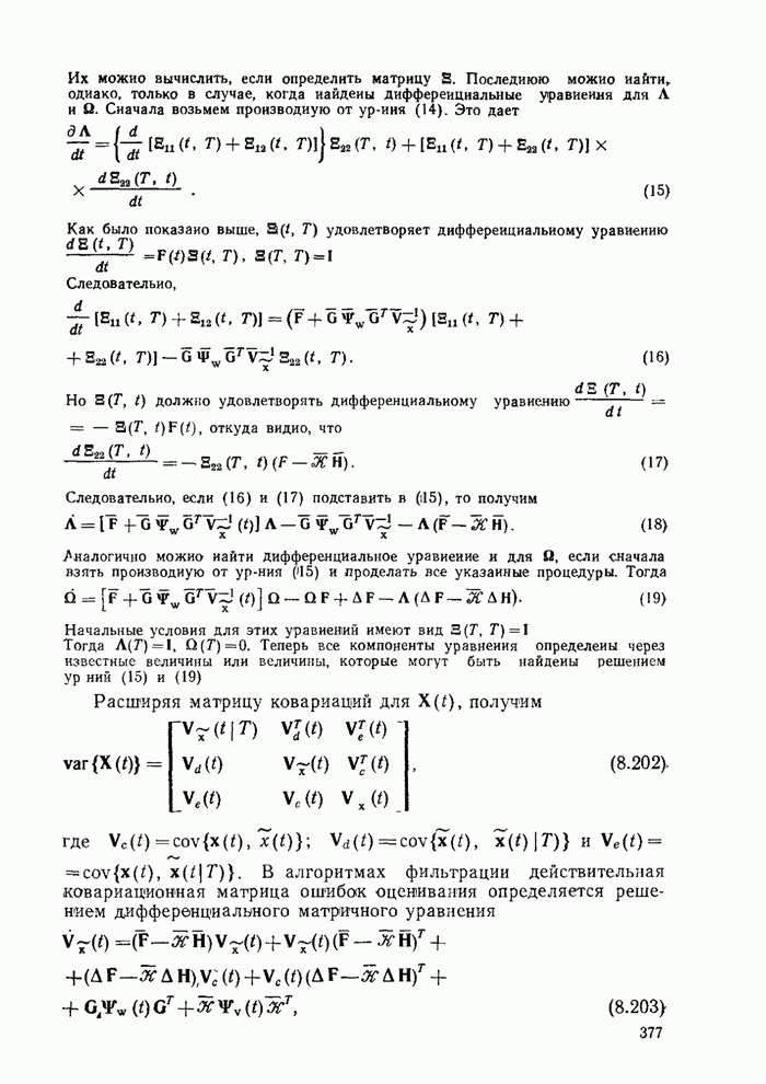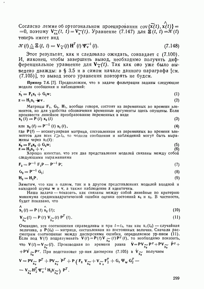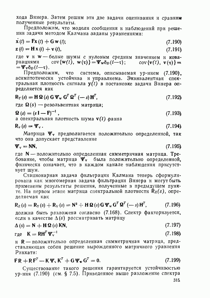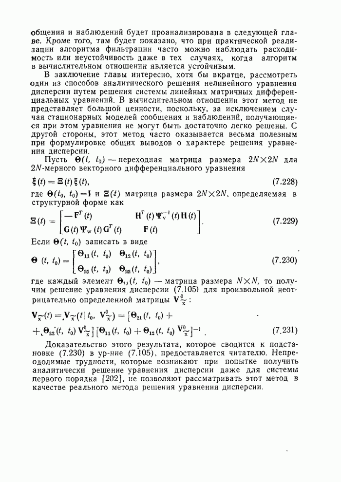 мы выбираем В заключение главы интересно, хотя бы вкратце, рассмотреть один из способов аналитического решения нелинейного уравнения дисперсии путем решения системы линейных матричных дифференциальных уравнений. В вычислительном отношении этот метод не представляет большой ценности, поскольку, за исключением случая стационарных моделей сообщения и наблюдений, получающиеся при этом уравнения не могут быть достаточно легко решены. С другой стороны, этот метод часто оказывается весьма полезным при формулировке общих выводов о характере решения уравнения дисперсии. Пусть