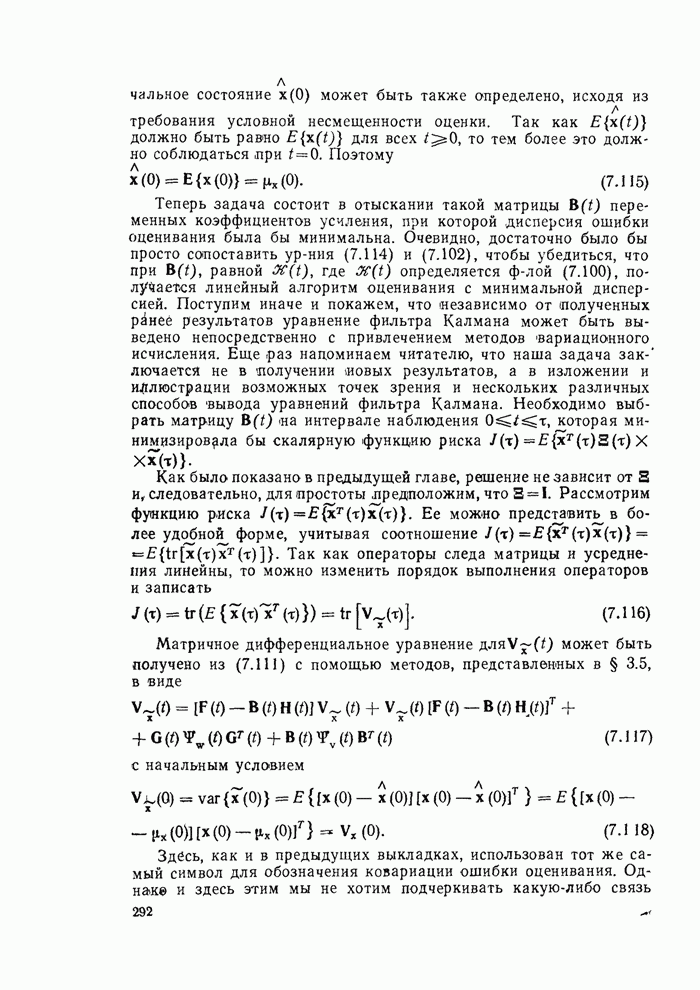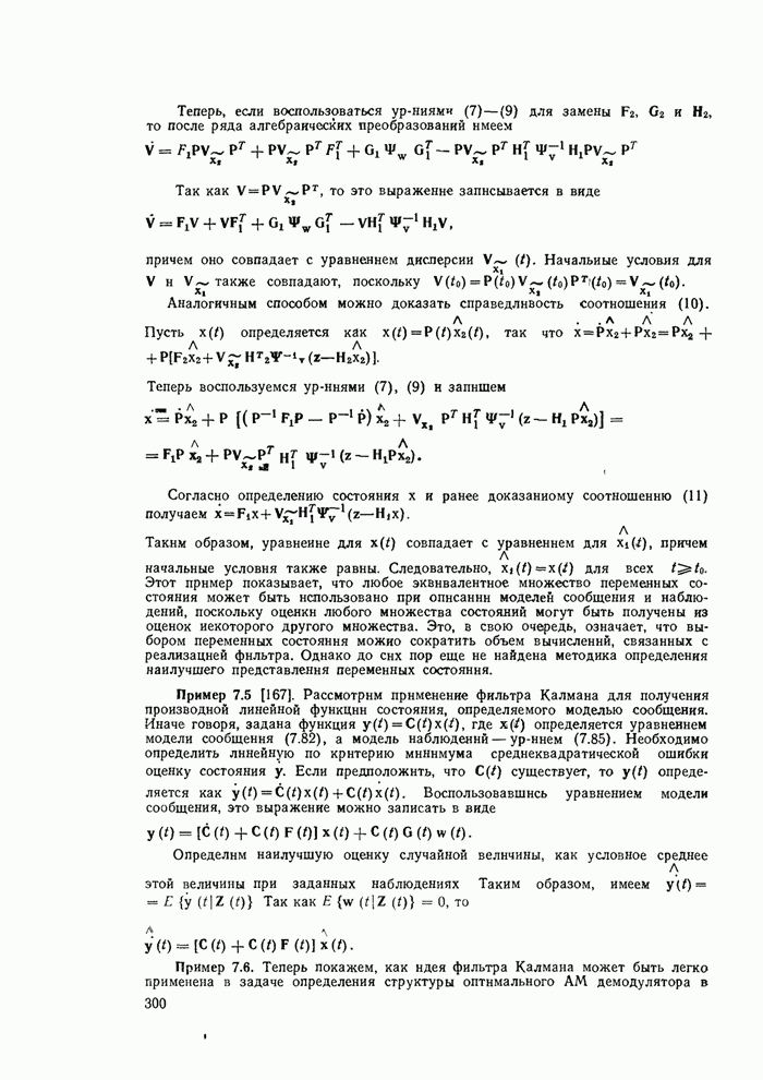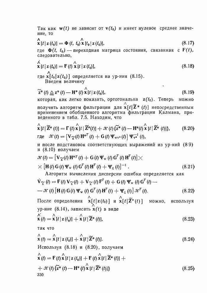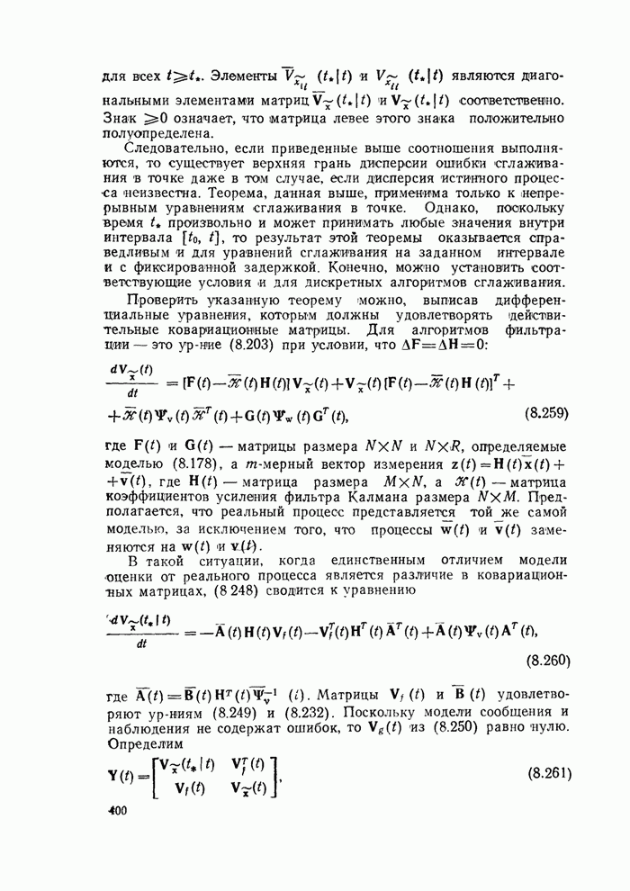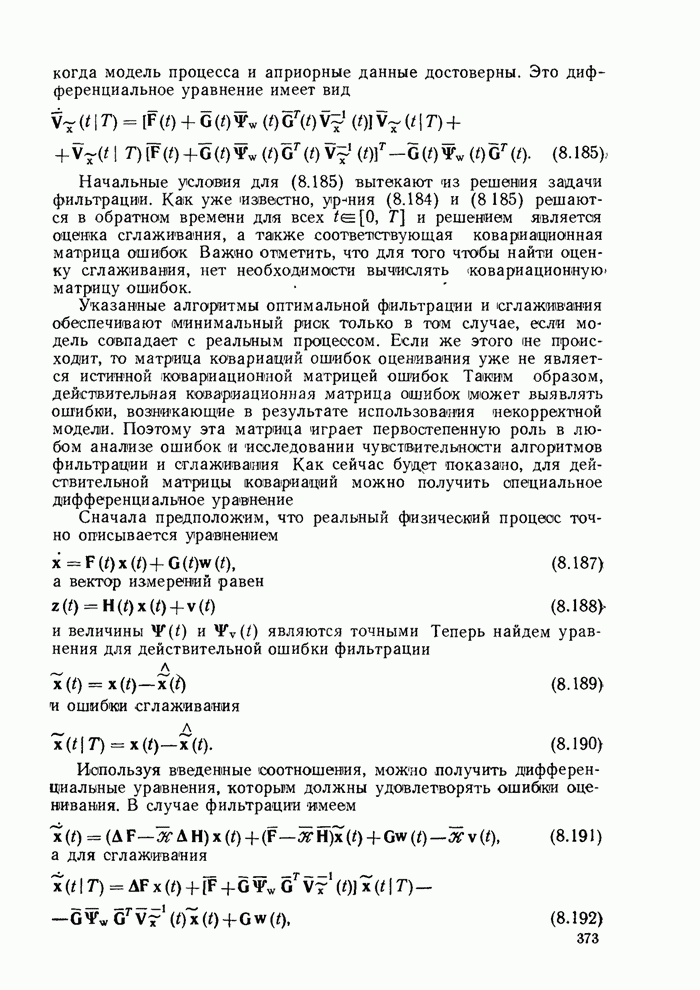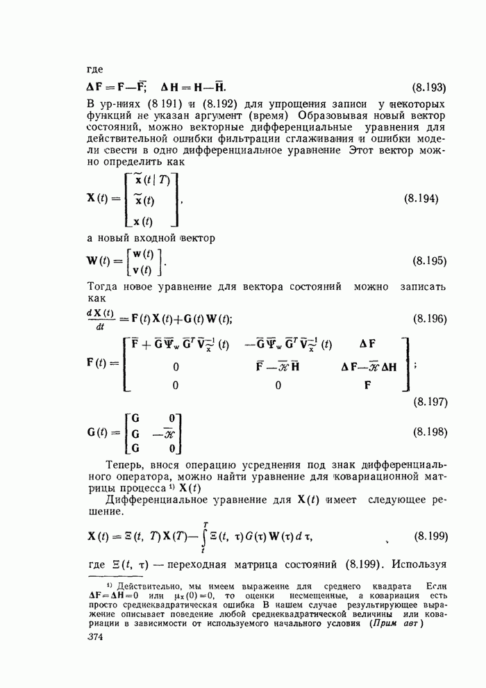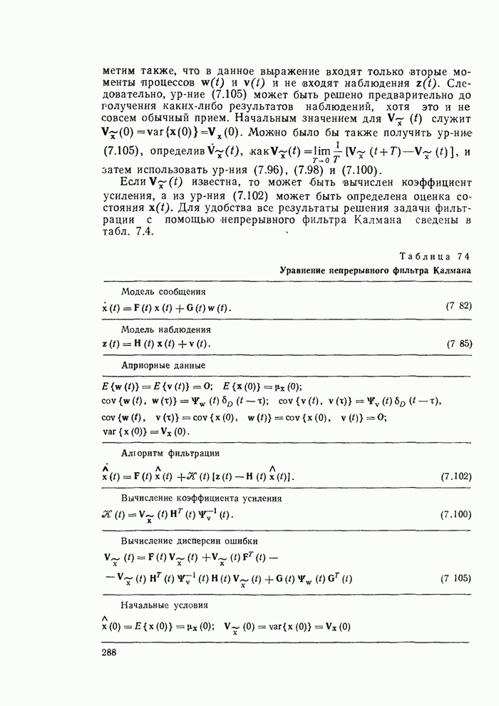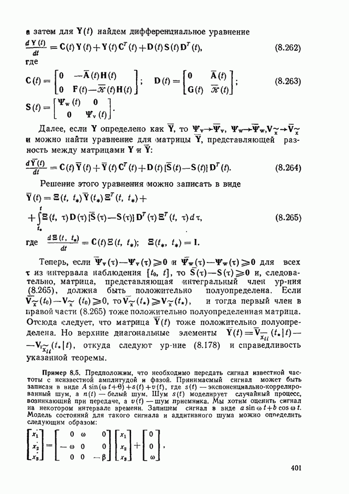 мы выбираем В заключение главы интересно, хотя бы вкратце, рассмотреть один из способов аналитического решения нелинейного уравнения дисперсии путем решения системы линейных матричных дифференциальных уравнений. В вычислительном отношении этот метод не представляет большой ценности, поскольку, за исключением случая стационарных моделей сообщения и наблюдений, получающиеся при этом уравнения не могут быть достаточно легко решены. С другой стороны, этот метод часто оказывается весьма полезным при формулировке общих выводов о характере решения уравнения дисперсии. Пусть