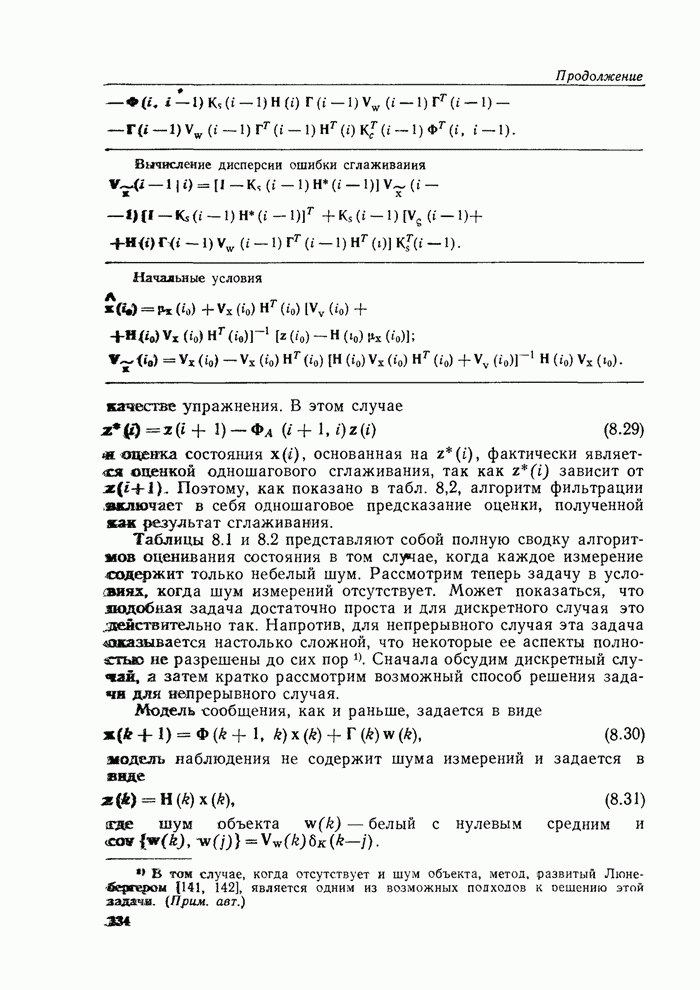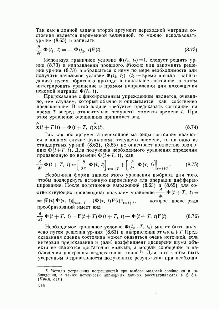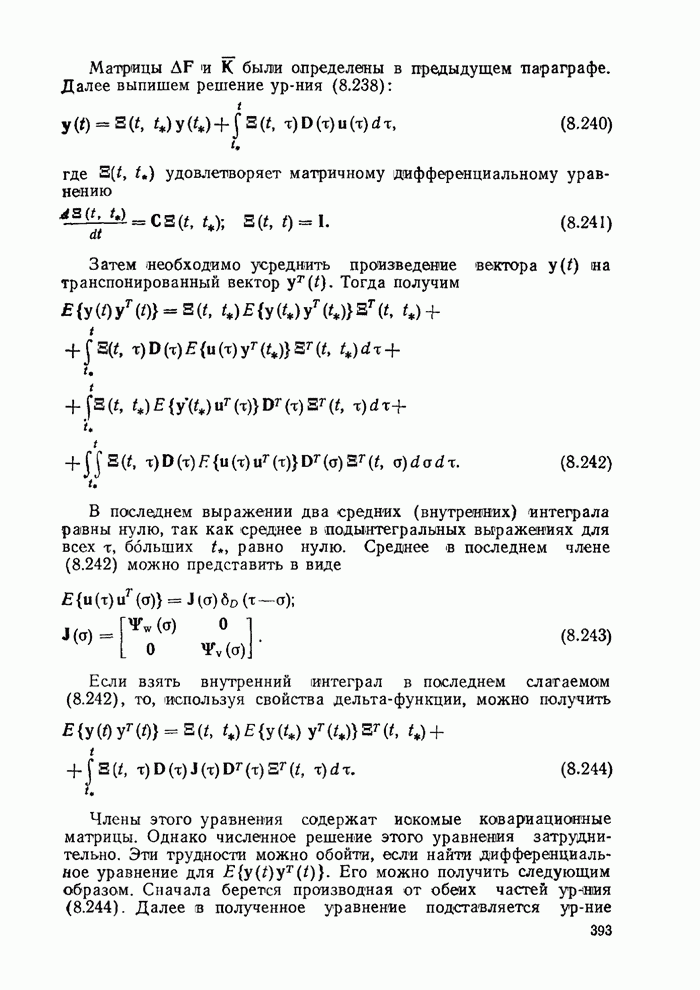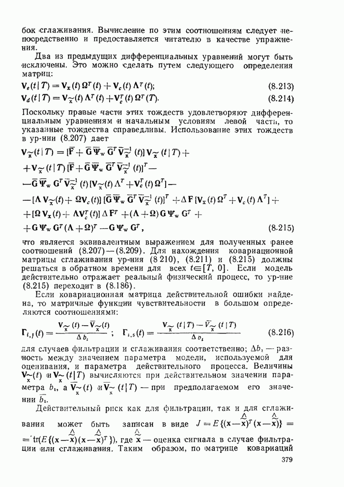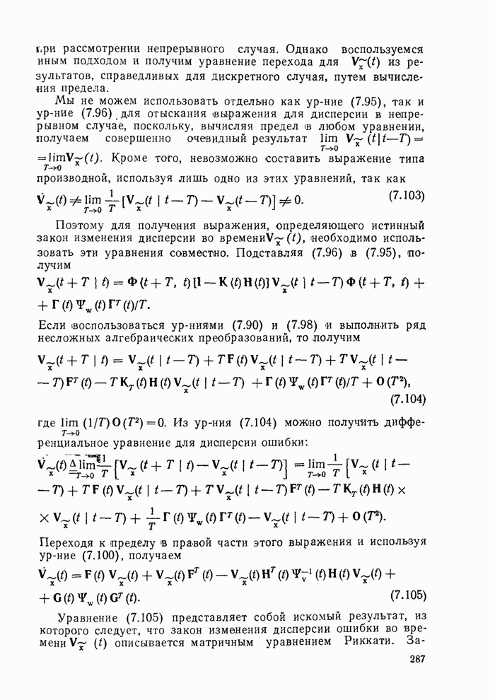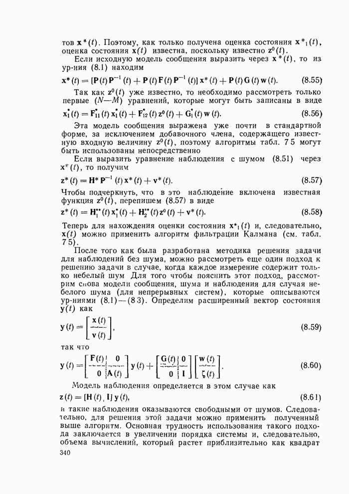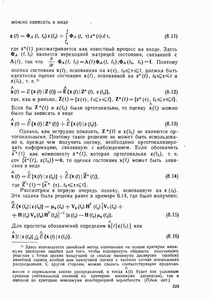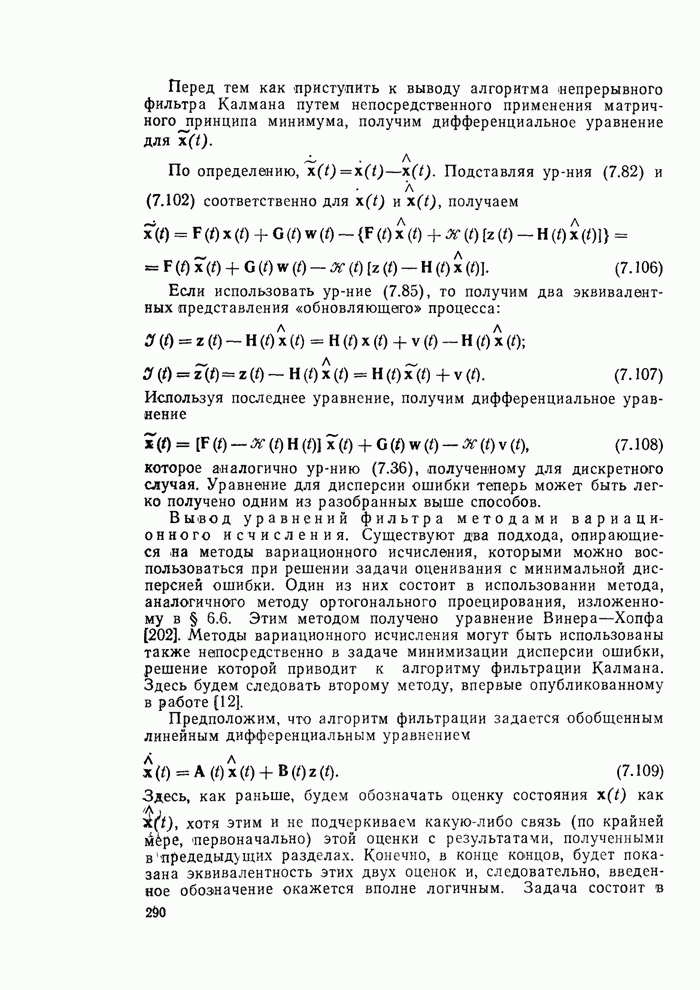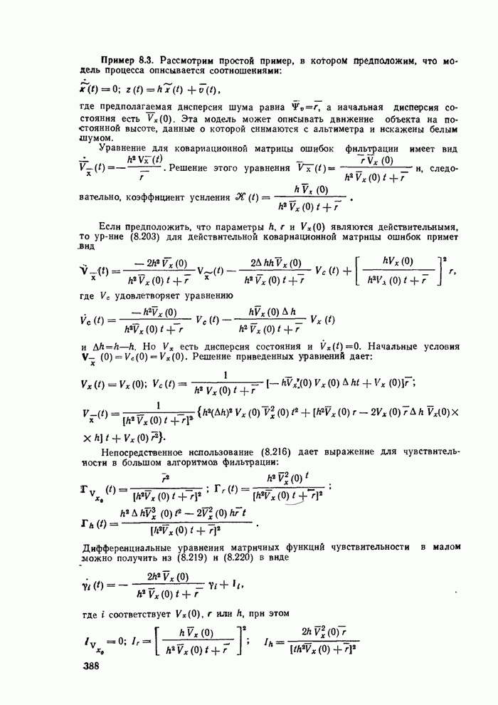 мы выбираем В заключение главы интересно, хотя бы вкратце, рассмотреть один из способов аналитического решения нелинейного уравнения дисперсии путем решения системы линейных матричных дифференциальных уравнений. В вычислительном отношении этот метод не представляет большой ценности, поскольку, за исключением случая стационарных моделей сообщения и наблюдений, получающиеся при этом уравнения не могут быть достаточно легко решены. С другой стороны, этот метод часто оказывается весьма полезным при формулировке общих выводов о характере решения уравнения дисперсии. Пусть