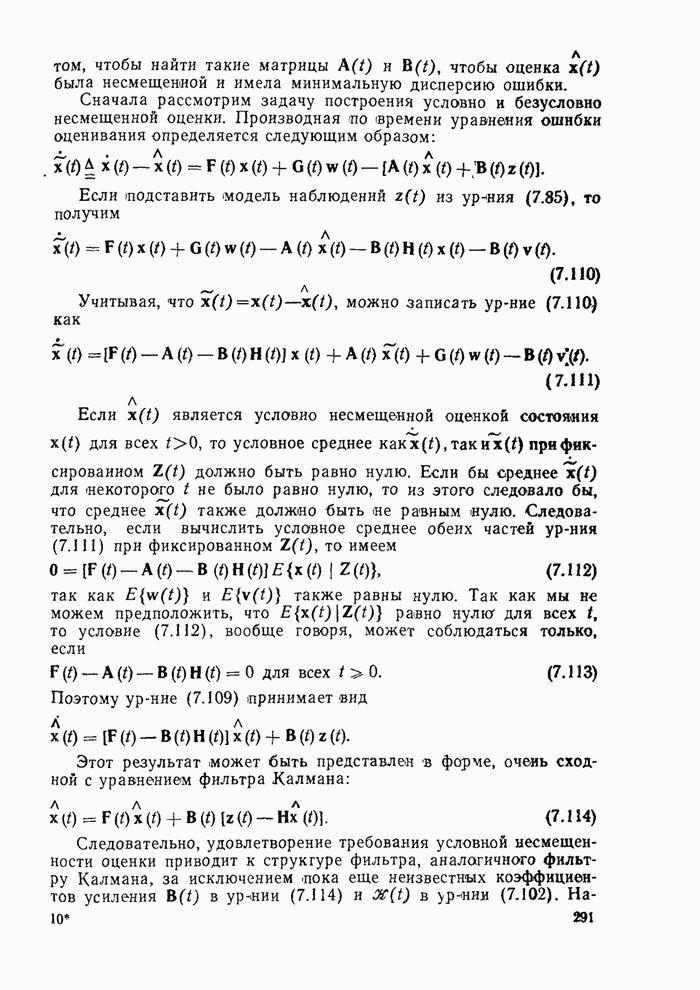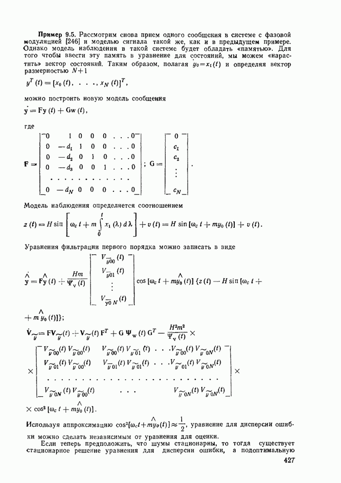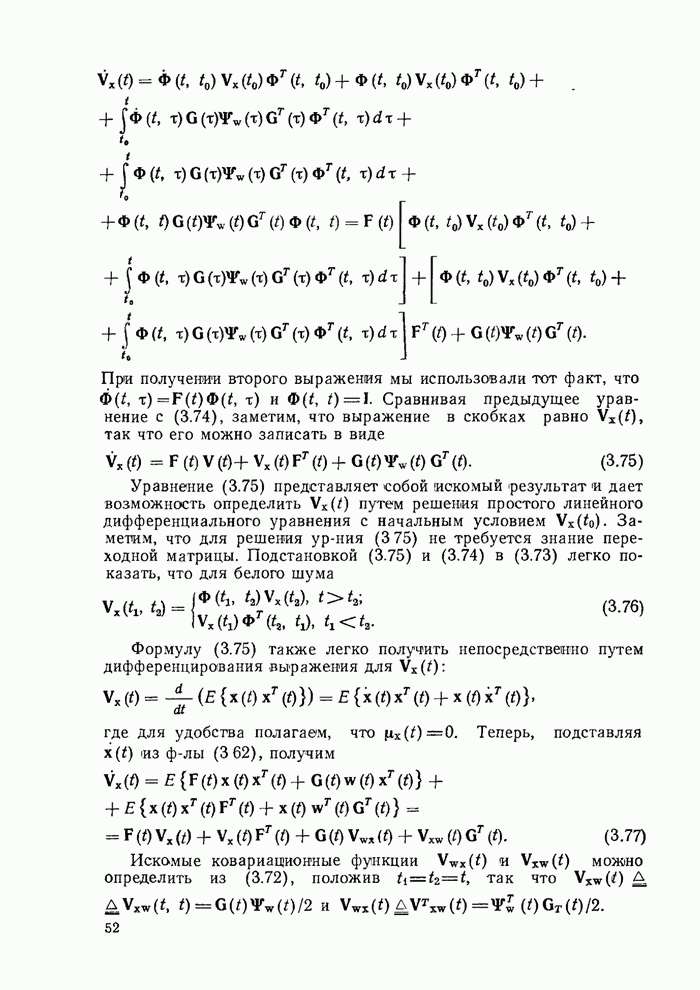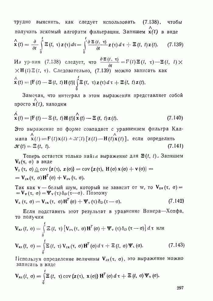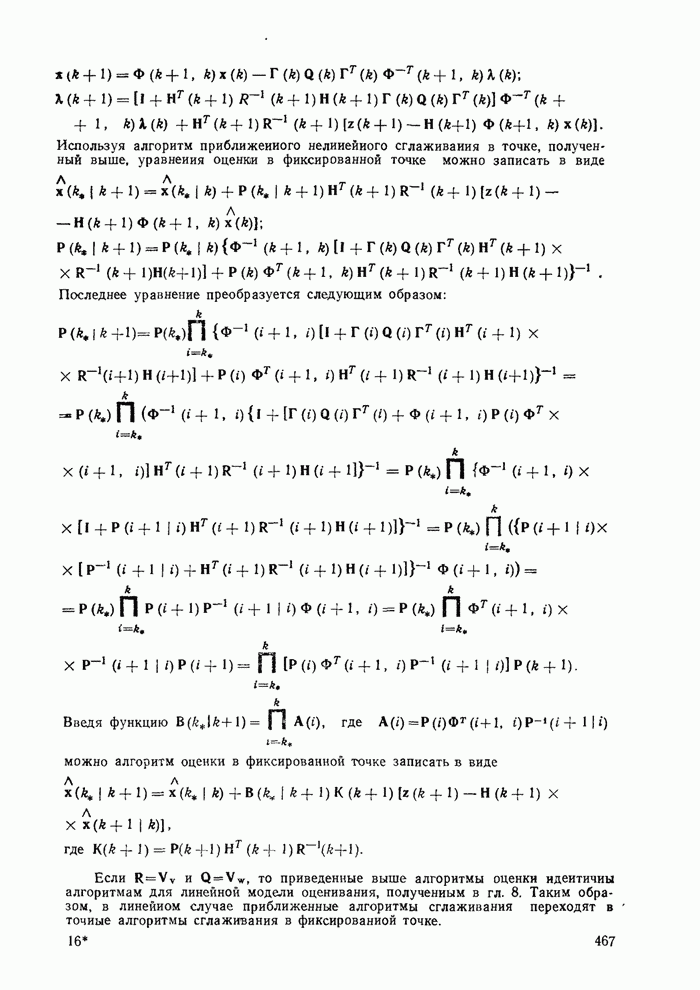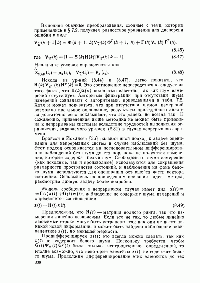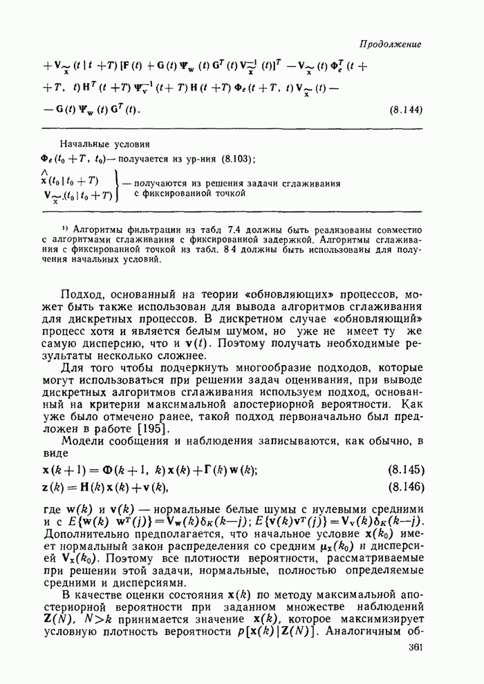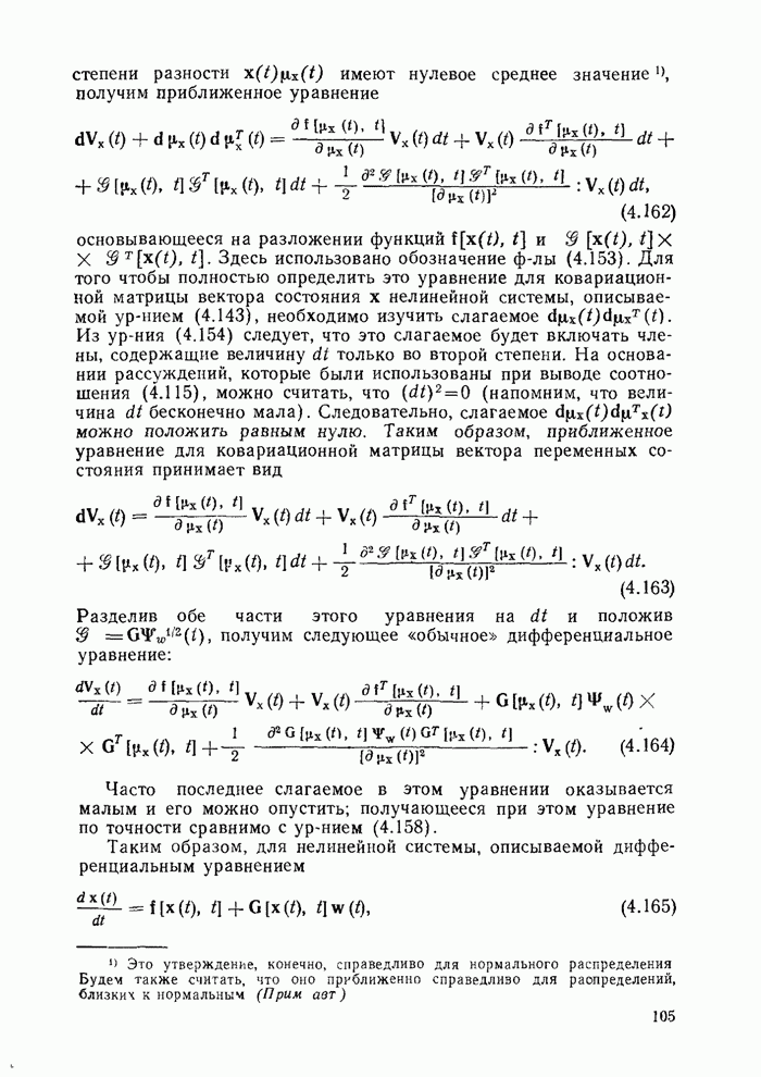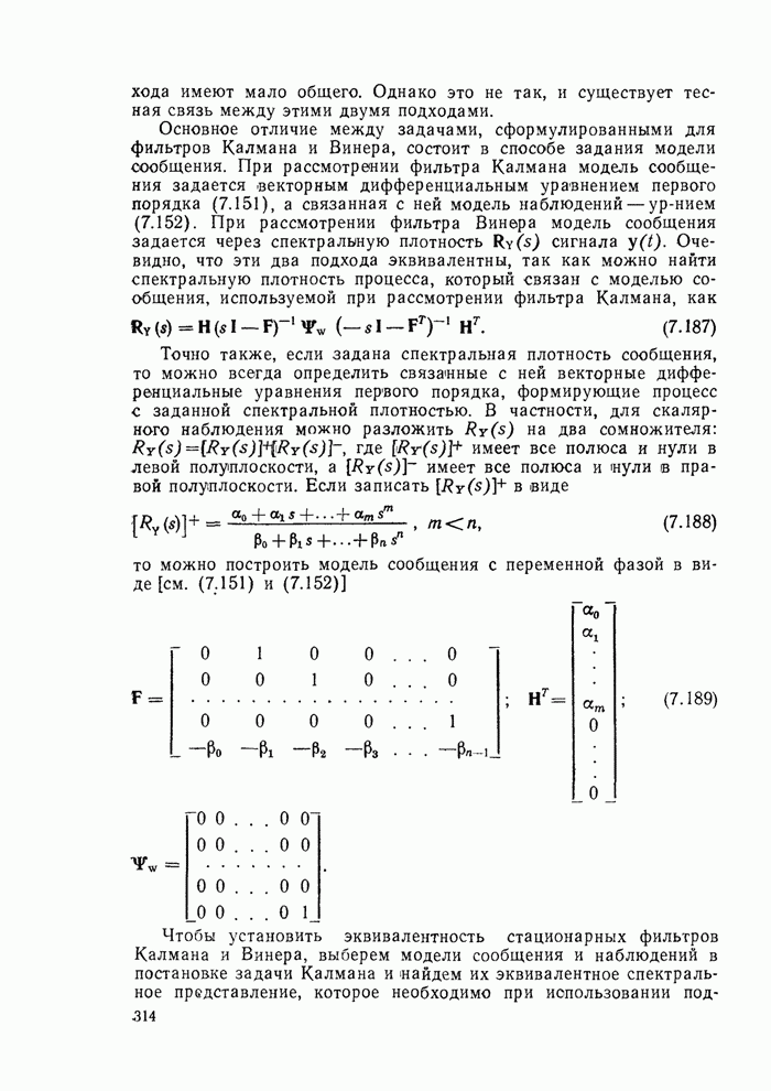 мы выбираем В заключение главы интересно, хотя бы вкратце, рассмотреть один из способов аналитического решения нелинейного уравнения дисперсии путем решения системы линейных матричных дифференциальных уравнений. В вычислительном отношении этот метод не представляет большой ценности, поскольку, за исключением случая стационарных моделей сообщения и наблюдений, получающиеся при этом уравнения не могут быть достаточно легко решены. С другой стороны, этот метод часто оказывается весьма полезным при формулировке общих выводов о характере решения уравнения дисперсии. Пусть
