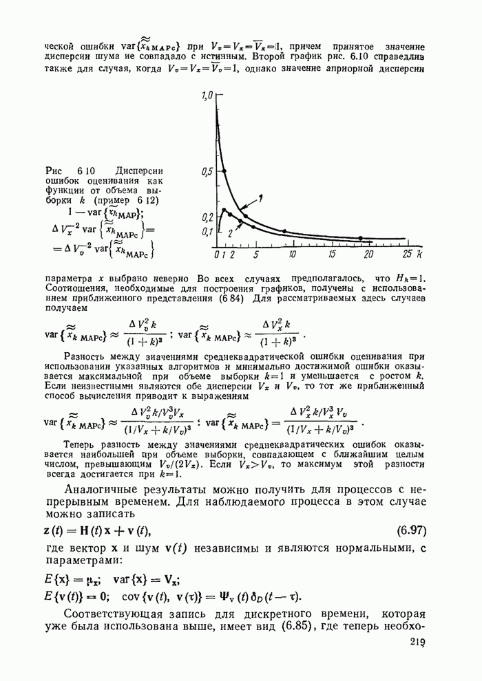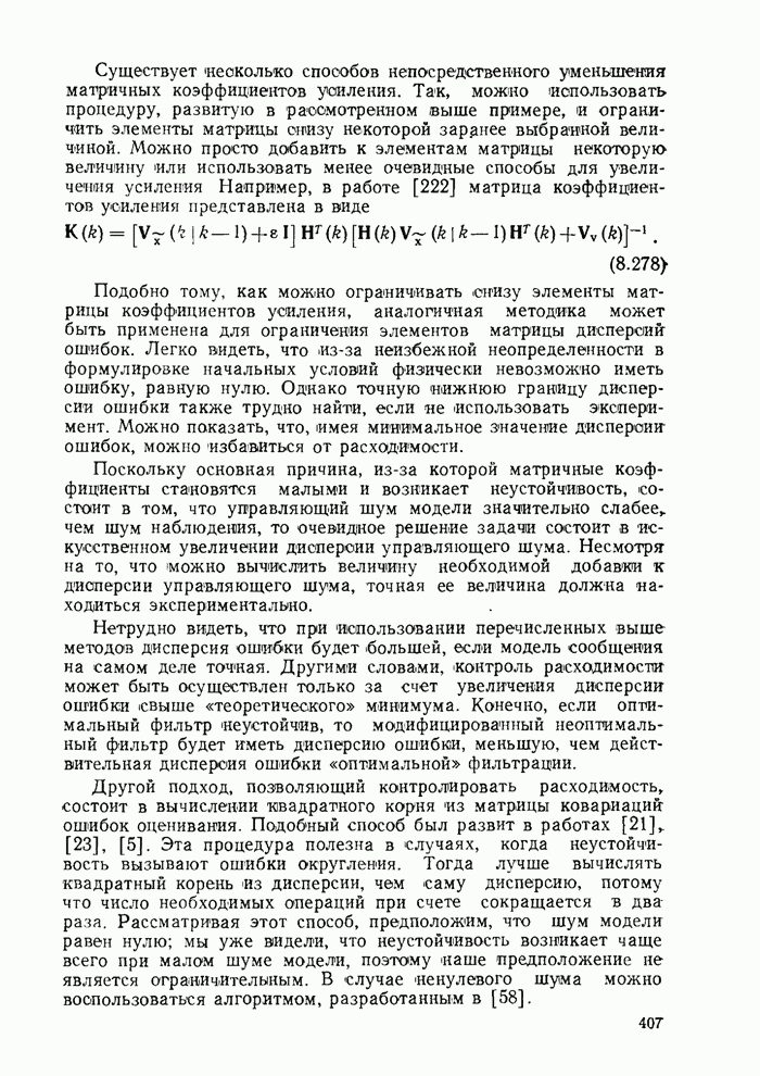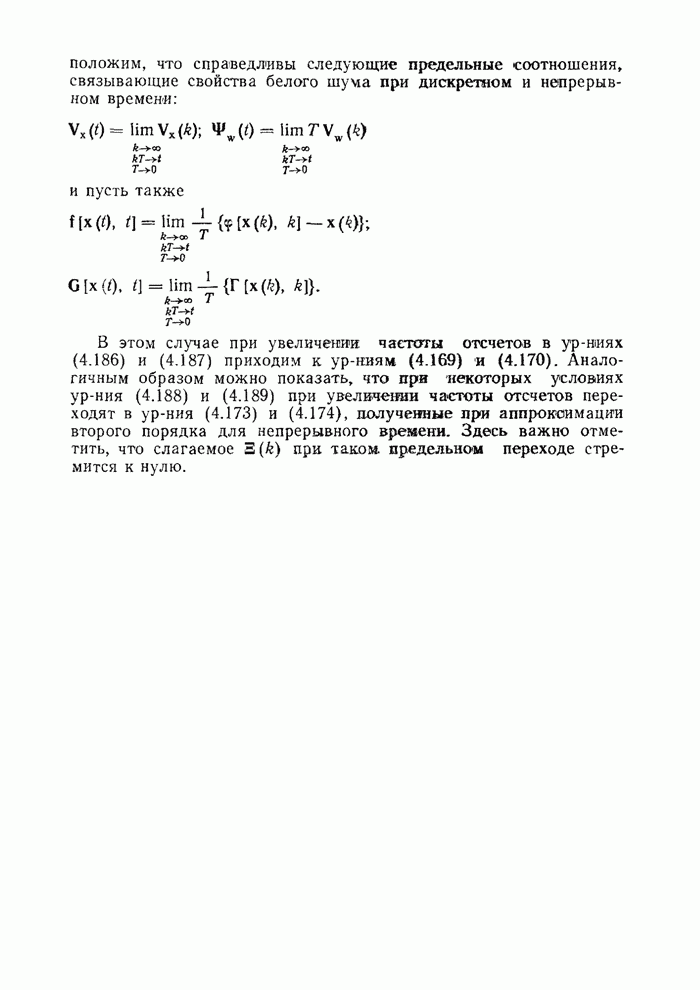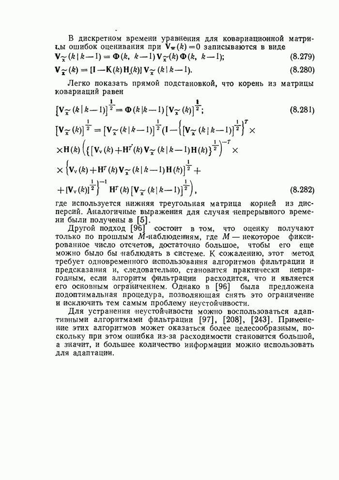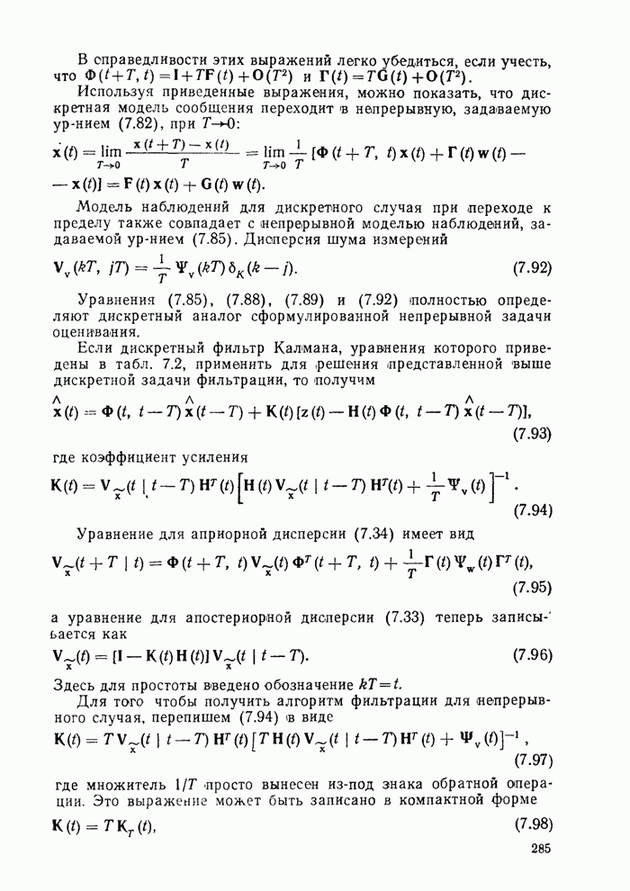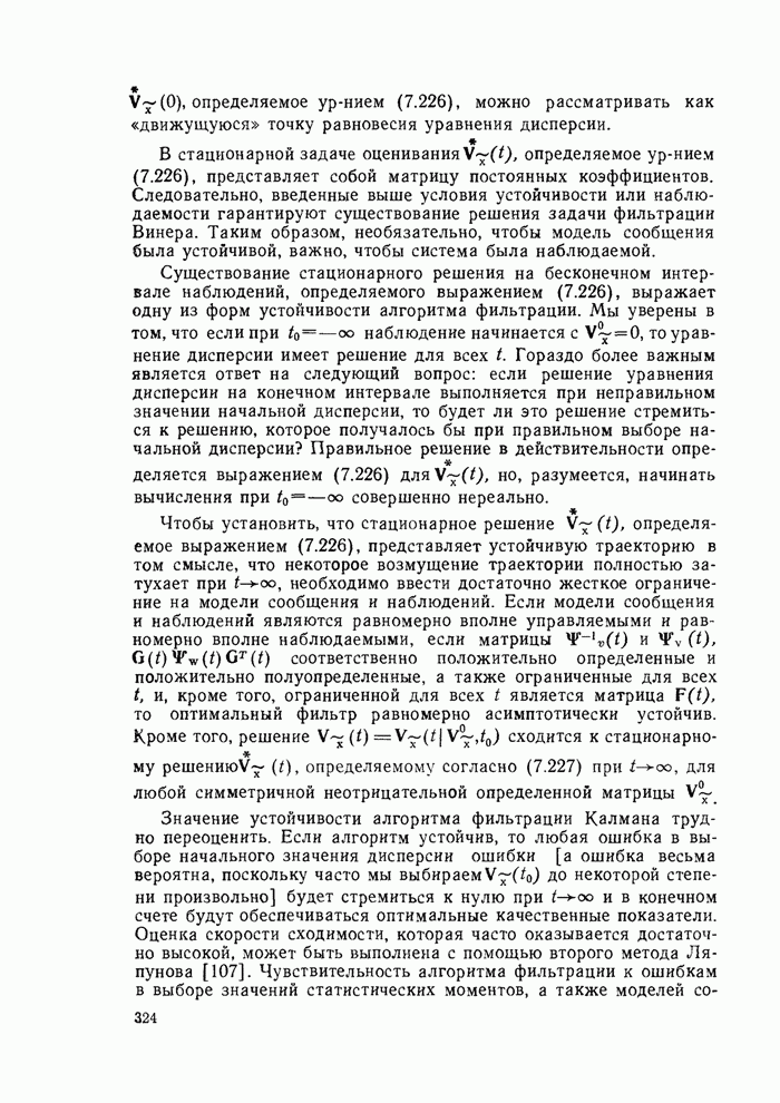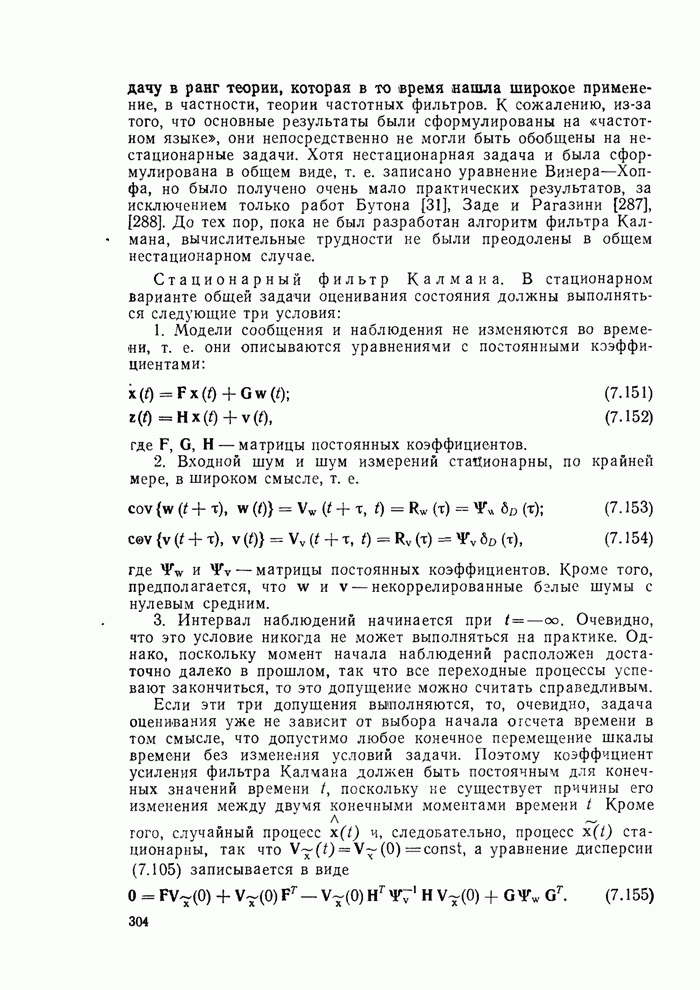 При изучении случайного процесса обычно можно сделать ряд утверждений относительно свойств процесса, таких, как непрерывность, ограниченность, используя понятие сходимости почти наверно или с вероятностью единица. При анализе поведения дисперсии ошибки оценивания можно избежать этих тонкостей, так как уравнение для дисперсии ошибки — детерминированное. Существуют два связанных друг с другом вопроса, касающиеся асимптотического поведения алгоритма фильтрации Калмана, которые будут рассмотрены в данном параграфе. Во-первых, определим условия существования стационарного решения уравнения дисперсии. Ответ на этот вопрос полезен тем, что он позволяет определить, когда существует решение стационарной задачи оценивания (задачи Винера), и указывает условия, выполнение которых необходимо для того, чтобы процесс оценивания оставался эффективным при увеличении интервала наблюдения. Второй и несомненно более важный