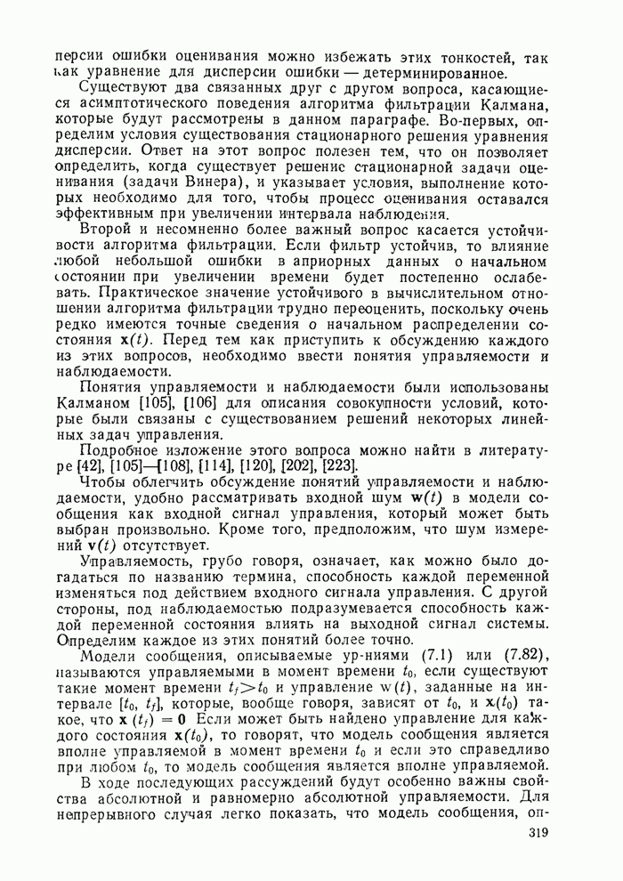 понятий управляемости и наблюдаемости, удобно рассматривать входной шум Управляемость, грубо говоря, означает, как можно было догадаться по названию термина, способность каждой переменной изменяться под действием входного сигнала управления. С другой стороны, под наблюдаемостью подразумевается способность каждой переменной состояния влиять на выходной сигнал системы. Определим каждое из этих понятий более точно. Модели сообщения, описываемые