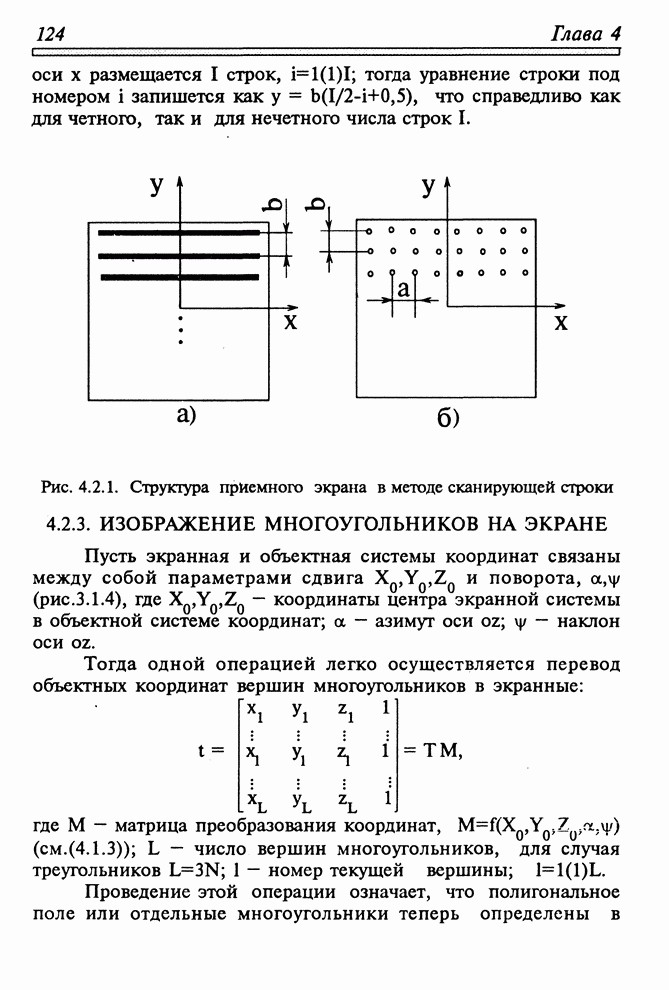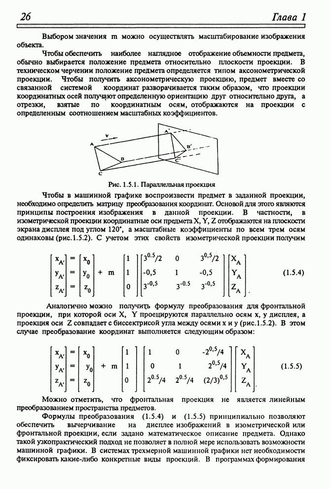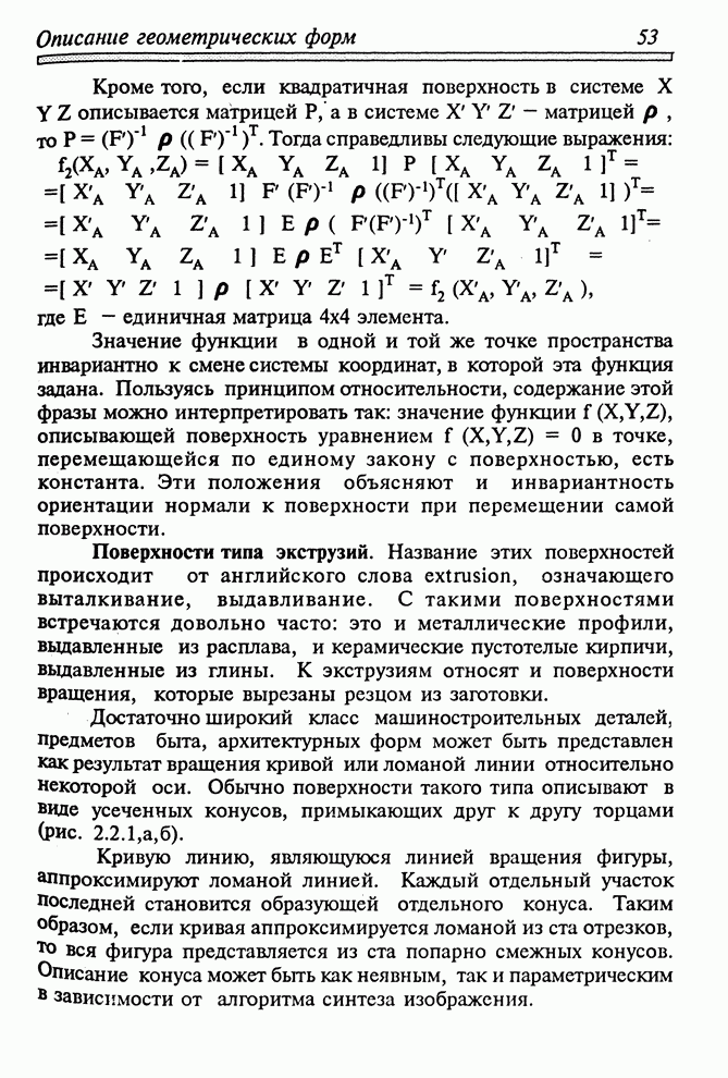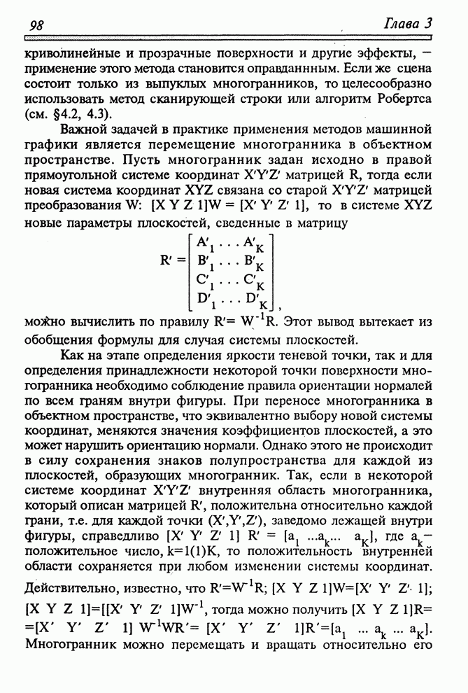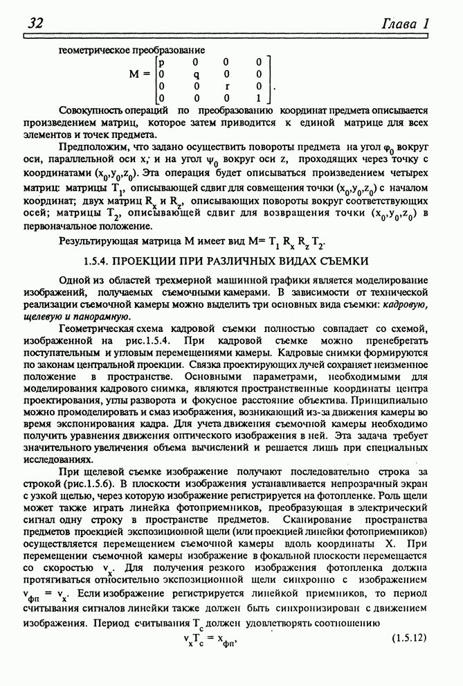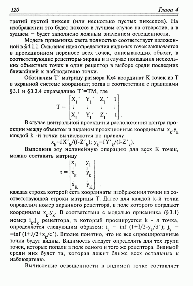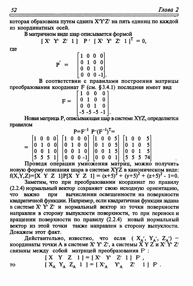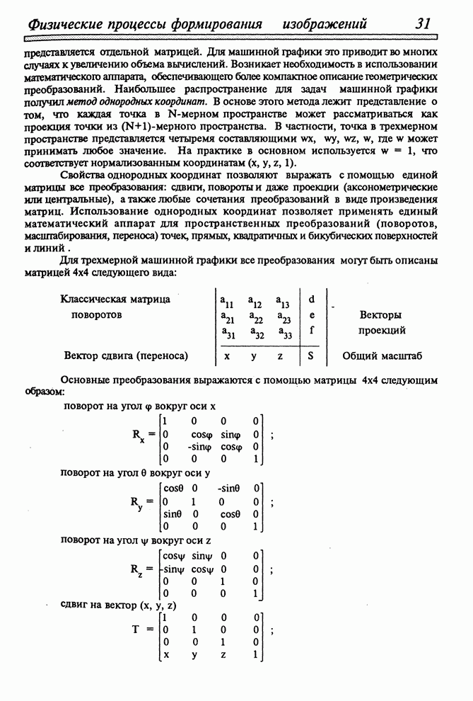 Здесь и далее часто используется представление координат точки в виде строки с четырьмя элементами. В данном случае четвертый элемент равен единице и не несет информационно полезной нагрузки. Такое представление обеспечивает универсальность метода для описания преобразований не только точек, но и прямых линий, отрезков прямых, кривых линий, плоскостей, участков плоскостей квадратичных и бикубических поверхностей.