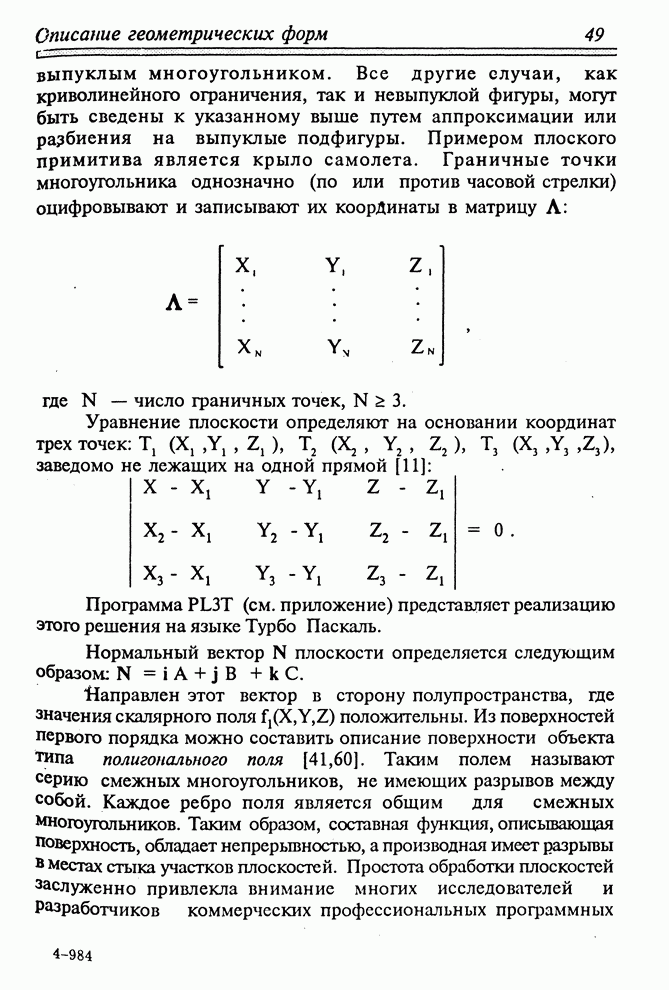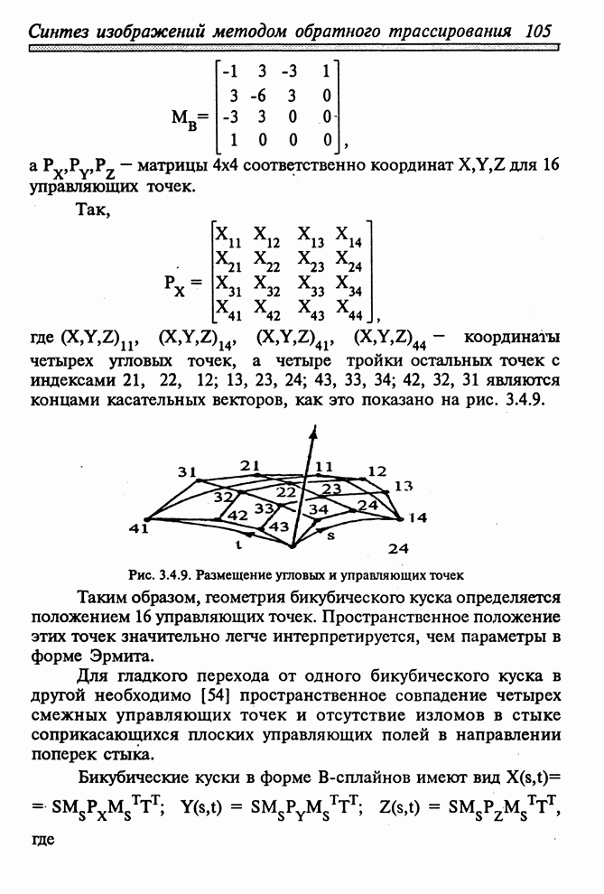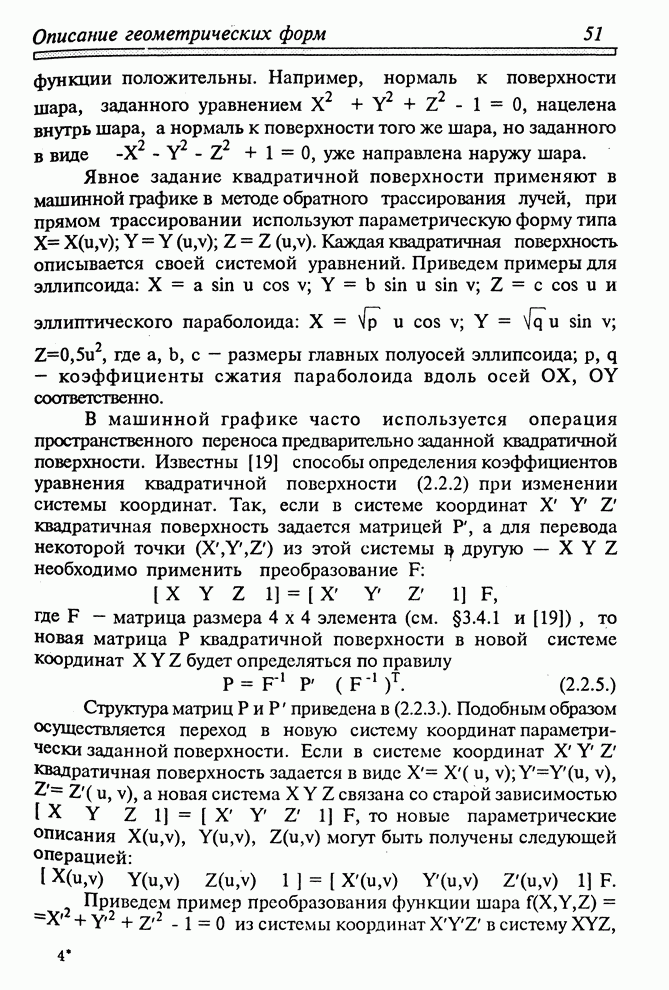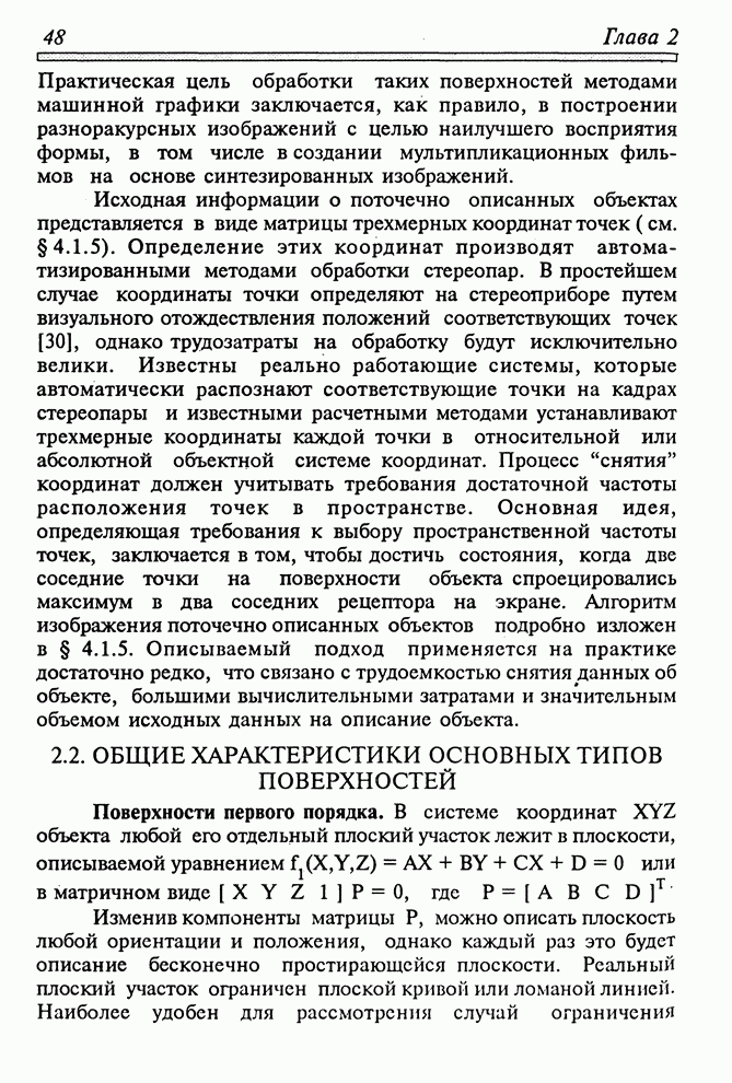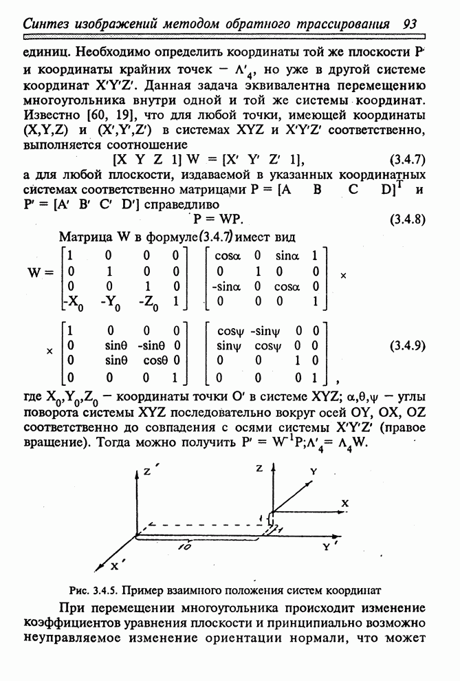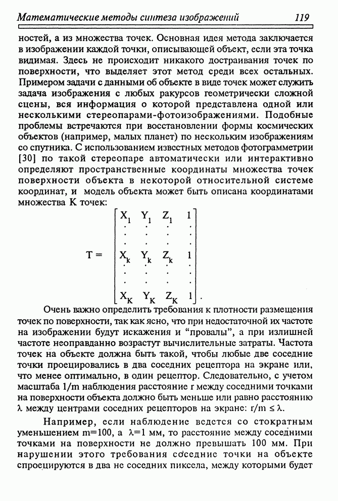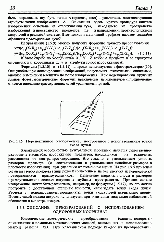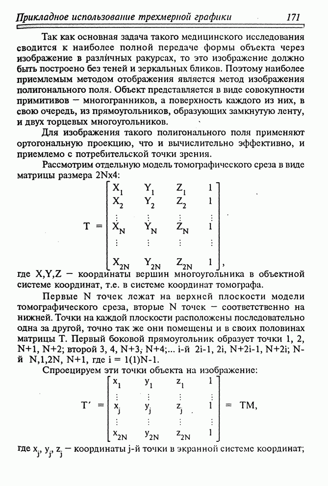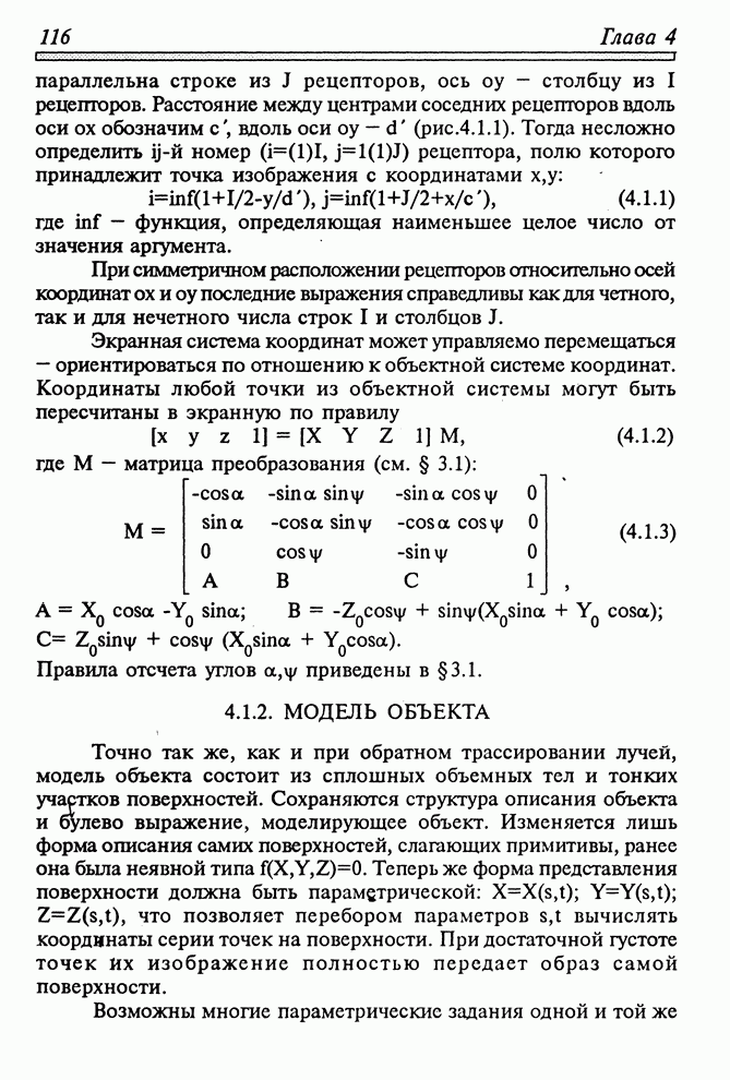 Здесь и далее часто используется представление координат точки в виде строки с четырьмя элементами. В данном случае четвертый элемент равен единице и не несет информационно полезной нагрузки. Такое представление обеспечивает универсальность метода для описания преобразований не только точек, но и прямых линий, отрезков прямых, кривых линий, плоскостей, участков плоскостей квадратичных и бикубических поверхностей.
