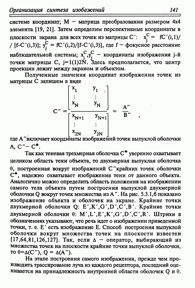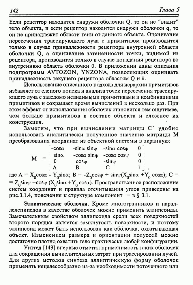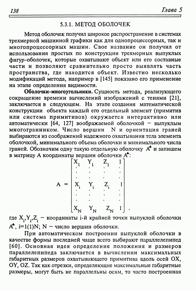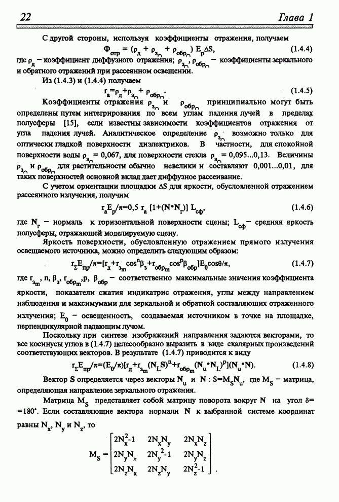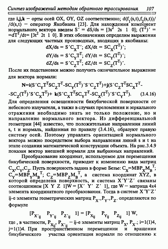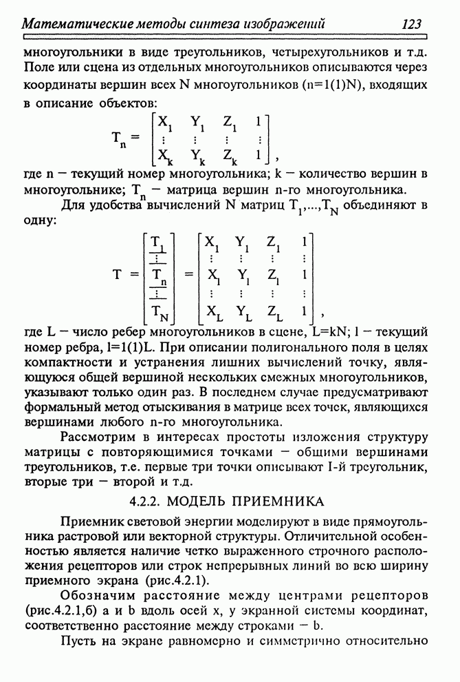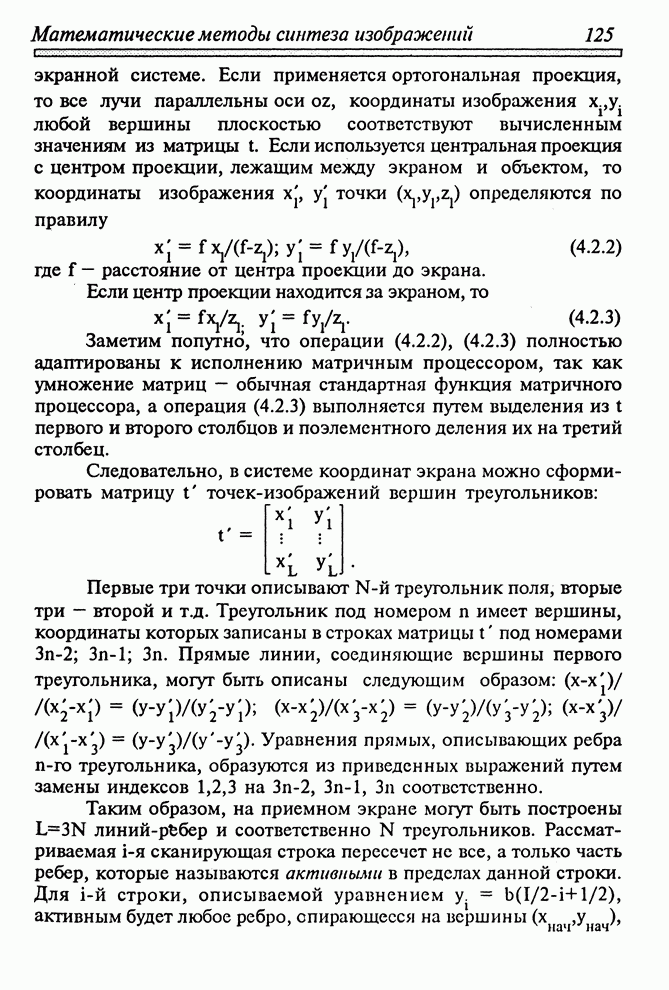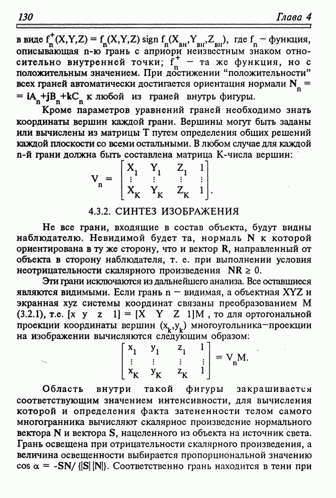 Здесь и далее часто используется представление координат точки в виде строки с четырьмя элементами. В данном случае четвертый элемент равен единице и не несет информационно полезной нагрузки. Такое представление обеспечивает универсальность метода для описания преобразований не только точек, но и прямых линий, отрезков прямых, кривых линий, плоскостей, участков плоскостей квадратичных и бикубических поверхностей.