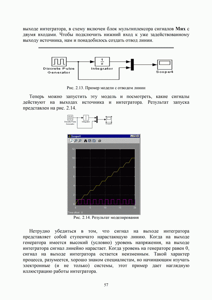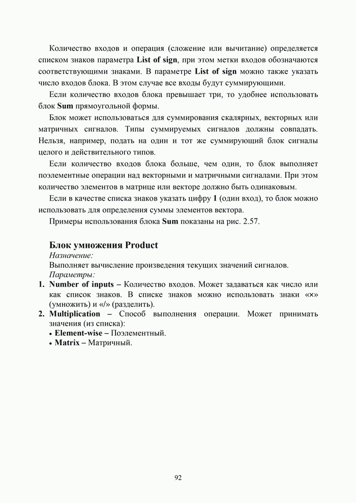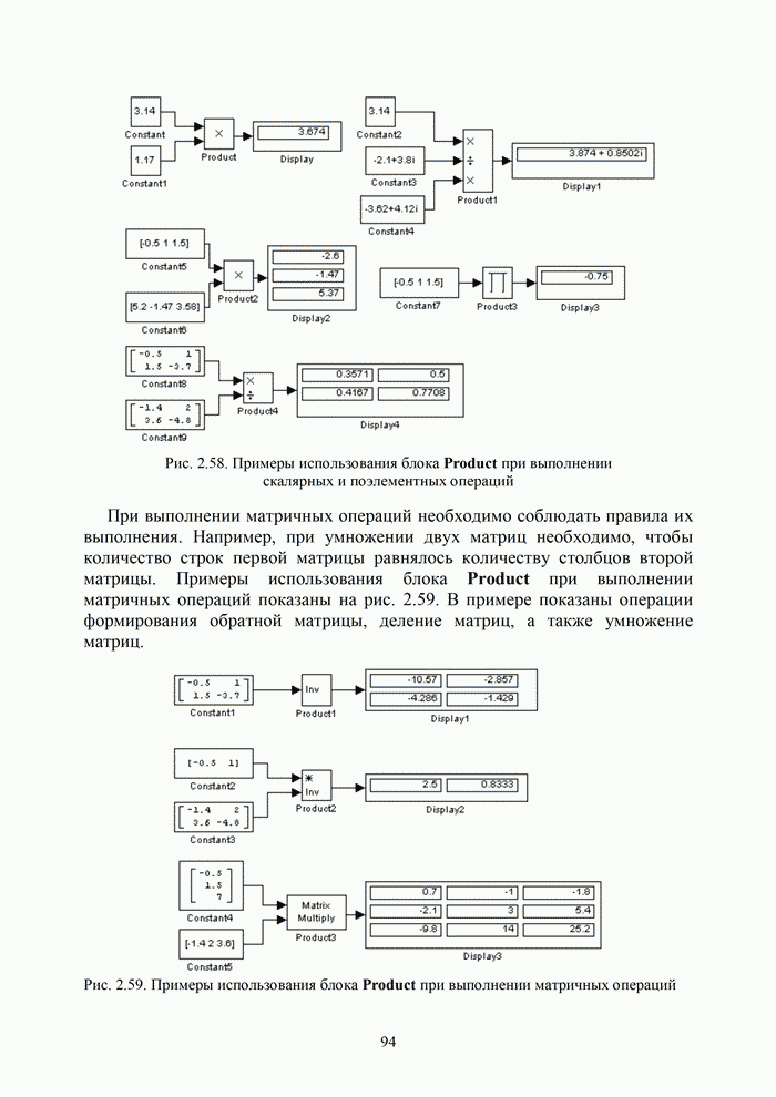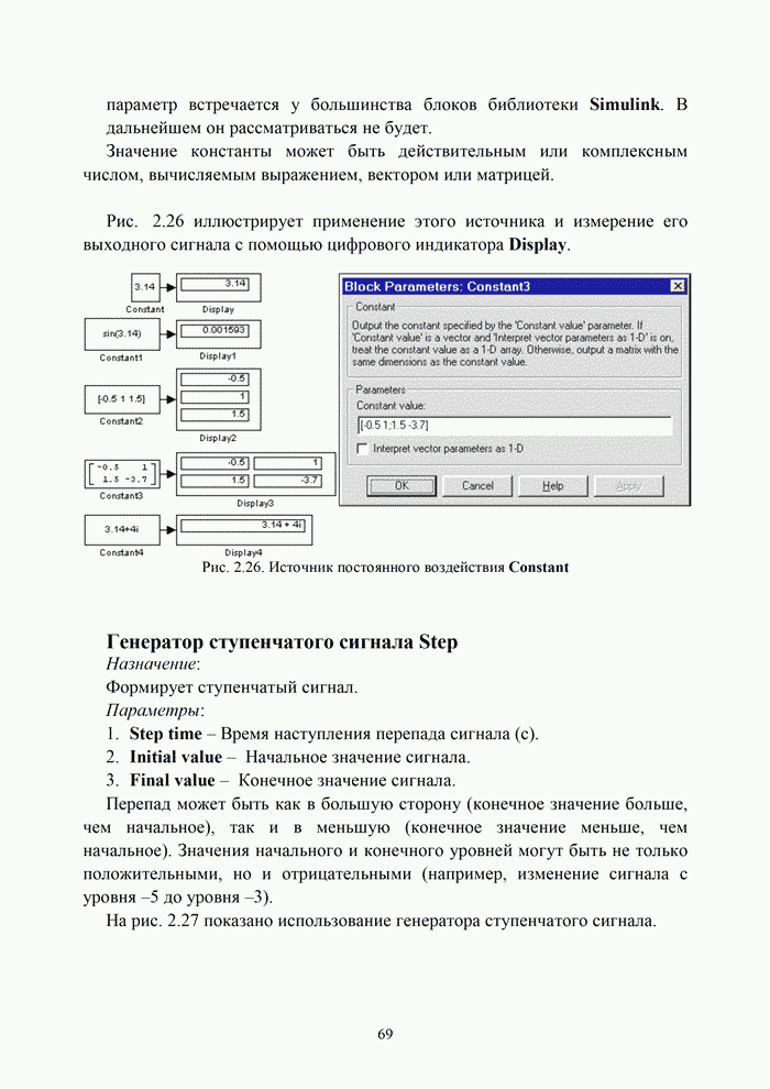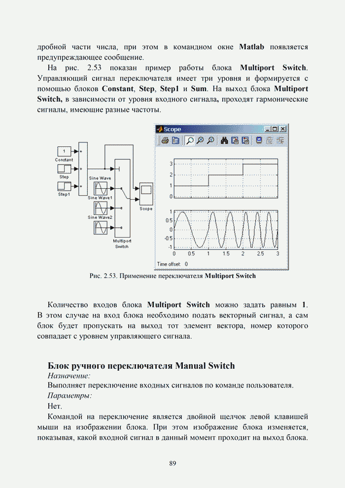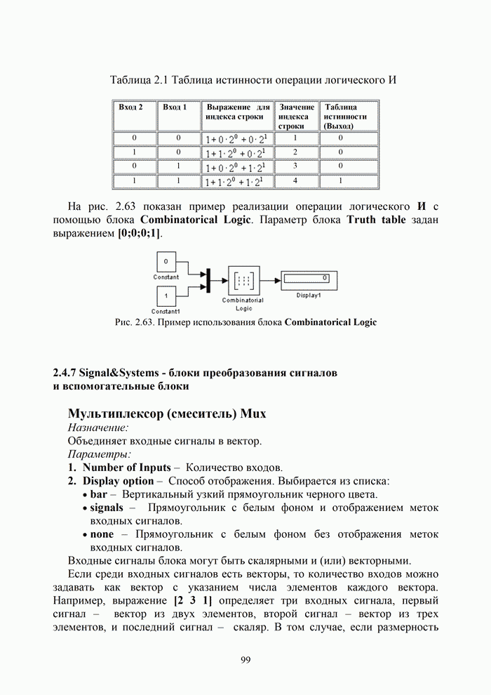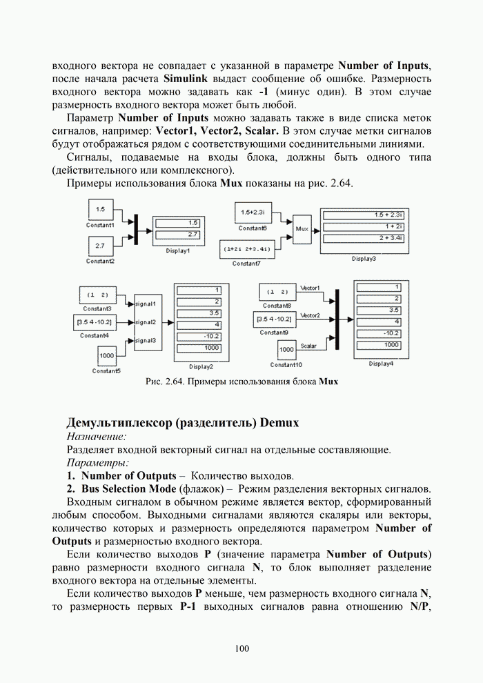 Если среди входных сигналов есть векторы, то количество входов можно задавать как вектор с указанием числа элементов каждого вектора. Например, выражение [2 3 1] определяет три входных сигнала, первый сигнал – вектор из двух элементов, второй сигнал – вектор из трех элементов, и последний сигнал – скаляр. В том случае, если размерность входного вектора не совпадает с указанной в параметре Number of Inputs, после начала расчета Simulink выдаст сообщение об ошибке. Размерность входного вектора можно задавать как -1 (минус один). В этом случае размерность входного вектора может быть любой. Параметр Number of Inputs можно задавать также в виде списка меток сигналов, например: Vector1, Vector2, Scalar. В этом случае метки сигналов будут отображаться рядом с соответствующими соединительными линиями. Сигналы, подаваемые на входы блока, должны быть одного типа (действительного или комплексного). Примеры использования блока Mux показаны на рис. 2.64.