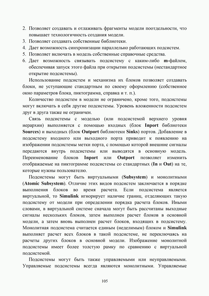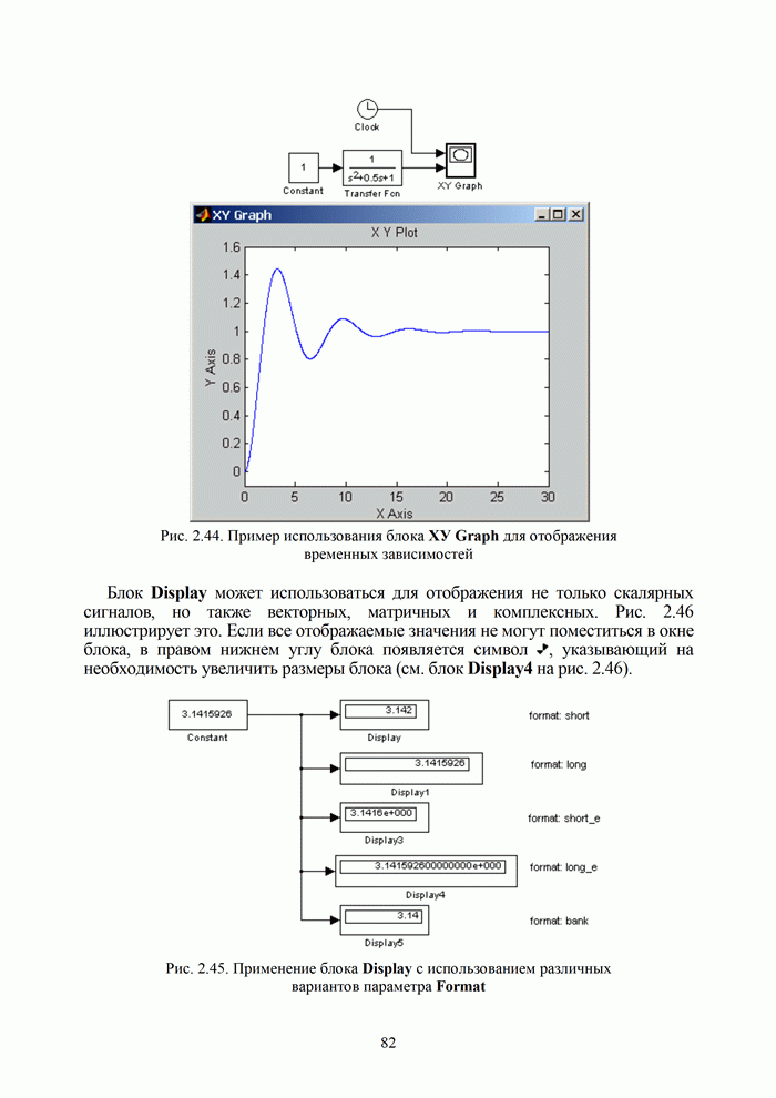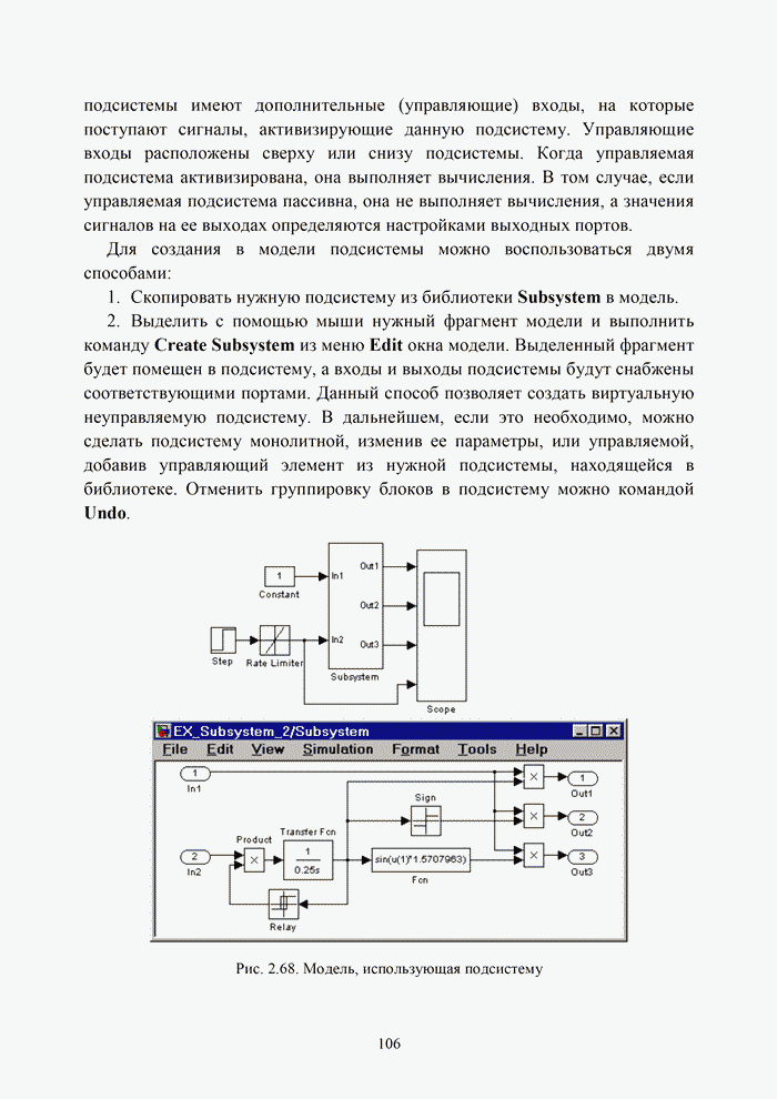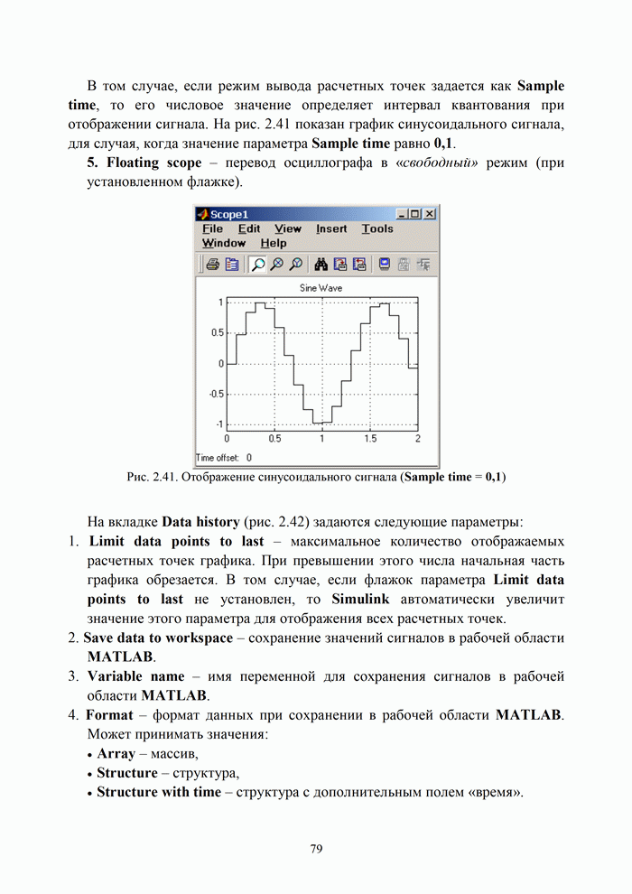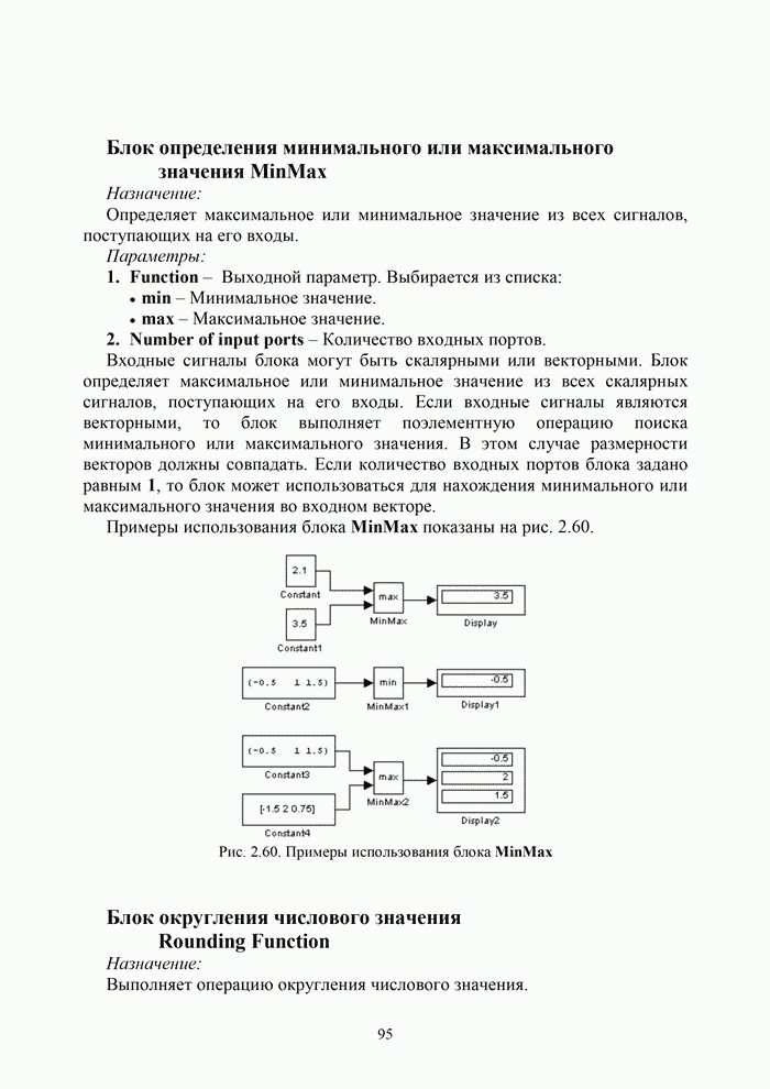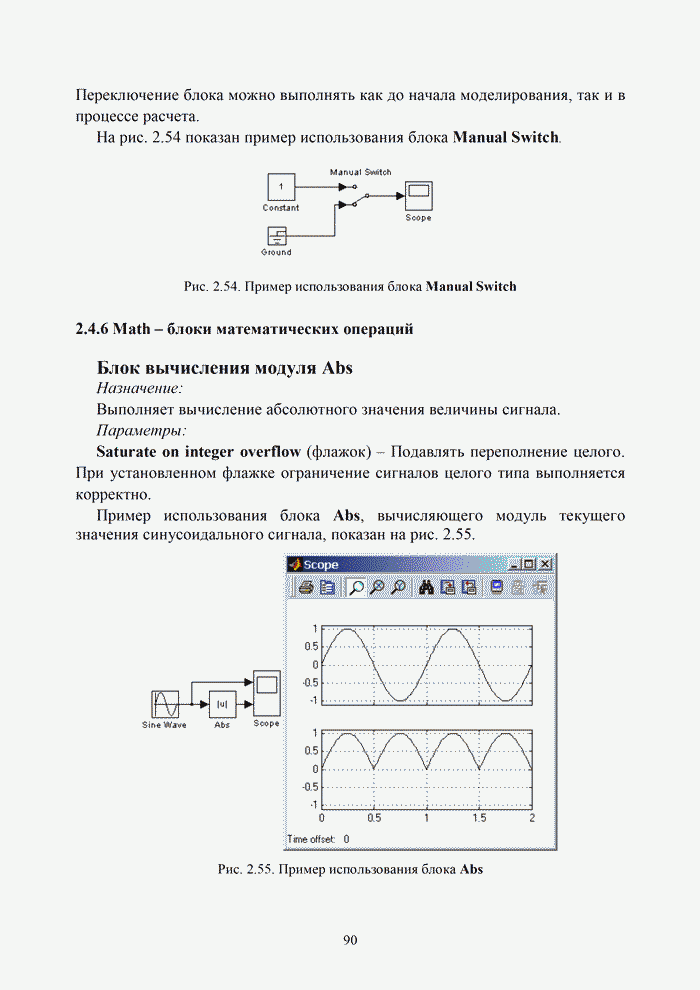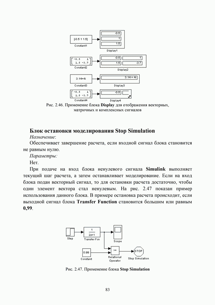 Если среди входных сигналов есть векторы, то количество входов можно задавать как вектор с указанием числа элементов каждого вектора. Например, выражение [2 3 1] определяет три входных сигнала, первый сигнал – вектор из двух элементов, второй сигнал – вектор из трех элементов, и последний сигнал – скаляр. В том случае, если размерность входного вектора не совпадает с указанной в параметре Number of Inputs, после начала расчета Simulink выдаст сообщение об ошибке. Размерность входного вектора можно задавать как -1 (минус один). В этом случае размерность входного вектора может быть любой. Параметр Number of Inputs можно задавать также в виде списка меток сигналов, например: Vector1, Vector2, Scalar. В этом случае метки сигналов будут отображаться рядом с соответствующими соединительными линиями. Сигналы, подаваемые на входы блока, должны быть одного типа (действительного или комплексного). Примеры использования блока Mux показаны на рис. 2.64.