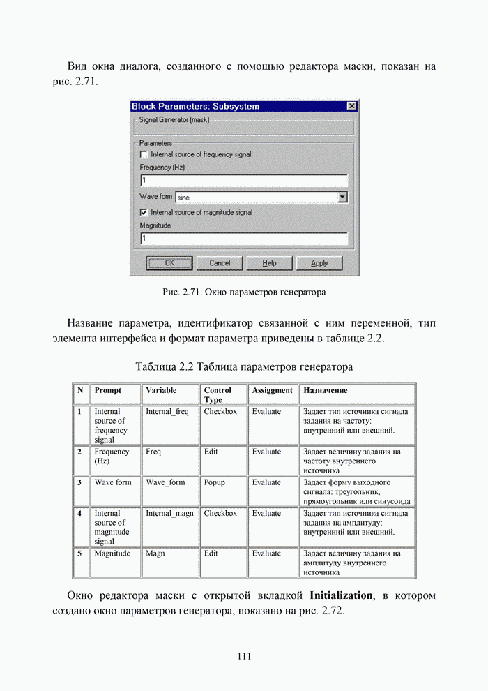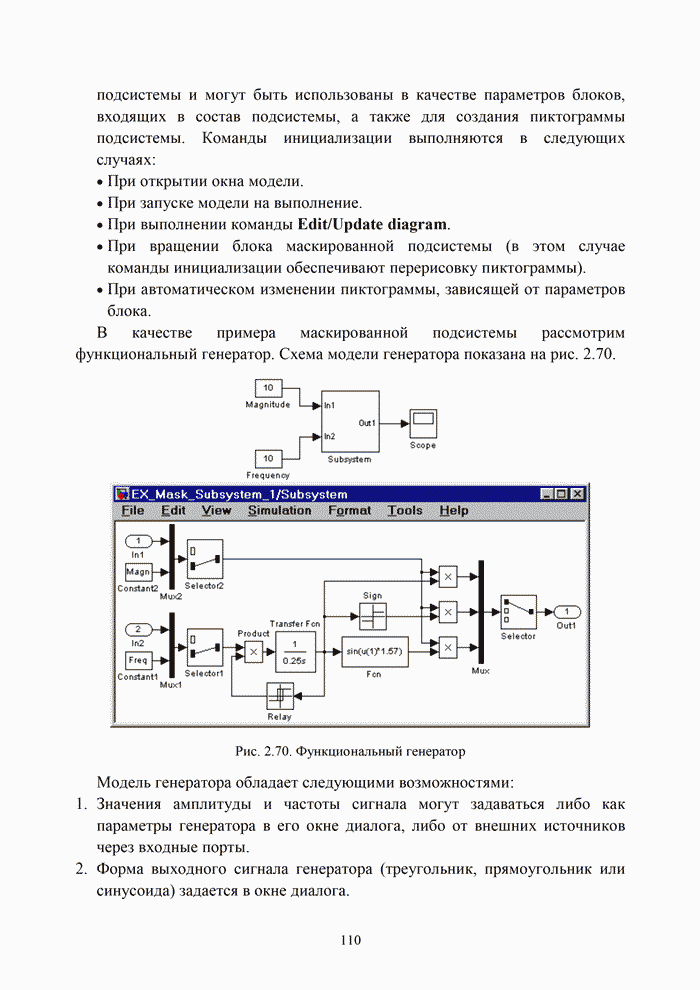 Демультиплексор (разделитель) Demux Назначение: Разделяет входной векторный сигнал на отдельные составляющие. Параметры: 1. Number of Outputs – Количество выходов. 2. Bus Selection Mode (флажок) – Режим разделения векторных сигналов. Входным сигналом в обычном режиме является вектор, сформированный любым способом. Выходными сигналами являются скаляры или векторы, количество которых и размерность определяются параметром Number of Outputs и размерностью входного вектора. Если количество выходов P (значение параметра Number of Outputs) равно размерности входного сигнала N, то блок выполняет разделение входного вектора на отдельные элементы. Если количество выходов P меньше, чем размерность входного сигнала N, то размерность первых P-1 выходных сигналов равна отношению N/P, округленному до ближайшего большего числа, а размерность последнего выходного сигнала равна разности между размерностью входного сигнала и суммой размерностей первых P-1 выходов. Например, если размерность входного сигнала равна восьми, а количество выходов равно трем, то первые два выходных вектора будут иметь размерность ceil(8/3) = 3, а последний выходной вектор будет иметь размерность 8 - (3+3) = 2. Параметр Number of Outputs может быть задан также с помощью вектора, определяющего размерность каждого выходного сигнала. Например, выражение [2 3 1] определяет три выходных сигнала, первый сигнал – вектор из двух элементов, второй сигнал - вектор из трех элементов, и последний сигнал – скаляр. Размерность можно также задавать как -1 (минус один). В этом случае размерность соответствующего выходного сигнала определяется как разность между размерностью входного вектора и суммой размерностей заданных выходных сигналов. Например, если размерность входного вектора равна шести, а параметр Number of Outputs задан выражением [1 -1 3], то второй выходной сигнал будет иметь размерность 6 - (3+1) = 2. Примеры использования блока Demux показаны на рис. 2.65.