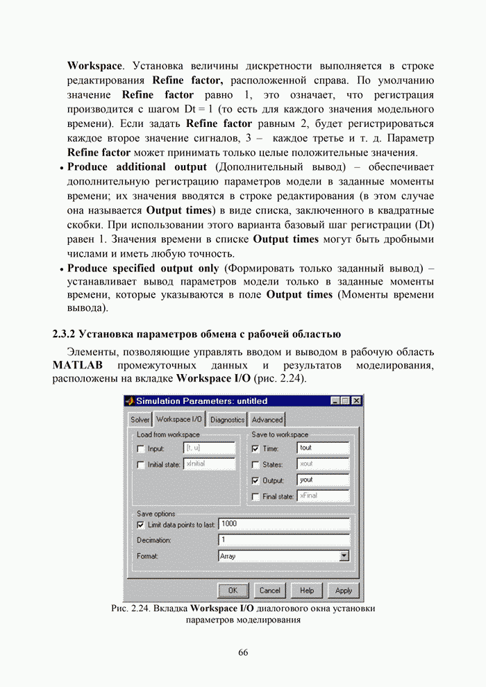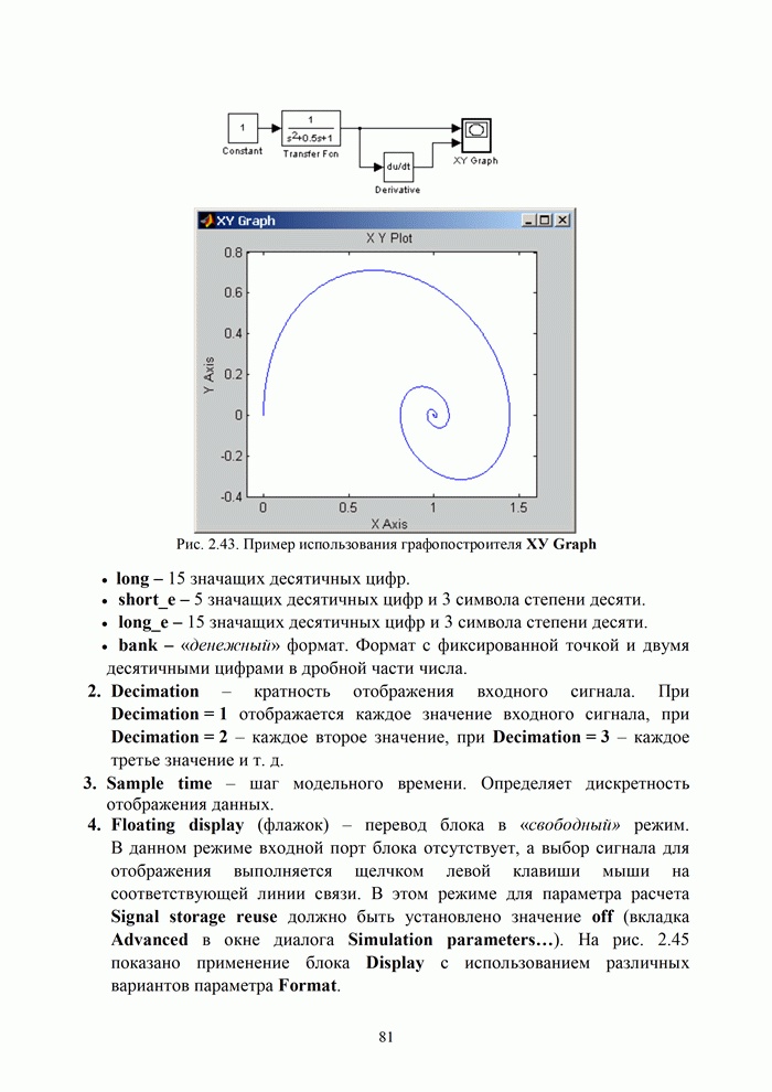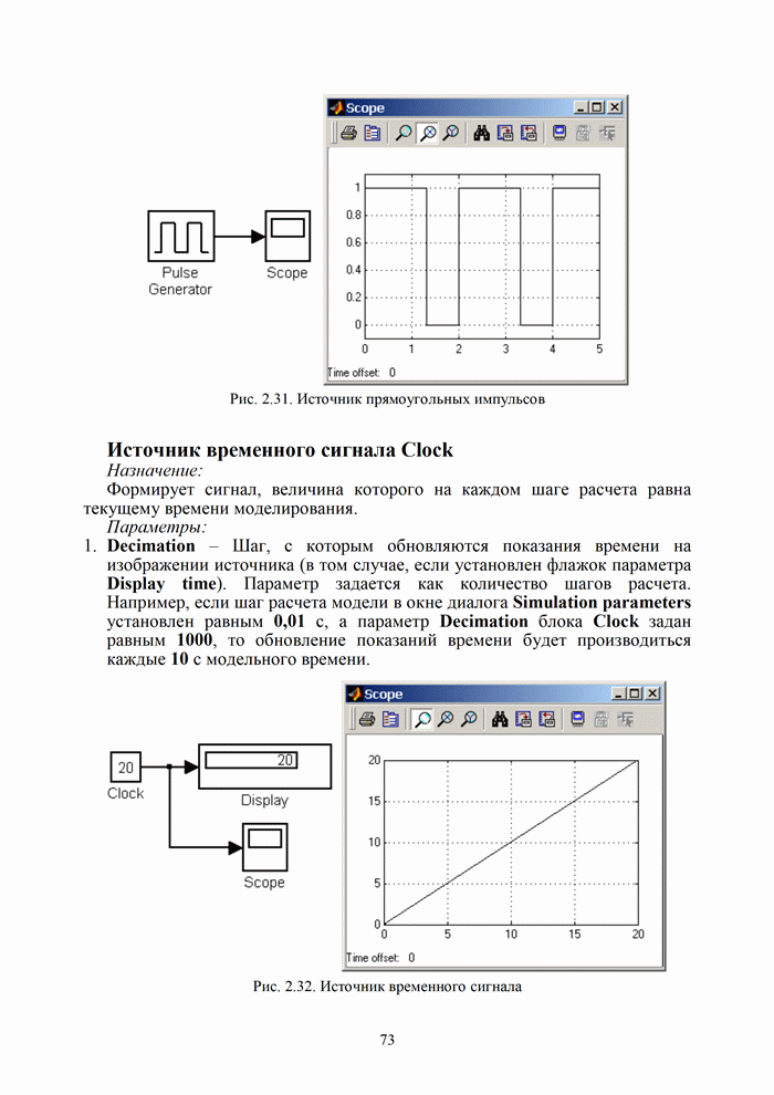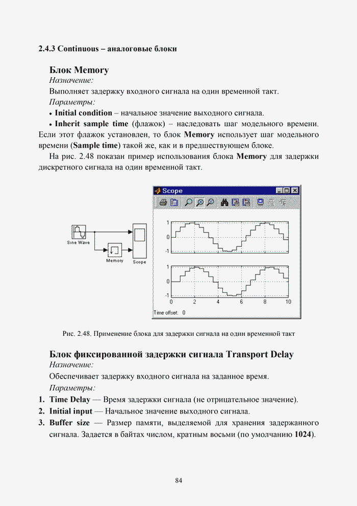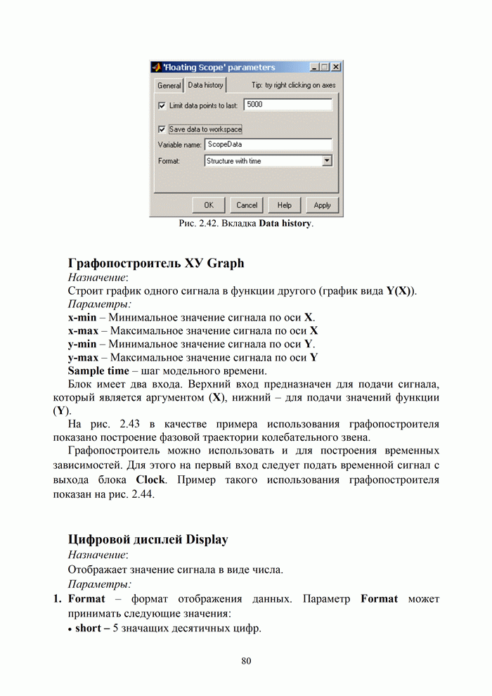 Блок создания общей области памяти Data Store Memory Назначение: Блок создает поименованную область памяти для хранения данных. Параметры: 1. Data store nаmе – Имя области памяти. 2. Initial value – Начальное значение. 3. Interpret vector parameters as 1-D (флажок) – Интерпретировать вектор параметров данных как одномерный вектор. Блок используется совместно с блоками Data Store Write (запись данных) и Data Store Read (считывание данных). Параметр Initial value задает не только начальное значение сигнала, но и его размерность. Например, если начальное значение сигнала задано матрицей [0 1; 2 3], то сохраняемый сигнал должен быть матрицей 2´2. Если блок Data Store Memory расположен в модели верхнего уровня, то заданную им область памяти можно использовать как в самой модели, так и во всех подсистемах нижнего уровня иерархии. Если блок Data Store Memory расположен в подсистеме, то заданную им область памяти можно использовать в данной подсистеме и во всех подсистемах нижнего уровня иерархии. Блок работает с действительными сигналами типа double. Пример использования блока Data Store Memory совместно с блоками Data Store Write и Data Store Read показан на рис. 2.67.