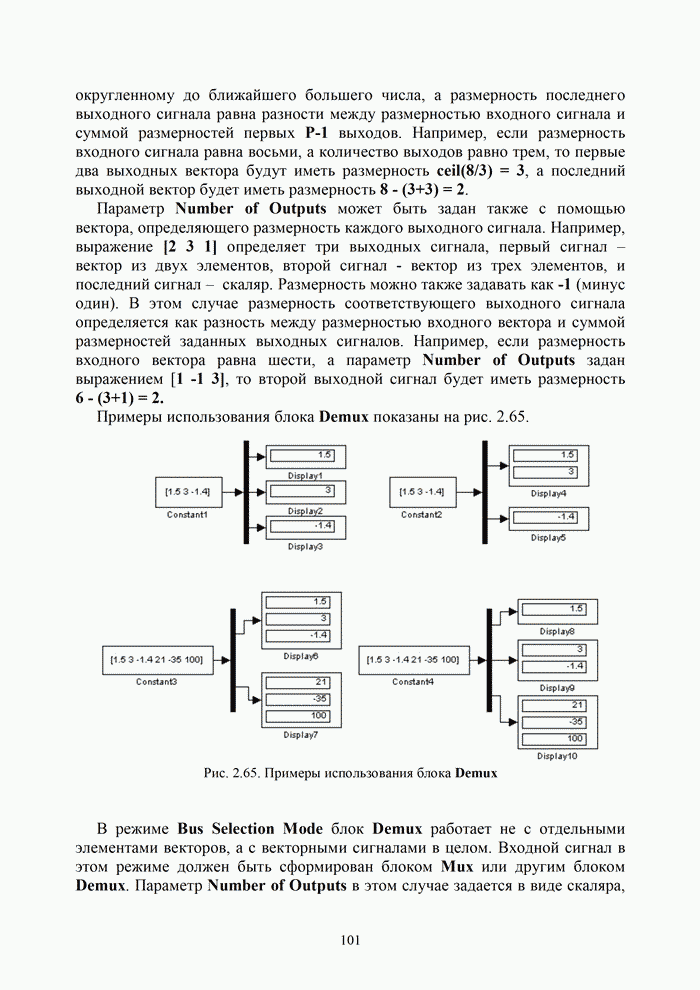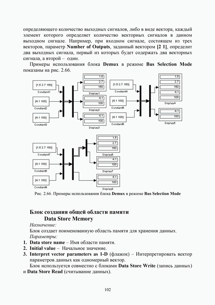 В режиме Bus Selection Mode блок Demux работает не с отдельными элементами векторов, а с векторными сигналами в целом. Входной сигнал в этом режиме должен быть сформирован блоком Mux или другим блоком Demux. Параметр Number of Outputs в этом случае задается в виде скаляра, определяющего количество выходных сигналов, либо в виде вектора, каждый элемент которого определяет количество векторных сигналов в данном выходном сигнале. Например, при входном сигнале, состоящем из трех векторов, параметр Number of Outputs, заданный вектором [2 1], определит два выходных сигнала, первый из которых будет содержать два векторных сигнала, а второй – один. Примеры использования блока Demux в режиме Bus Selection Mode показаны на рис. 2.66.