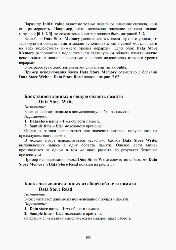 Блок записи данных в общую область памяти Data Store Write Назначение: Блок записывает данные в поименованную область памяти. Параметры: 1. Data store nаmе – Имя области памяти. 2. Sample time – Шаг модельного времени. Операция записи выполняется для значения сигнала, полученного на предыдущем шаге расчета. В модели могут использоваться несколько блоков Data Store Write, выполняющих запись в одну область памяти. Однако, если запись производится на одном и том же шаге расчета, то результат будет не предсказуем. Пример использования блока Data Store Write совместно с блоками Data Store Memory и Data Store Read показан на рис. 2.67.