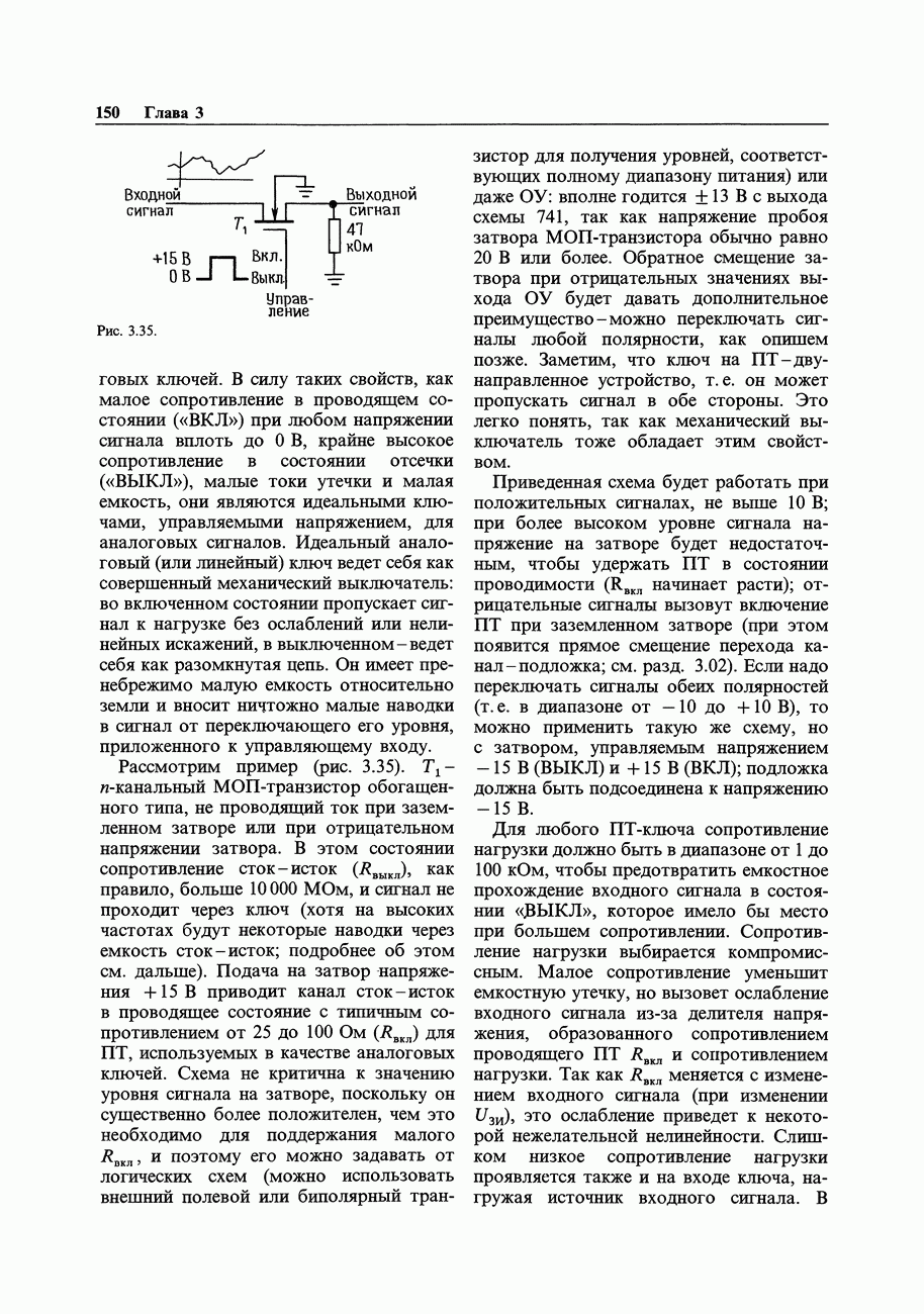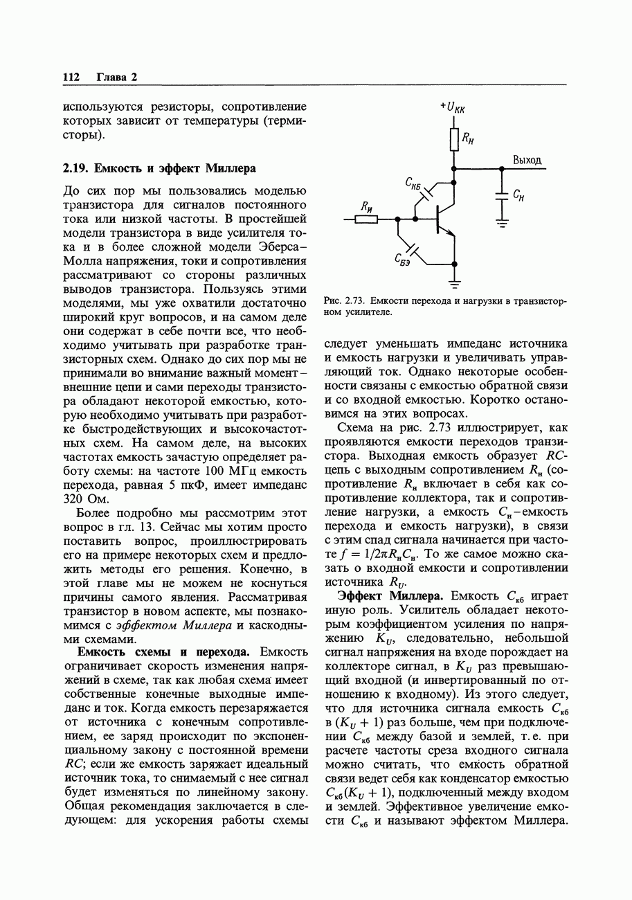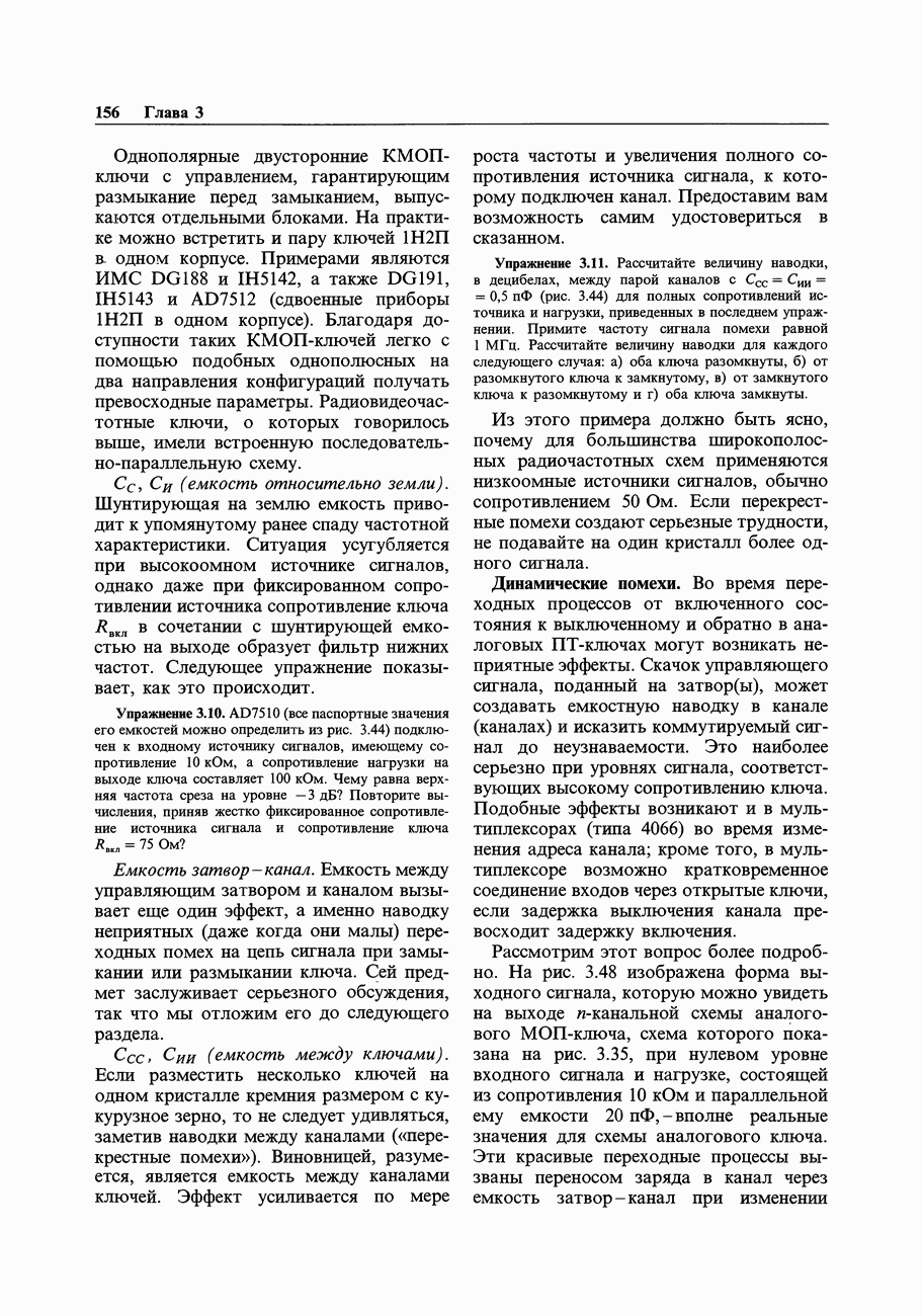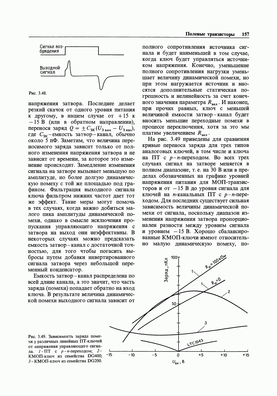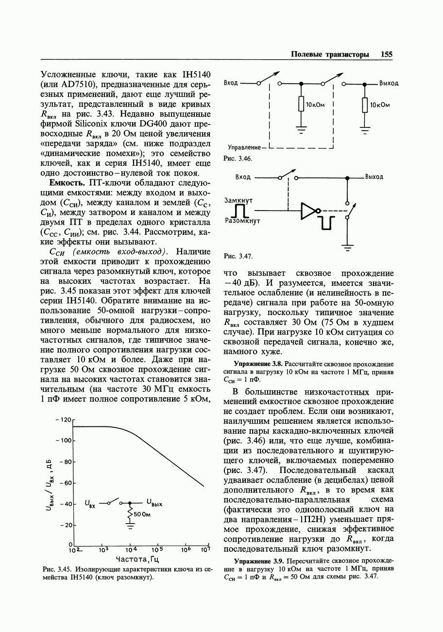 Во-первых, полевым транзисторам отдают предпочтение перед биполярными, когда хотят получить очень малый входной ток; при этом емкостные токи при тех же величинах емкостей принимают более угрожающие размеры. Во-вторых, полевые транзисторы часто имеют значительно более высокие значения емкостей, чем эквивалентные биполярные. Чтобы оценить емкостный эффект, рассмотрим усилитель на ПТ, предназначенный для работы с источником сигнала, имеющим сопротивление 100 кОм. Что касается постоянного тока, то здесь нет проблем, так как ток, равный пикоамперу, создает на внутреннем сопротивлении указанного источника падение напряжения всего в микровольт. Однако на частоте, скажем, 1 МГц входная емкость в В качестве еще одного примера представим себе переключение