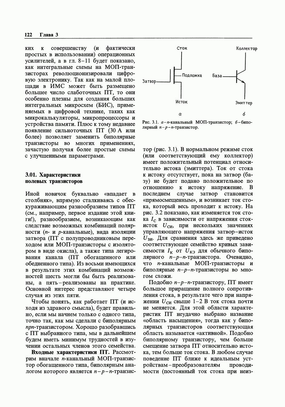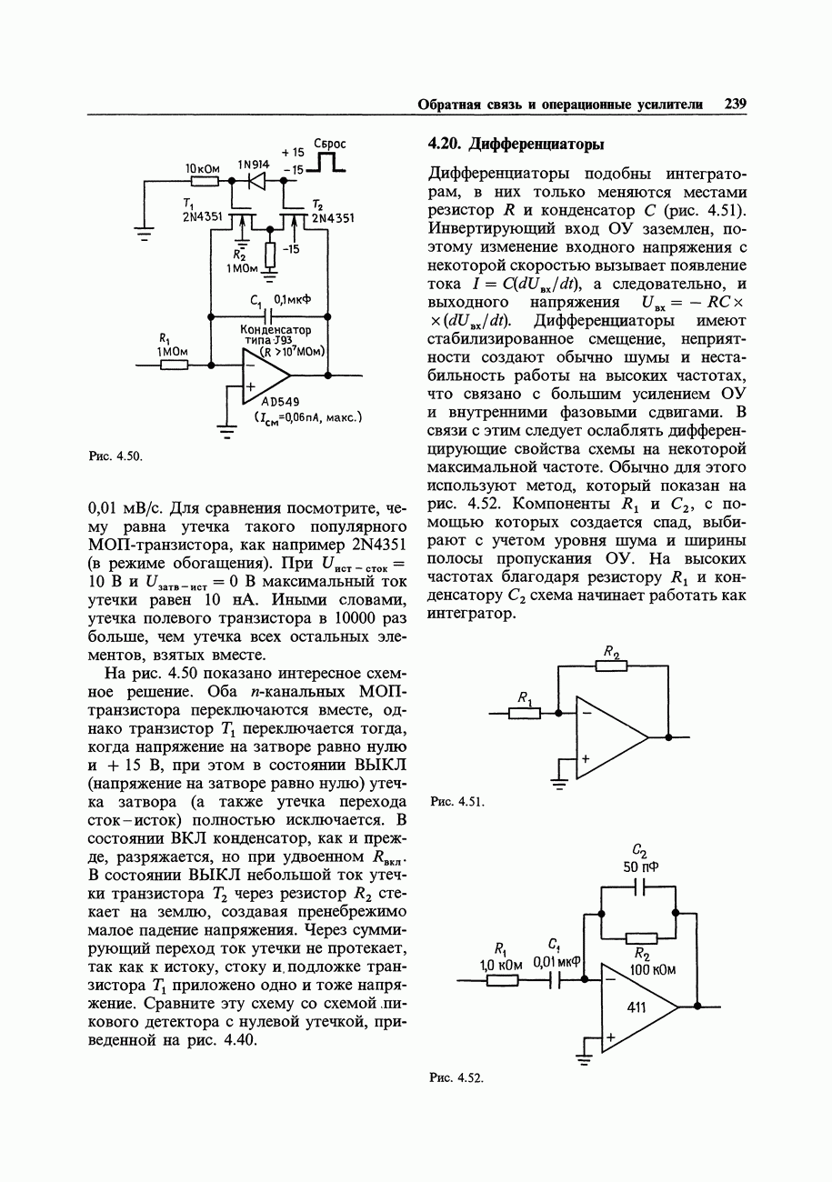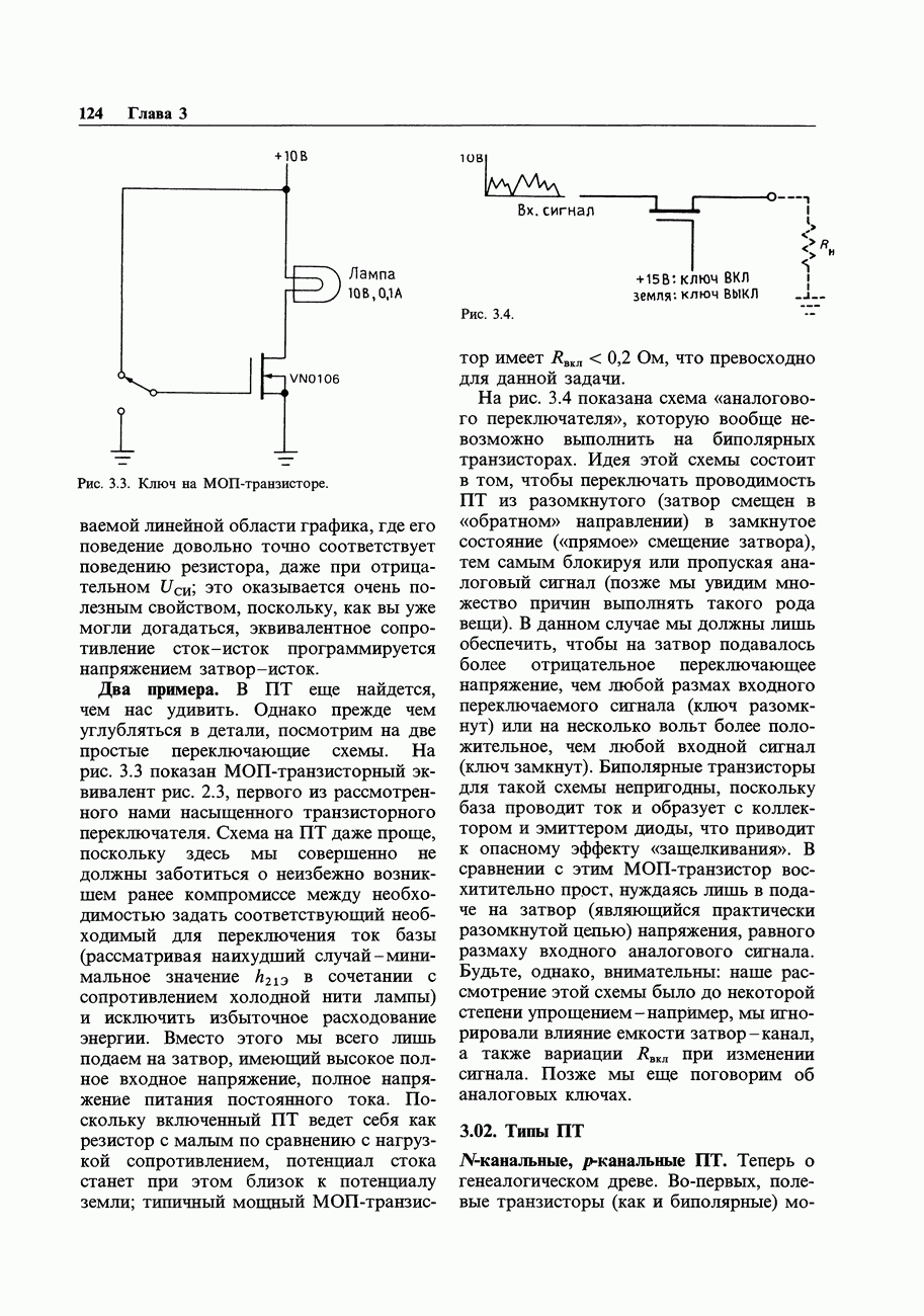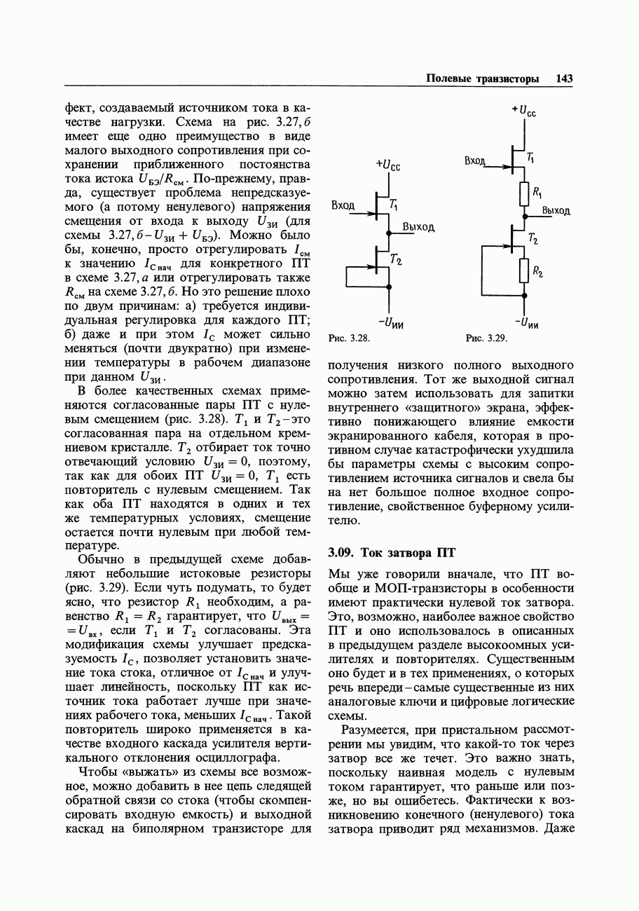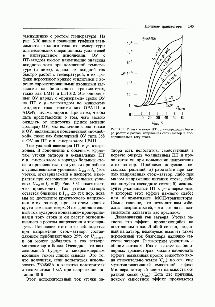 3.09. Ток затвора ПТМы уже говорили вначале, что ПТ вообще и МОП-транзисторы в особенности имеют практически нулевой ток затвора. Это, возможно, наиболее важное свойство ПТ и оно использовалось в описанных в предыдущем разделе высокоомных усилителях и повторителях. Существенным оно будет и в тех применениях, о которых речь впереди - самые существенные из них аналоговые ключи и цифровые логические схемы. Разумеется, при пристальном рассмотрении мы увидим, что какой-то ток через затвор все же течет. Это важно знать, поскольку наивная модель с нулевым током гарантирует, что раньше или позже, но вы ошибетесь. Фактически к возникновению конечного (ненулевого) тока затвора приводит ряд механизмов. Даже у МОП-транзисторов изоляция затвора (двуокись кремния), несовершенна, что приводит к токам утечки, находящимся в пикоамперном диапазоне. У ПТ с В большинстве случаев входной ток затвора пренебрежимо мал в сравнении с током базы биполярного транзистора. Есть, однако, ситуации, когда ПТ может фактически иметь более высокий входной ток! Рассмотрим ряд из них. Утечка затвора. Полное входное напряжение усилителя (или повторителя) на ПТ на низких частотах ограничено утечкой затвора. В паспорте ПТ обычно указывается напряжение пробоя
