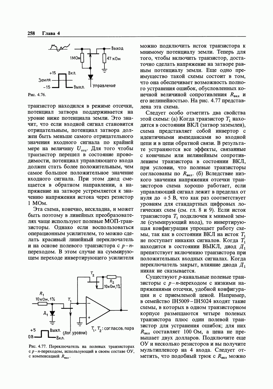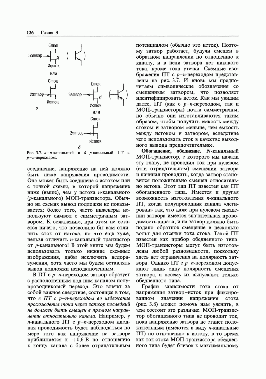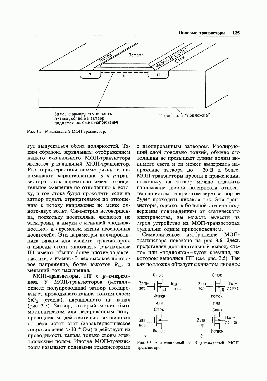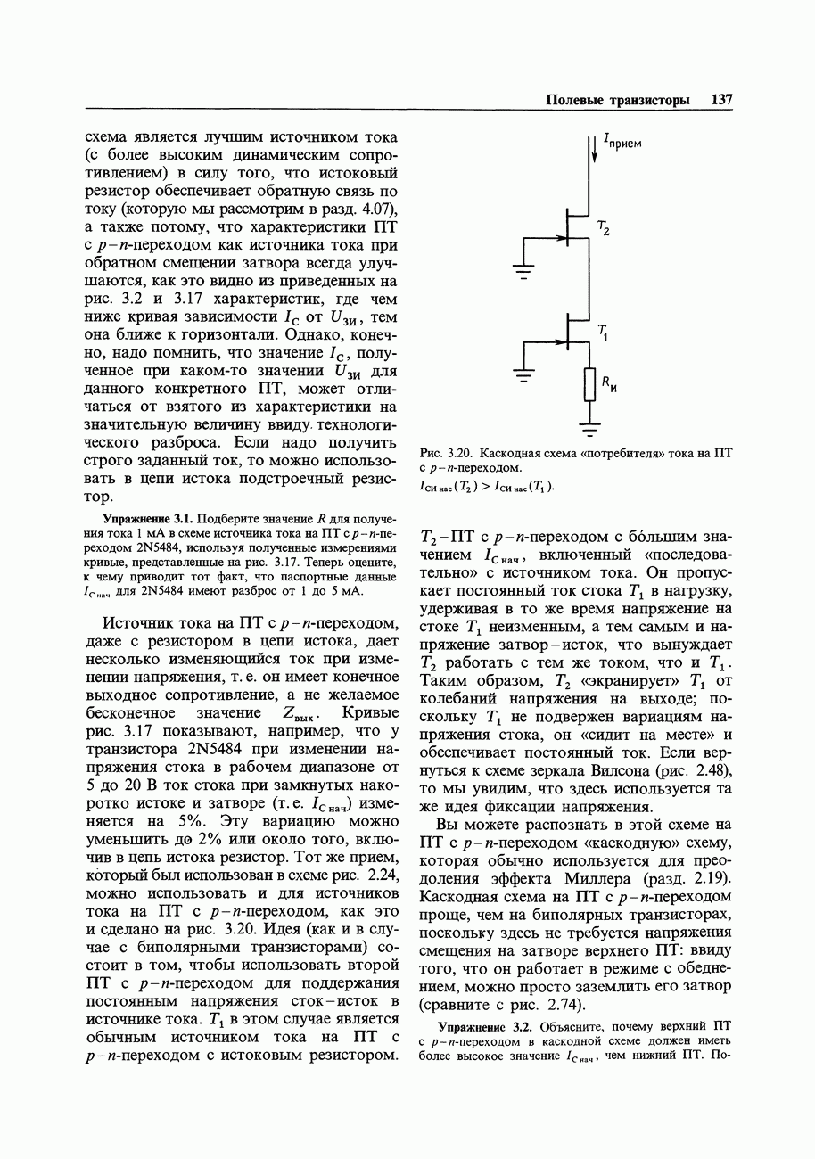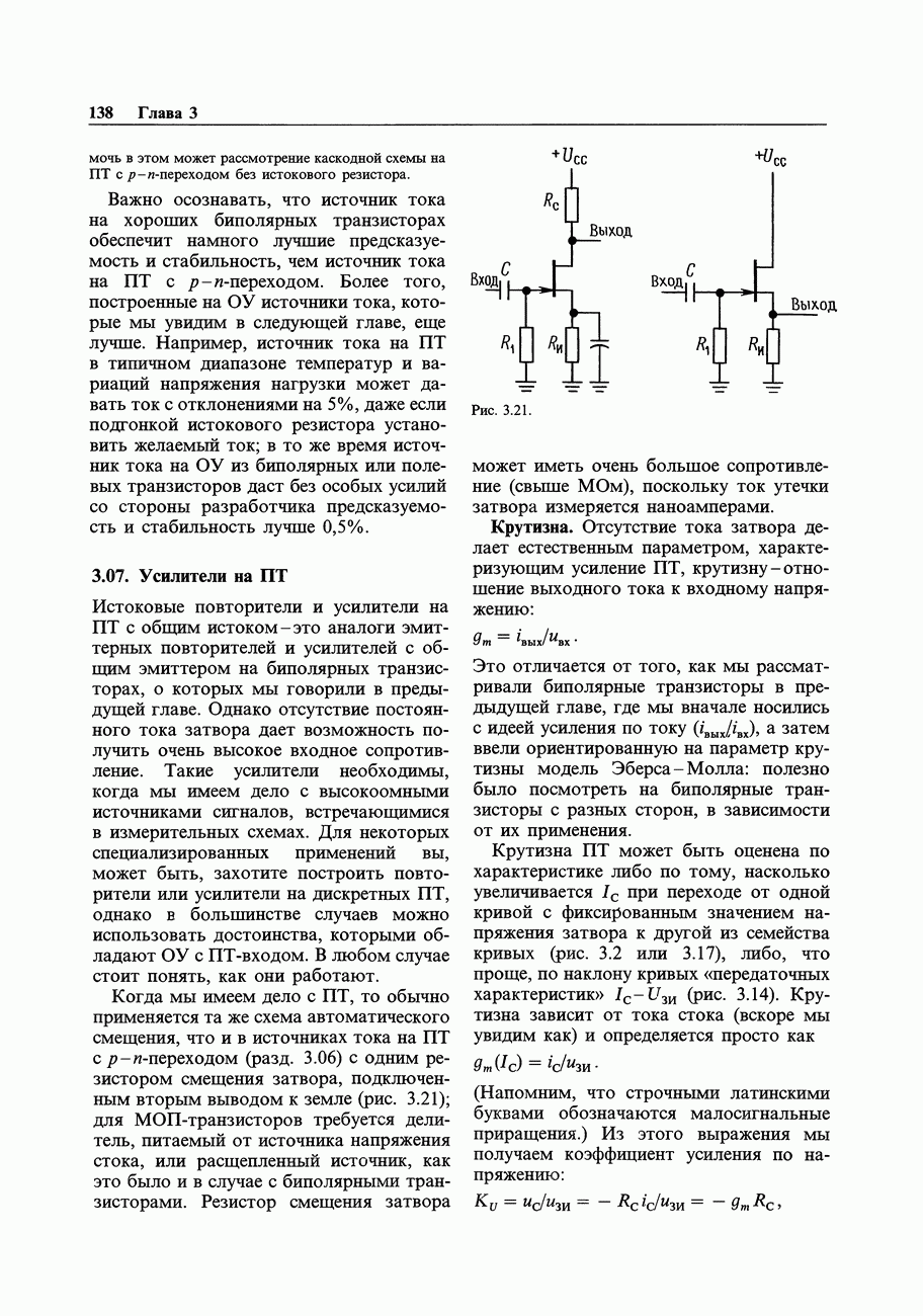 3.09. Ток затвора ПТМы уже говорили вначале, что ПТ вообще и МОП-транзисторы в особенности имеют практически нулевой ток затвора. Это, возможно, наиболее важное свойство ПТ и оно использовалось в описанных в предыдущем разделе высокоомных усилителях и повторителях. Существенным оно будет и в тех применениях, о которых речь впереди - самые существенные из них аналоговые ключи и цифровые логические схемы. Разумеется, при пристальном рассмотрении мы увидим, что какой-то ток через затвор все же течет. Это важно знать, поскольку наивная модель с нулевым током гарантирует, что раньше или позже, но вы ошибетесь. Фактически к возникновению конечного (ненулевого) тока затвора приводит ряд механизмов. Даже у МОП-транзисторов изоляция затвора (двуокись кремния), несовершенна, что приводит к токам утечки, находящимся в пикоамперном диапазоне. У ПТ с В большинстве случаев входной ток затвора пренебрежимо мал в сравнении с током базы биполярного транзистора. Есть, однако, ситуации, когда ПТ может фактически иметь более высокий входной ток! Рассмотрим ряд из них. Утечка затвора. Полное входное напряжение усилителя (или повторителя) на ПТ на низких частотах ограничено утечкой затвора. В паспорте ПТ обычно указывается напряжение пробоя