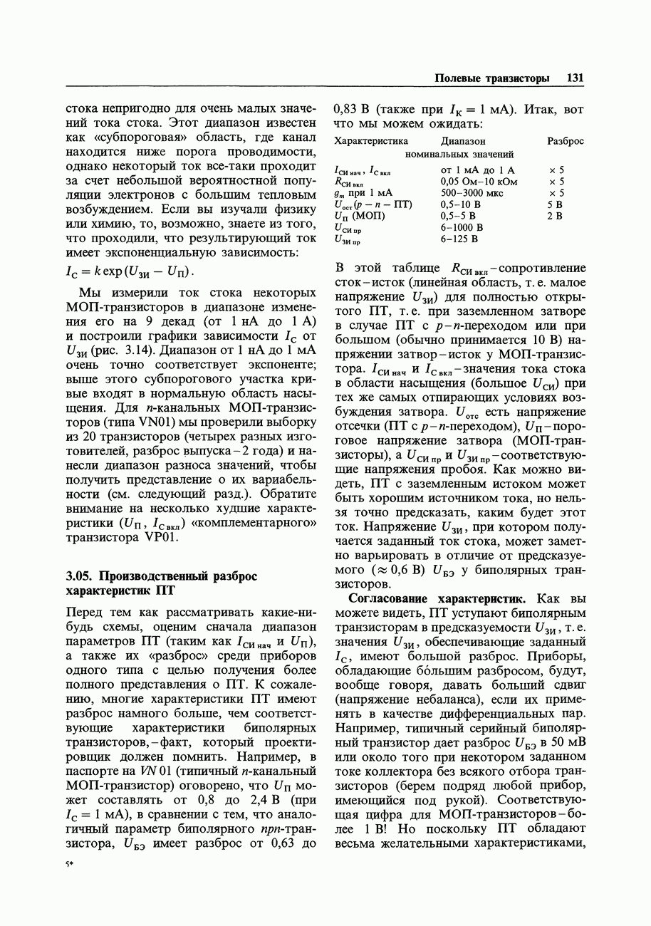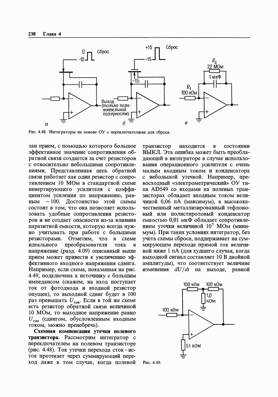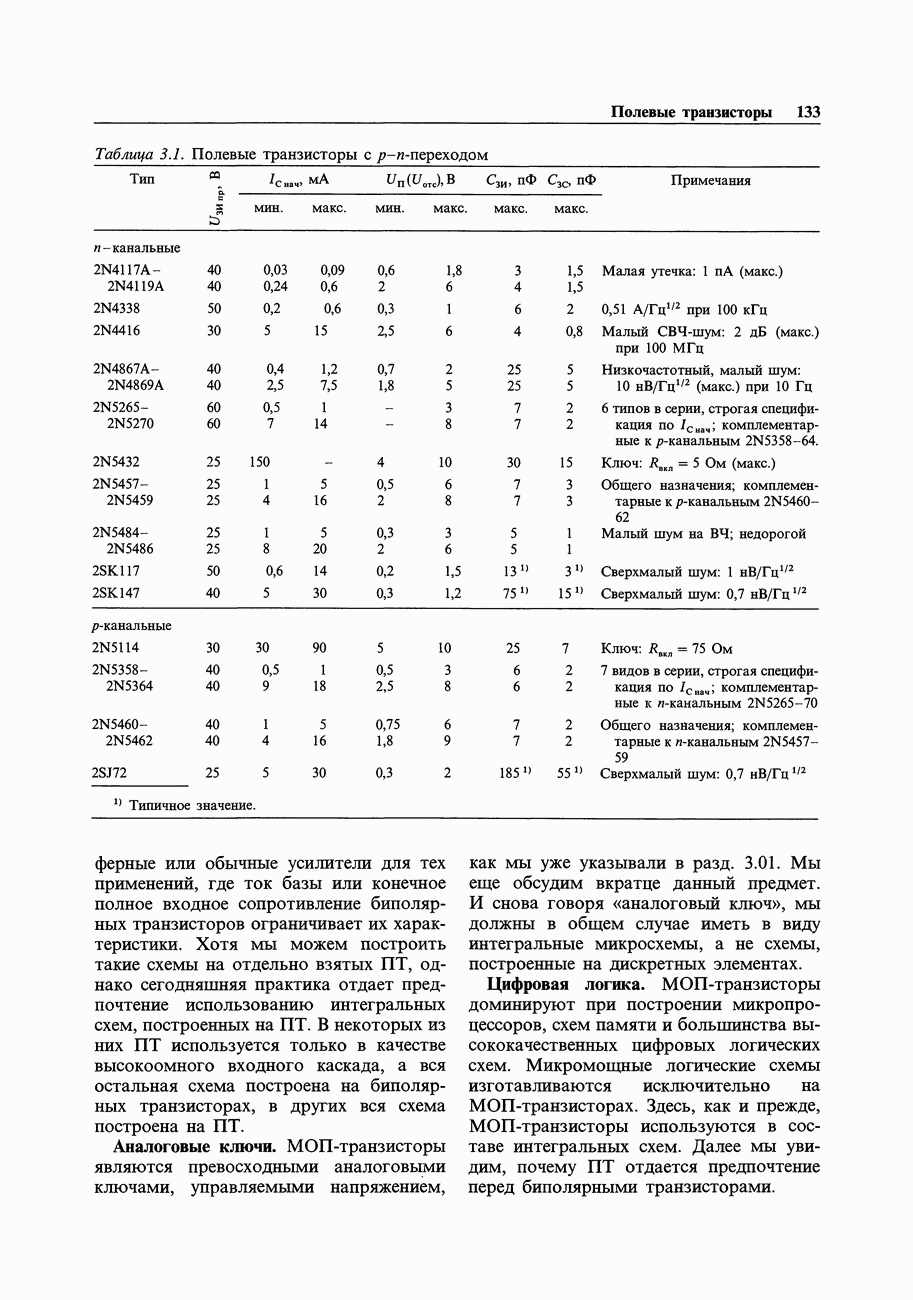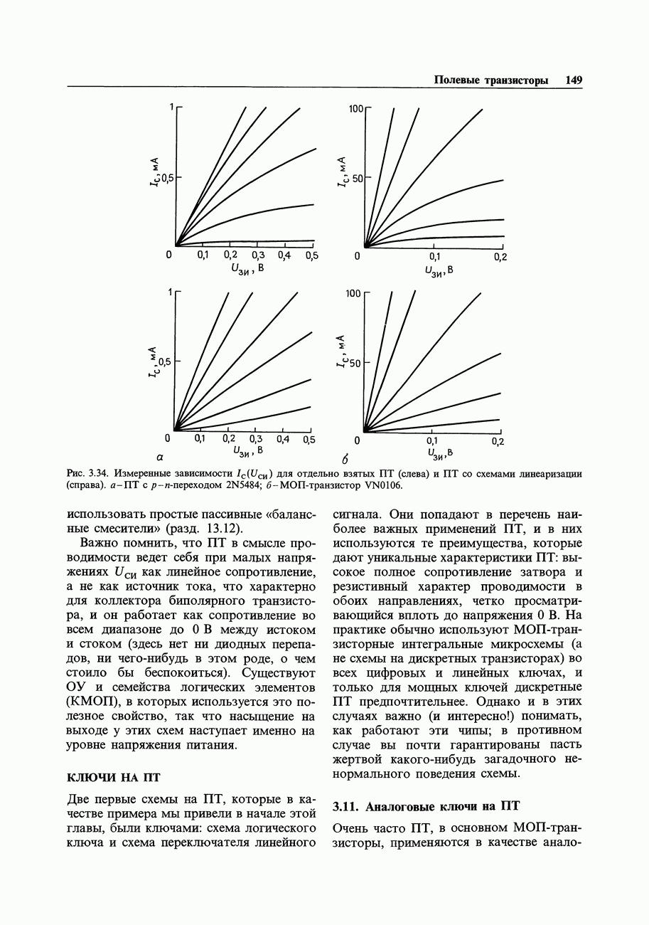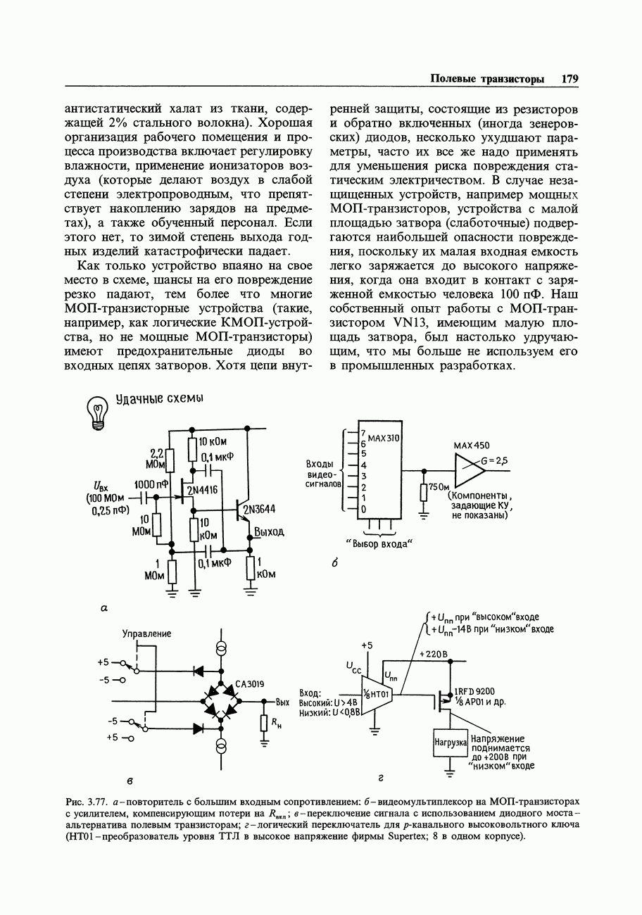 3.09. Ток затвора ПТМы уже говорили вначале, что ПТ вообще и МОП-транзисторы в особенности имеют практически нулевой ток затвора. Это, возможно, наиболее важное свойство ПТ и оно использовалось в описанных в предыдущем разделе высокоомных усилителях и повторителях. Существенным оно будет и в тех применениях, о которых речь впереди - самые существенные из них аналоговые ключи и цифровые логические схемы. Разумеется, при пристальном рассмотрении мы увидим, что какой-то ток через затвор все же течет. Это важно знать, поскольку наивная модель с нулевым током гарантирует, что раньше или позже, но вы ошибетесь. Фактически к возникновению конечного (ненулевого) тока затвора приводит ряд механизмов. Даже у МОП-транзисторов изоляция затвора (двуокись кремния), несовершенна, что приводит к токам утечки, находящимся в пикоамперном диапазоне. У ПТ с В большинстве случаев входной ток затвора пренебрежимо мал в сравнении с током базы биполярного транзистора. Есть, однако, ситуации, когда ПТ может фактически иметь более высокий входной ток! Рассмотрим ряд из них. Утечка затвора. Полное входное напряжение усилителя (или повторителя) на ПТ на низких частотах ограничено утечкой затвора. В паспорте ПТ обычно указывается напряжение пробоя