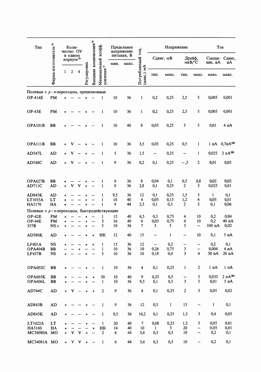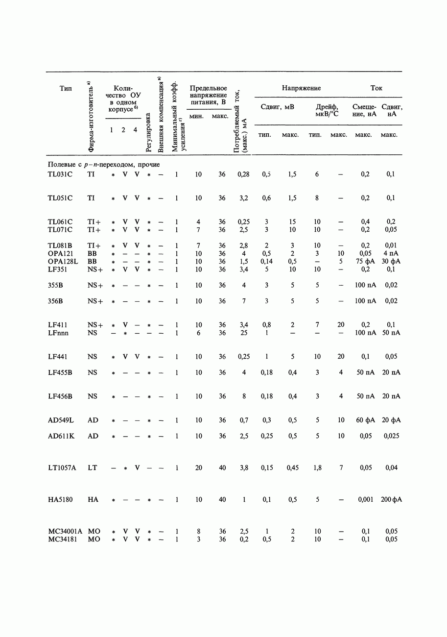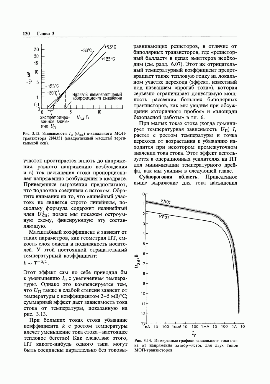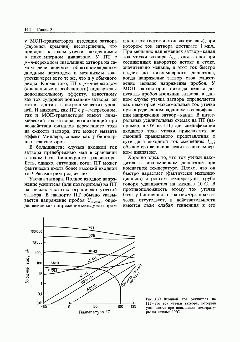 Рис. 3.30. Входной ток усилителя на ПТ - это ток утечки затвора, который удваивается при повышении температуры на каждые Хорошо здесь то, что ток утечки находится в пикоамперном диапазоне при комнатной температуре. Плохо, что он быстро нарастает (фактически экспоненциально) с ростом температуры, грубо говоря удваивается на каждые На рис. 3.30 даны в сравнении графики зависимости входного тока от температуры для нескольких операционных усилителей в интегральном исполнении. ОУ с ПТ-входом имеют наименьшие значения входного тока при комнатной температуре (и ниже), однако их входной ток быстро растет с температурой, и их графики пересекают кривые усилителей с хорошо спроектированными входными каскадами на биполярных транзисторах, таких как Ток ударной ионизации ПТ с р-п-переходом.В дополнение к обычным эффектам утечки затвора в -канальных ПТ с р - « -переходом в гораздо большей степени проявляются токи утечки при работе с существенными уровнями (ток утечки, оговариваемый в паспорте, измеряется при совершенно нереальных условиях ). Рис. 3.31 показывает, что происходит. Ток утечки затвора остается близким к до тех пор, пока мы не достигнем критического напряжения сток-затвор, при котором кривая круто взмывает вверх. Этот дополнительный ток «ударной ионизации» пропорционален току стока и он растет экспоненциально с ростом напряження и температуры. Появление этого тока наблюдается при напряжении сток-затвор, составляющем приблизительно 25% от , и он может добавлять в ток затвора микроампер и более. Очевидно, что «высокоомный буфер» с микроамперным входным током лишен смысла. Это то, что получится, если попытаться использовать в качестве повторителя с током стока при напряжении питания 40 В.