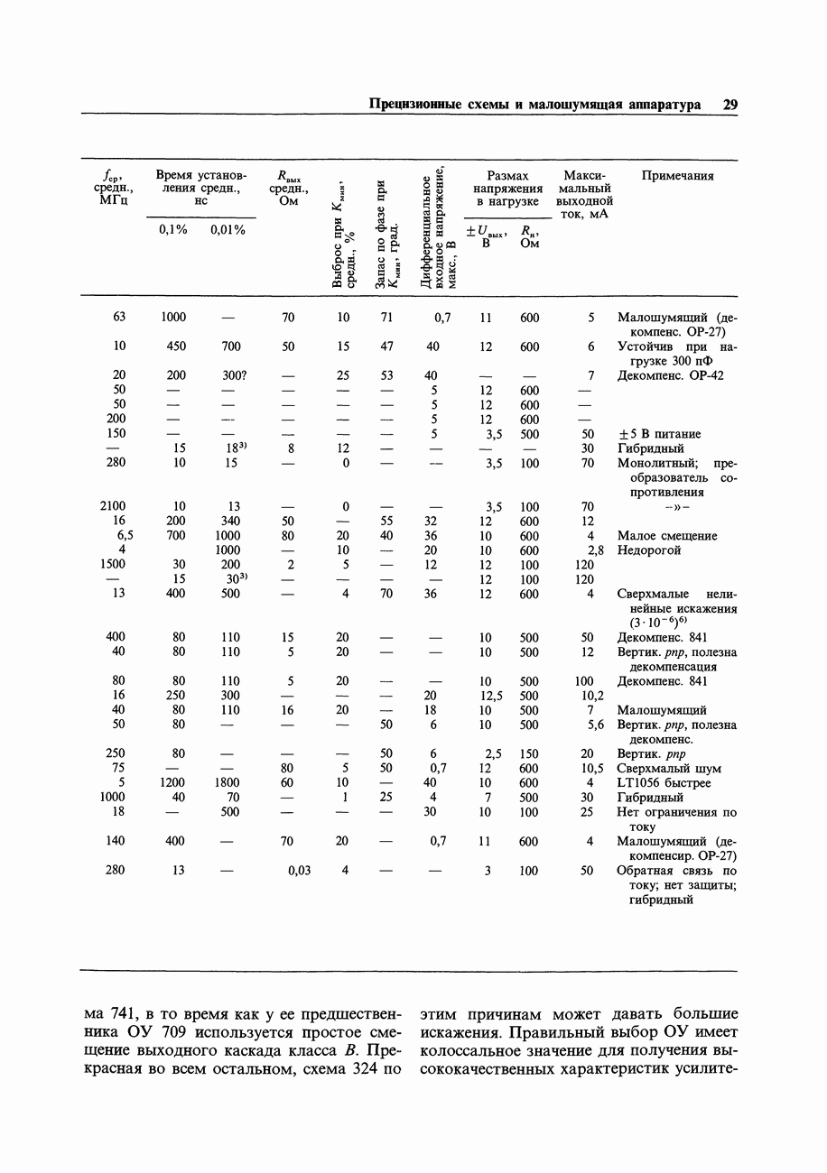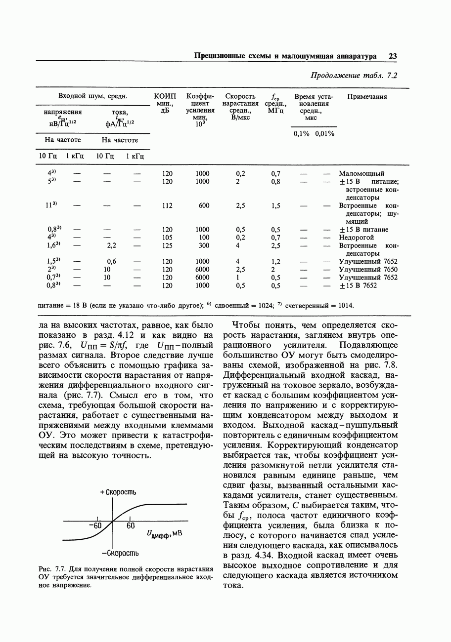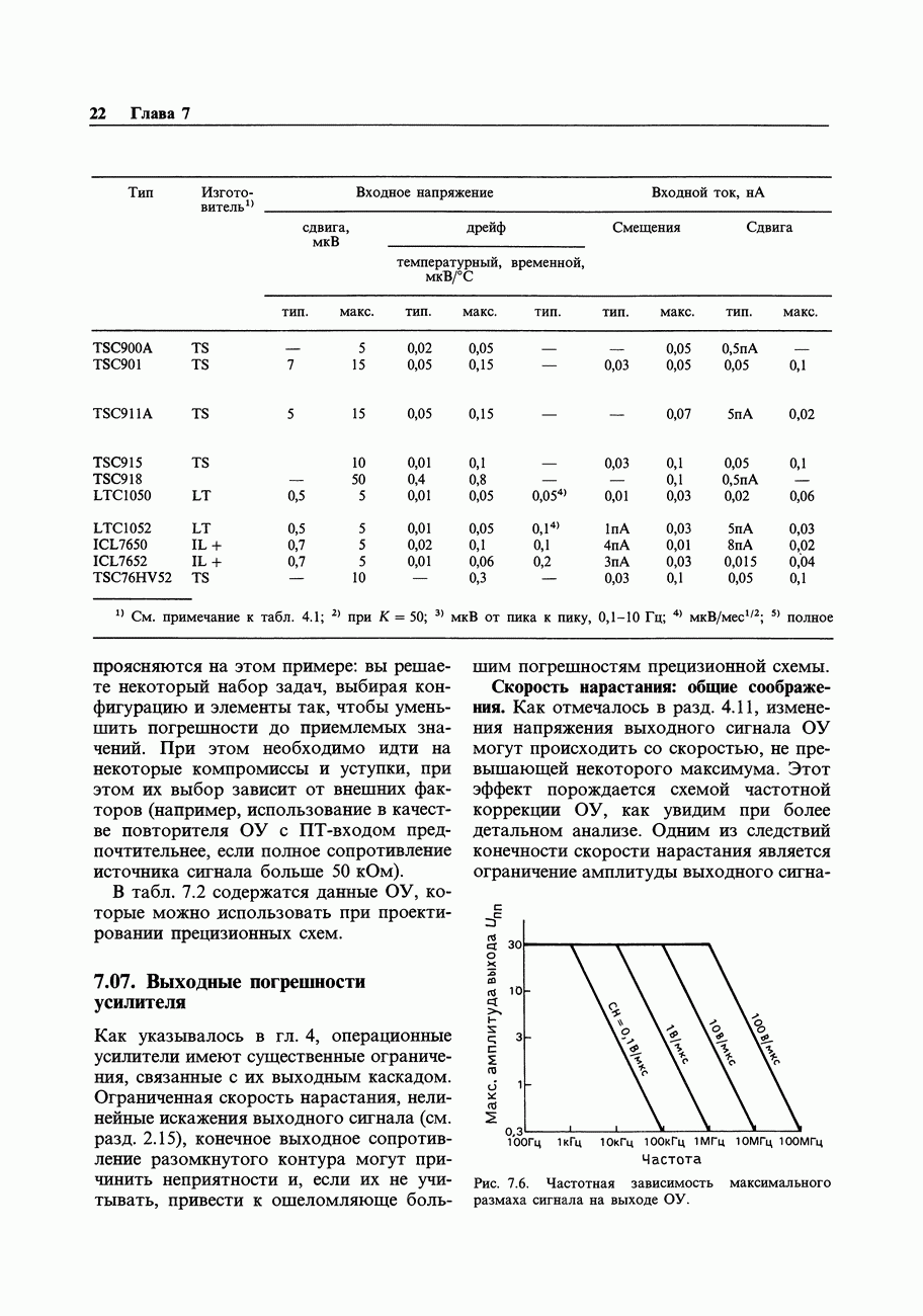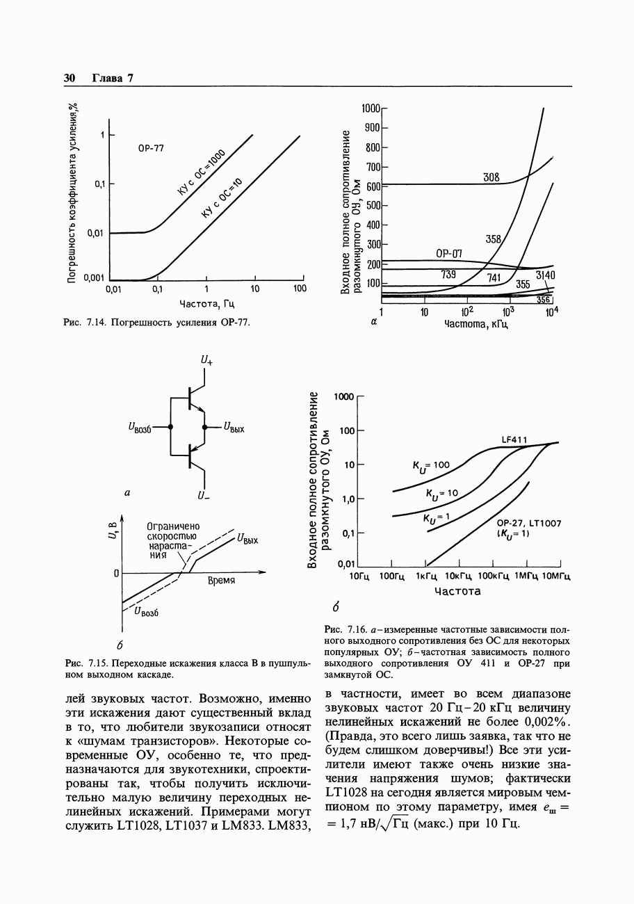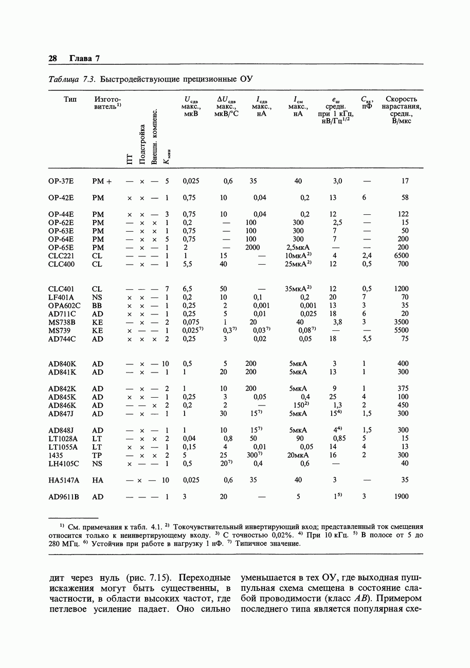 Переходные искажения могут быть существенны, в частности, в области высоких частот, где петлевое усиление падает. Оно сильно уменьшается в тех ОУ, где выходная пушпульная схема смещена в состояние слабой проводимости (класс АВ). Примером последнего типа является популярная схема 741, в то время как у ее предшественника ОУ 709 используется простое смещение выходного каскада класса В. Продолжение табл. 7.3.