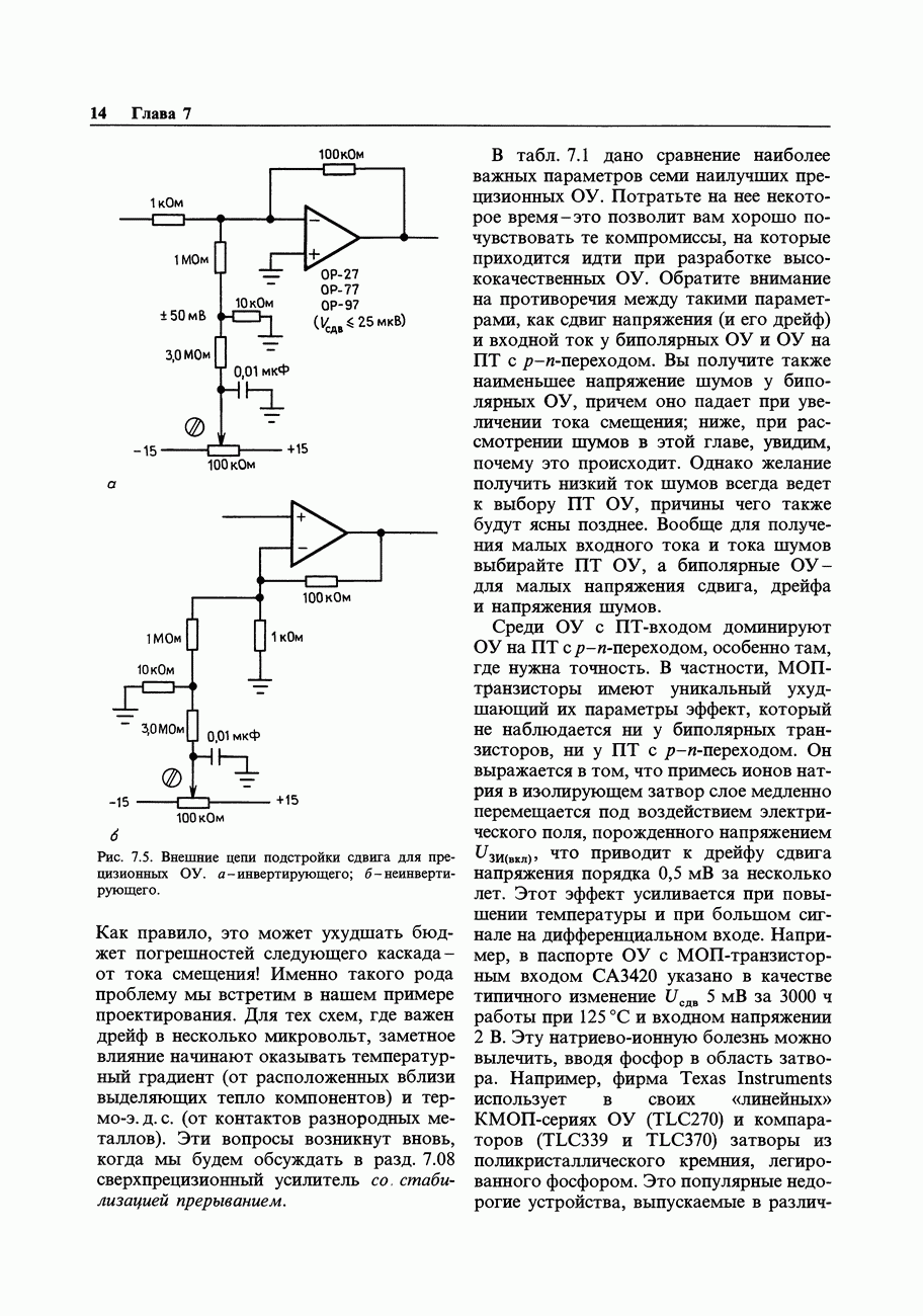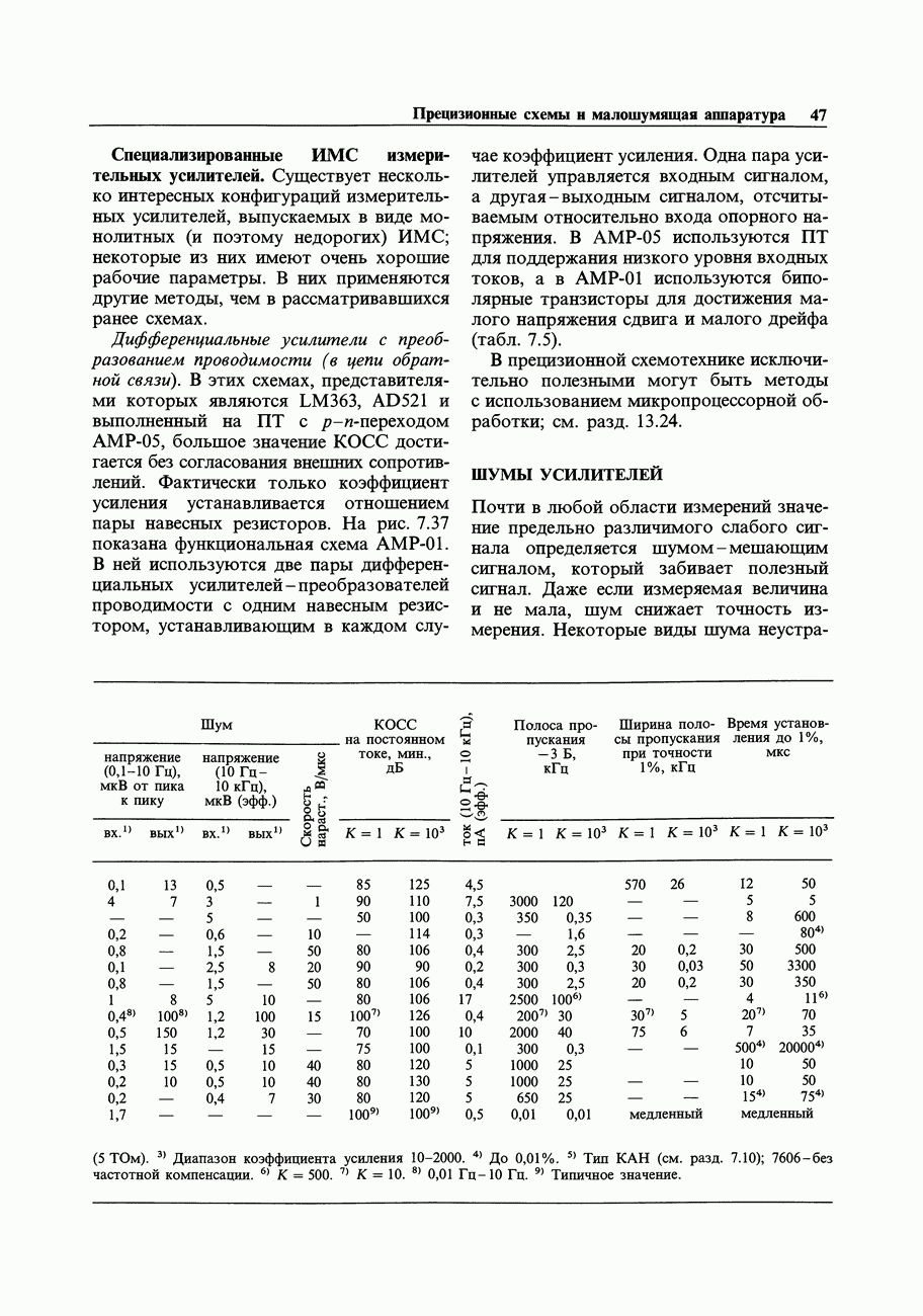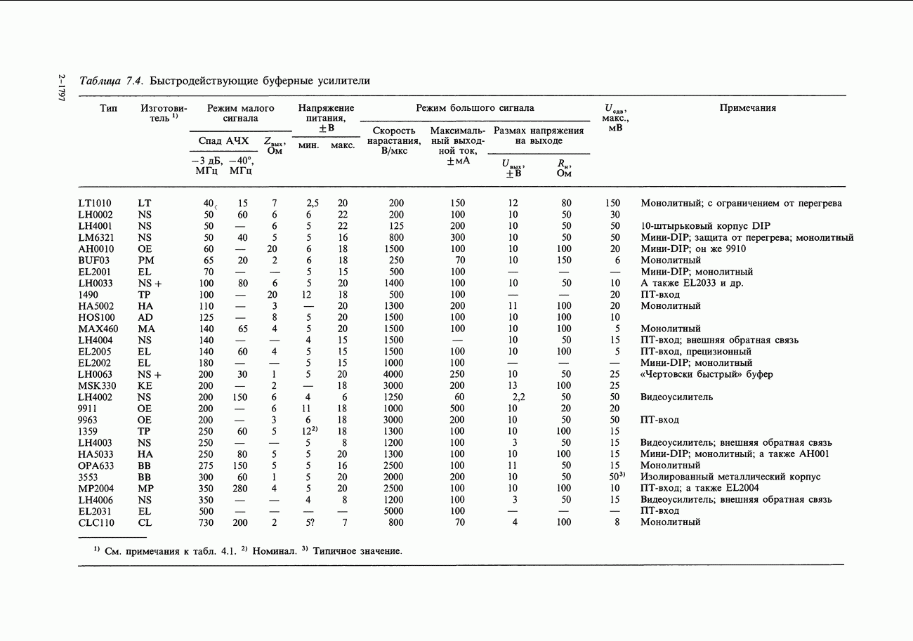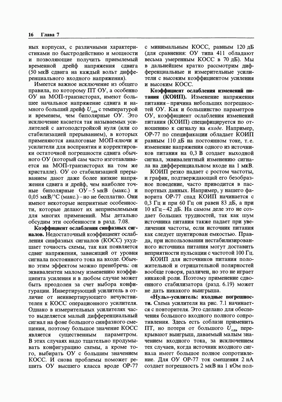 Переходные искажения могут быть существенны, в частности, в области высоких частот, где петлевое усиление падает. Оно сильно уменьшается в тех ОУ, где выходная пушпульная схема смещена в состояние слабой проводимости (класс АВ). Примером последнего типа является популярная схема 741, в то время как у ее предшественника ОУ 709 используется простое смещение выходного каскада класса В. Продолжение табл. 7.3.