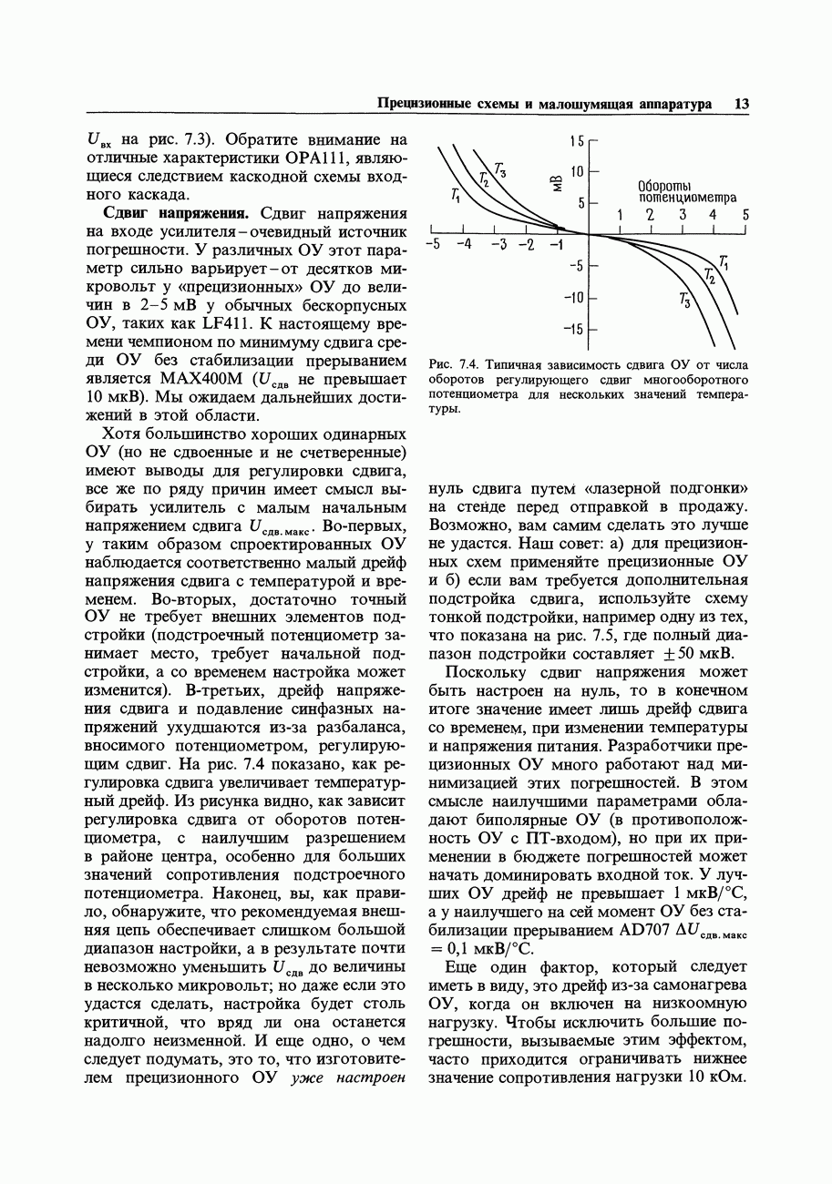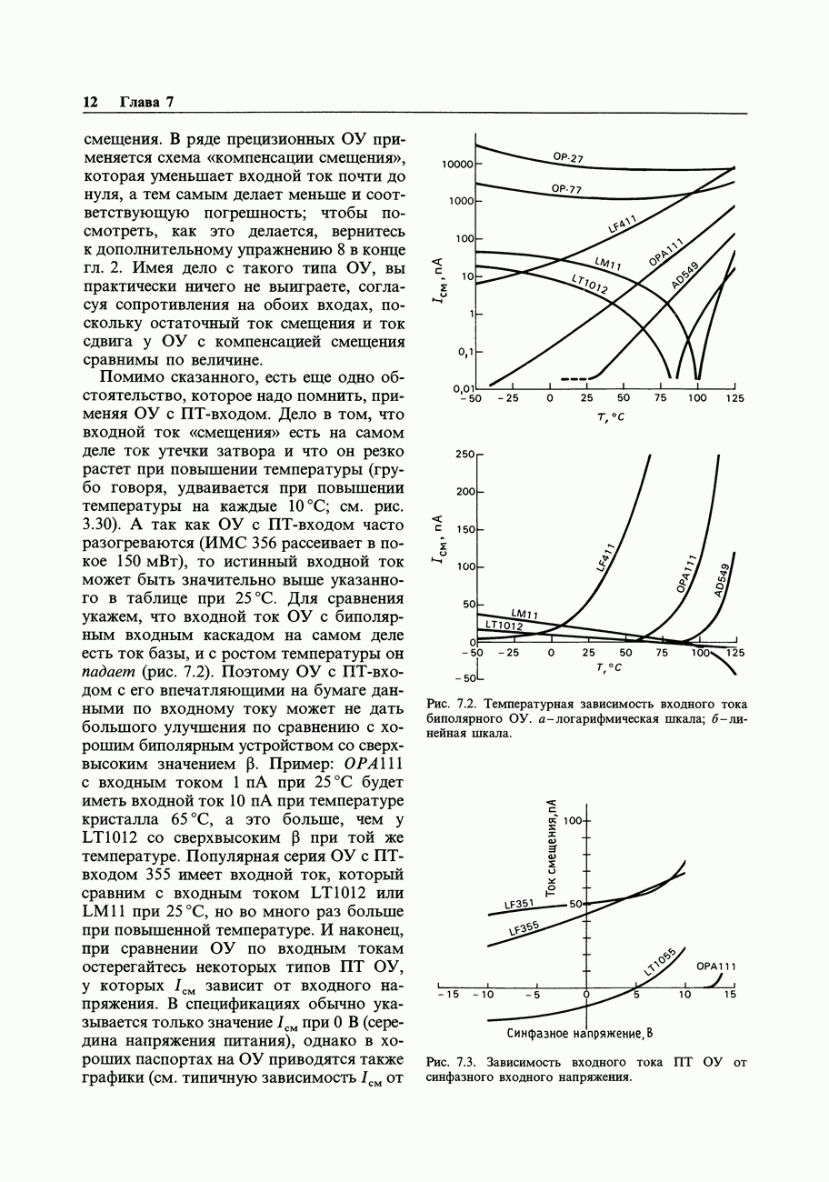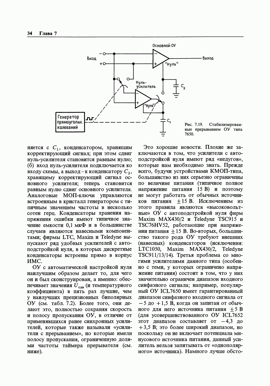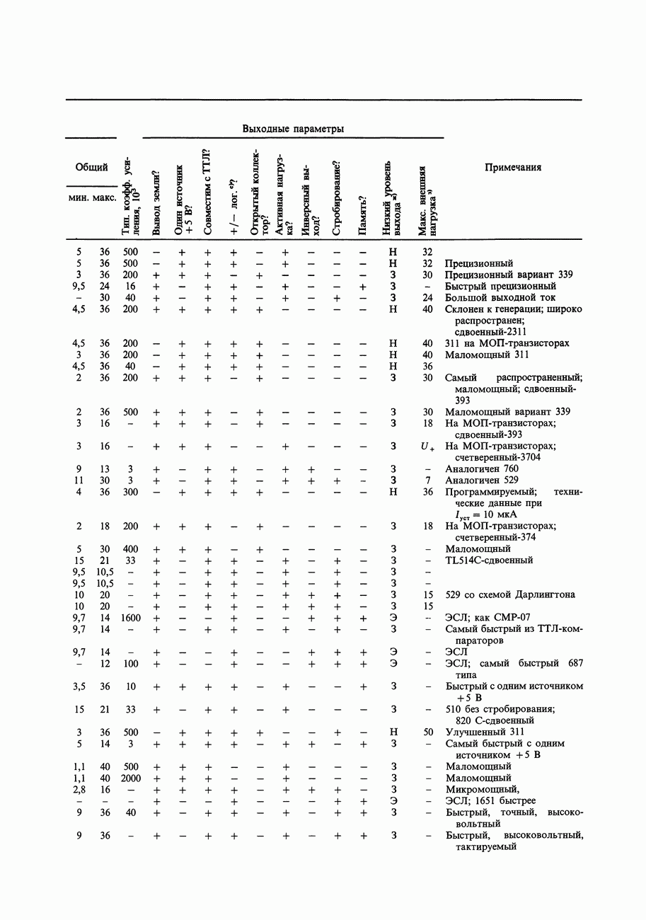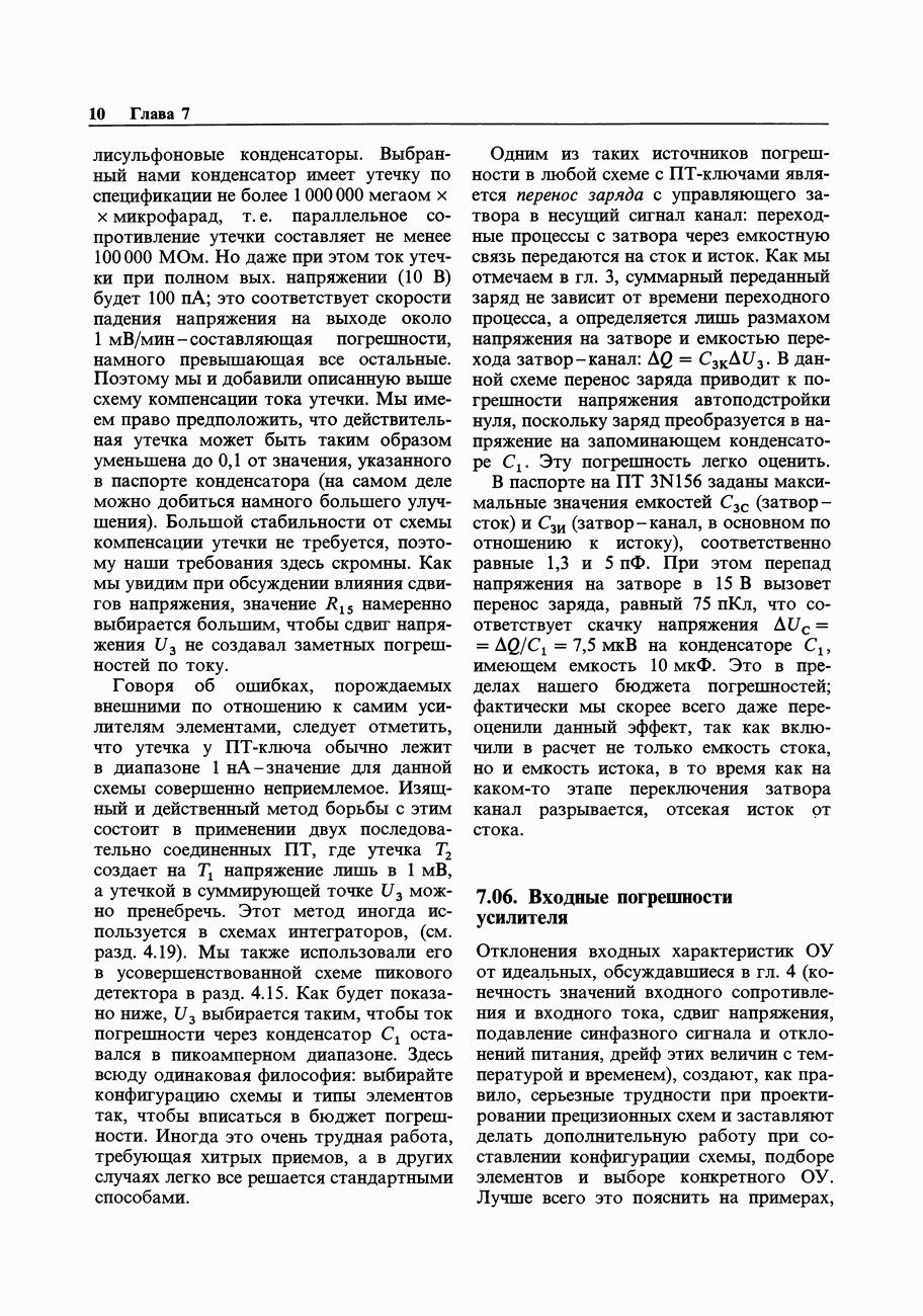 Переходные искажения могут быть существенны, в частности, в области высоких частот, где петлевое усиление падает. Оно сильно уменьшается в тех ОУ, где выходная пушпульная схема смещена в состояние слабой проводимости (класс АВ). Примером последнего типа является популярная схема 741, в то время как у ее предшественника ОУ 709 используется простое смещение выходного каскада класса В. Продолжение табл. 7.3.