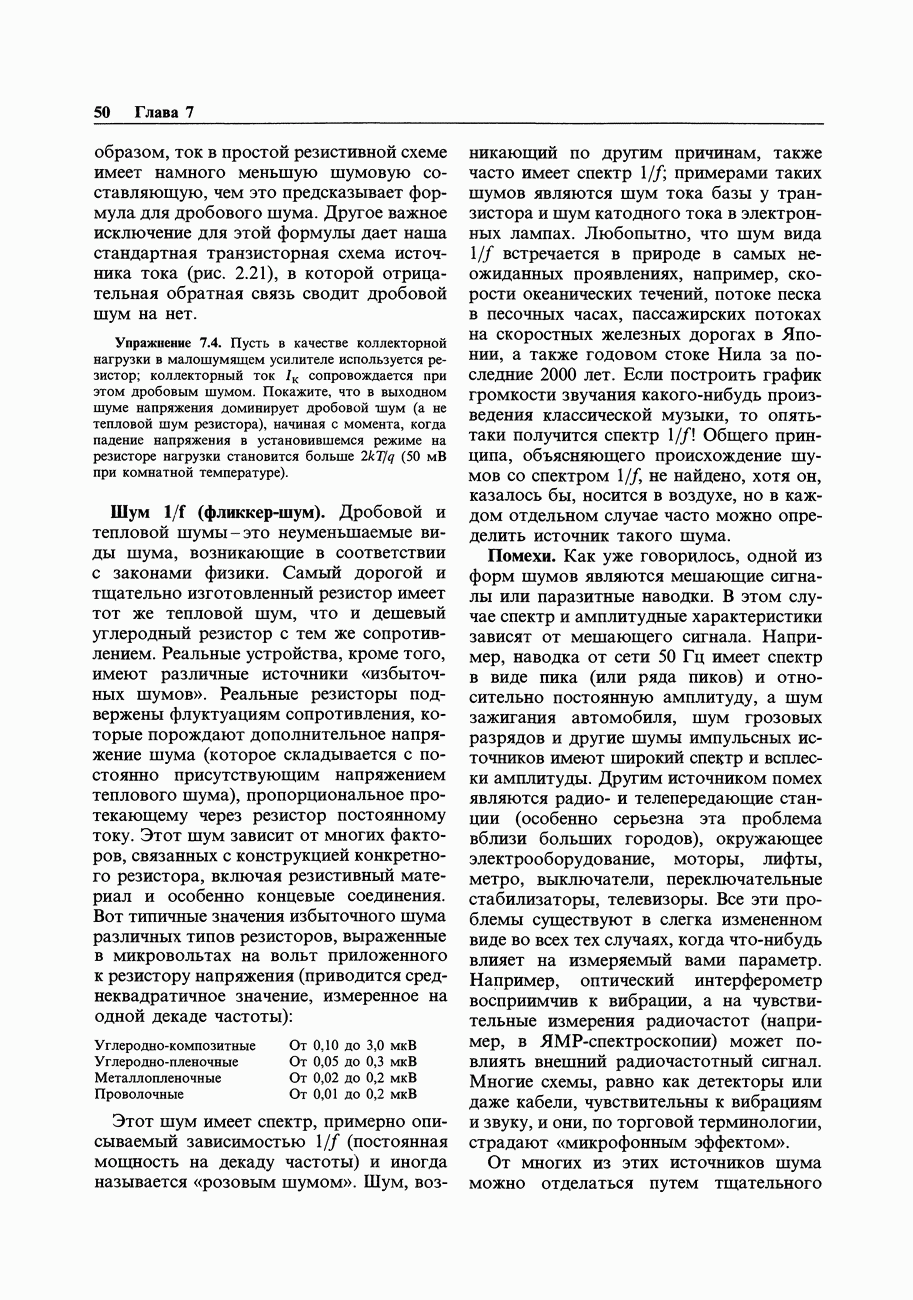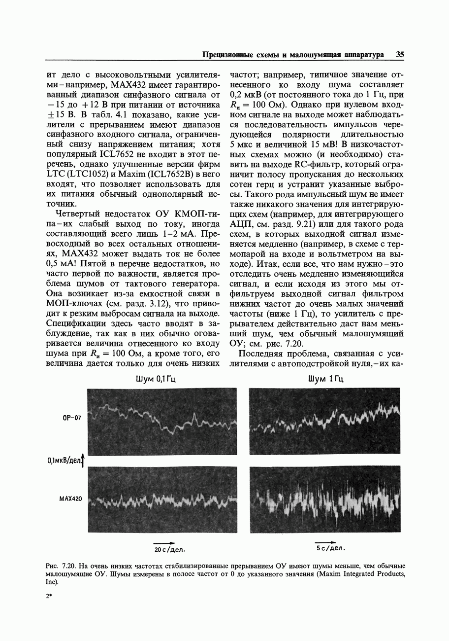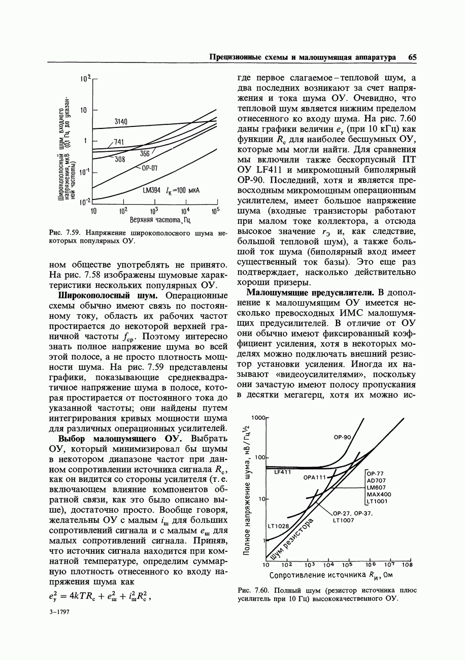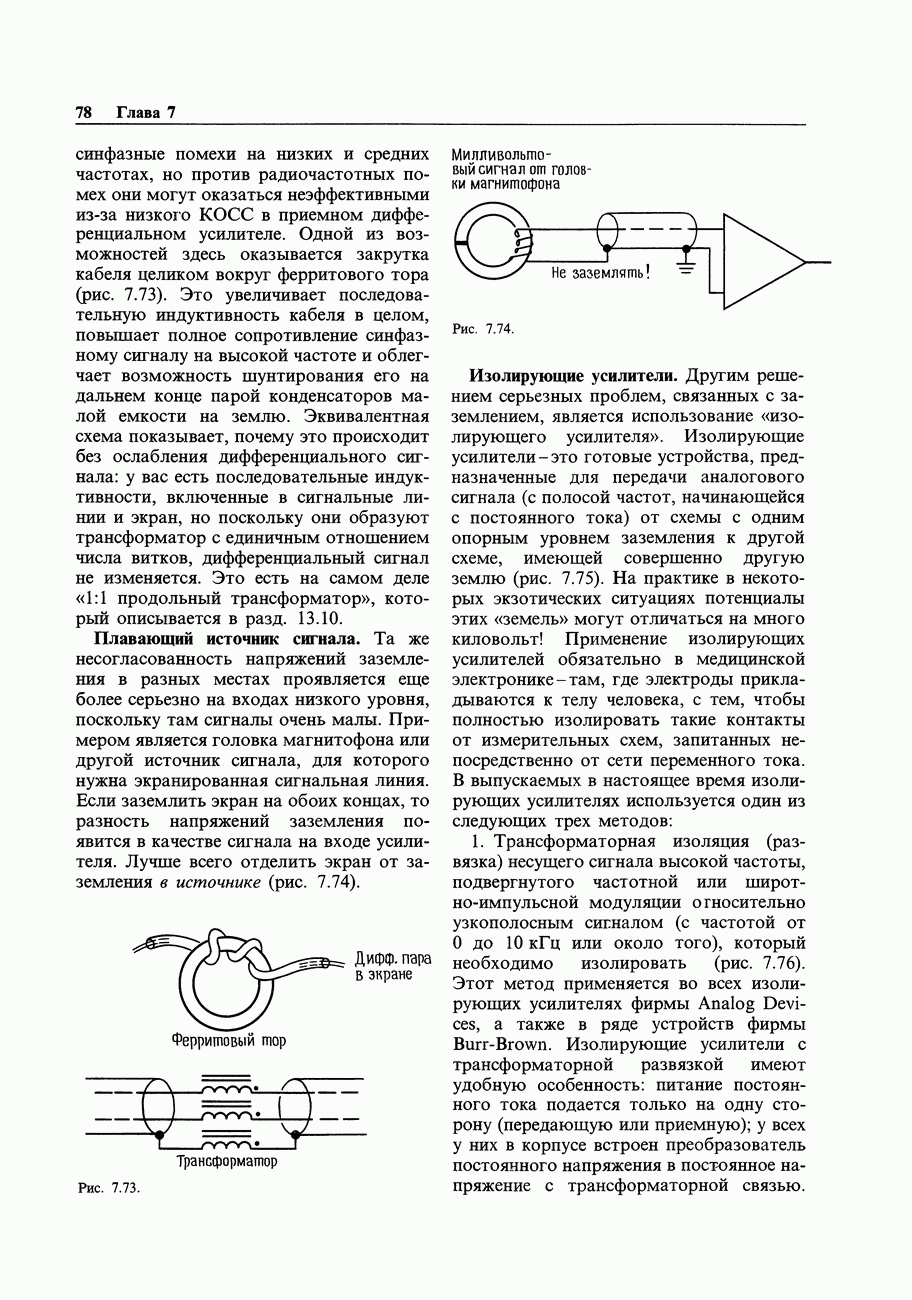 Переходные искажения могут быть существенны, в частности, в области высоких частот, где петлевое усиление падает. Оно сильно уменьшается в тех ОУ, где выходная пушпульная схема смещена в состояние слабой проводимости (класс АВ). Примером последнего типа является популярная схема 741, в то время как у ее предшественника ОУ 709 используется простое смещение выходного каскада класса В. Продолжение табл. 7.3.