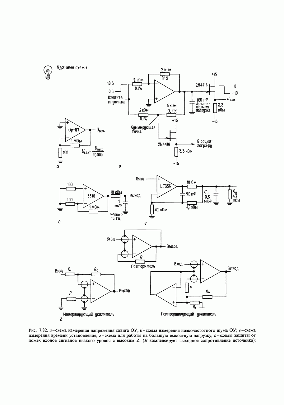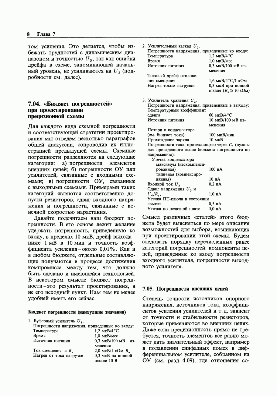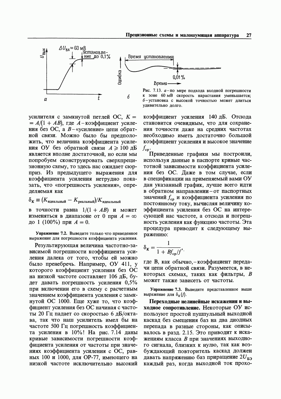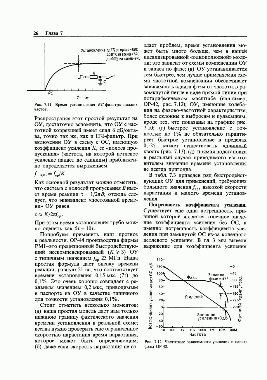 При этом время установления грубо можно оценить как Попробуем применить наш прогноз к реальности. Стоит отметить несколько моментов: (а) наша простая модель дает нам только нижнюю границу фактического значения времени установления в реальной схеме; всегда нужно проверить еще ограниченное скоростью нарастания время нарастания, которое может быть определяющим; (б) даже если скорость нарастания не создает проблем, время установления может быть много больше, чем в нашей идеализированной «однополюсной» модели; это зависит от схемы компенсации ОУ и запаса по фазе; (в) ОУ устанавливается тем быстрее, чем лучше применяемая схема частотной компенсации обеспечивает зависимость сдвига фазы от частоты в разомкнутой петле в виде прямой линии при логарифмическом масштабе (например, В табл. 7.3 приведен ряд быстродействующих ОУ для применений, требующих большого значения Погрешность коэффициента усиления.Существует еще одна погрешность, причиной которой является конечное значение коэффициента усиления без ОС, а именно: погрешность коэффициента усиления при замкнутой ОС из-за конечного петлевого усиления.