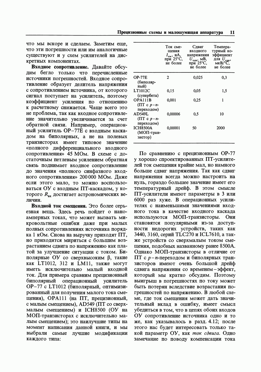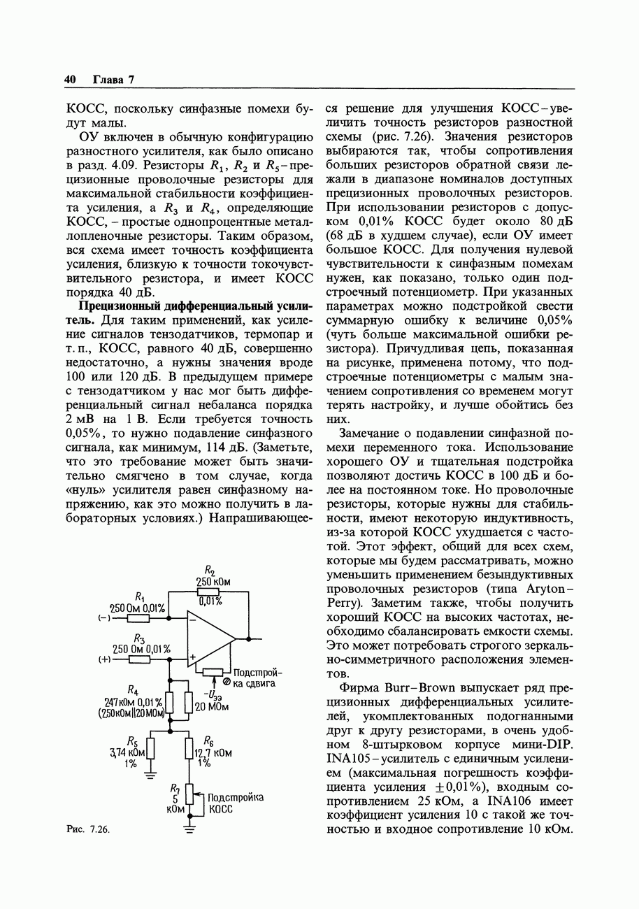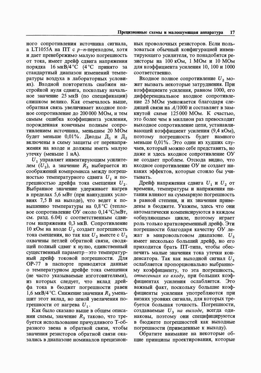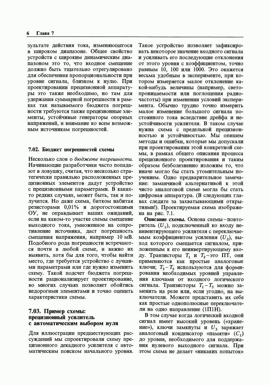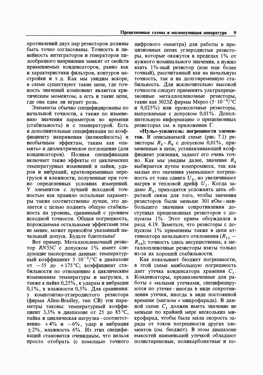 При этом время установления грубо можно оценить как Попробуем применить наш прогноз к реальности. Стоит отметить несколько моментов: (а) наша простая модель дает нам только нижнюю границу фактического значения времени установления в реальной схеме; всегда нужно проверить еще ограниченное скоростью нарастания время нарастания, которое может быть определяющим; (б) даже если скорость нарастания не создает проблем, время установления может быть много больше, чем в нашей идеализированной «однополюсной» модели; это зависит от схемы компенсации ОУ и запаса по фазе; (в) ОУ устанавливается тем быстрее, чем лучше применяемая схема частотной компенсации обеспечивает зависимость сдвига фазы от частоты в разомкнутой петле в виде прямой линии при логарифмическом масштабе (например, В табл. 7.3 приведен ряд быстродействующих ОУ для применений, требующих большого значения Погрешность коэффициента усиления.Существует еще одна погрешность, причиной которой является конечное значение коэффициента усиления без ОС, а именно: погрешность коэффициента усиления при замкнутой ОС из-за конечного петлевого усиления.