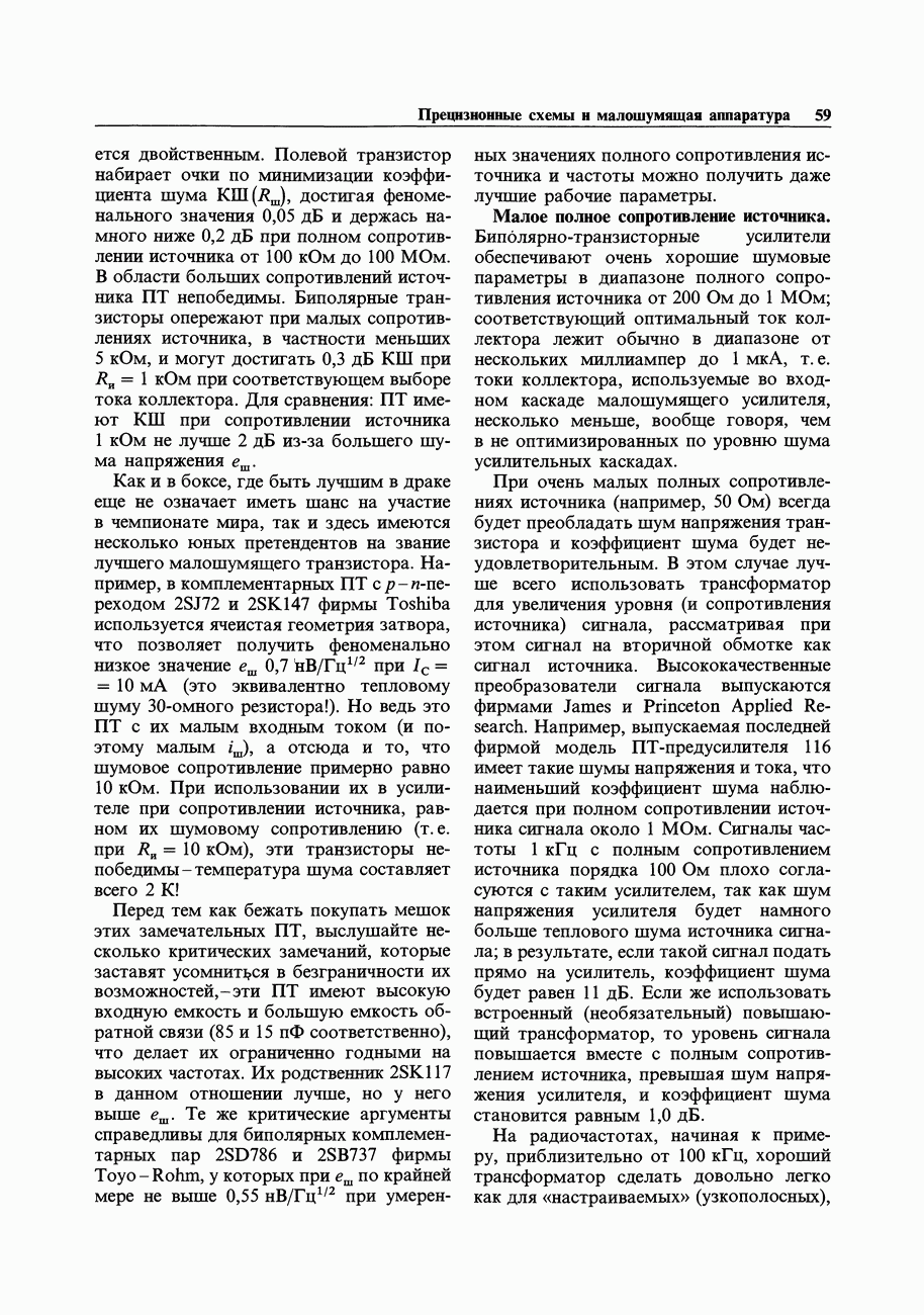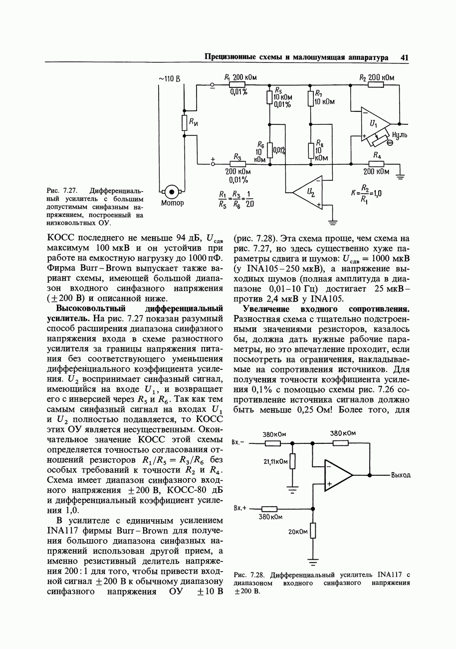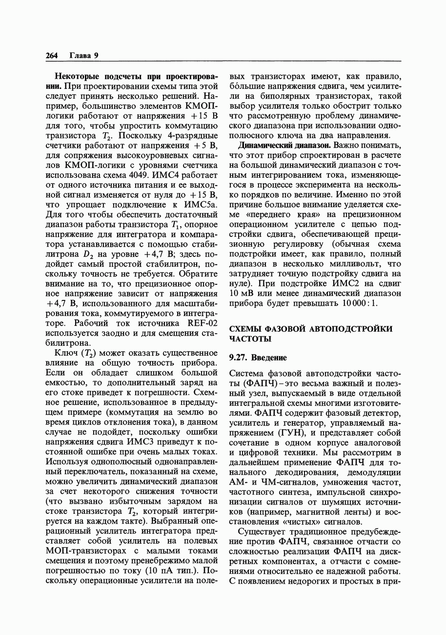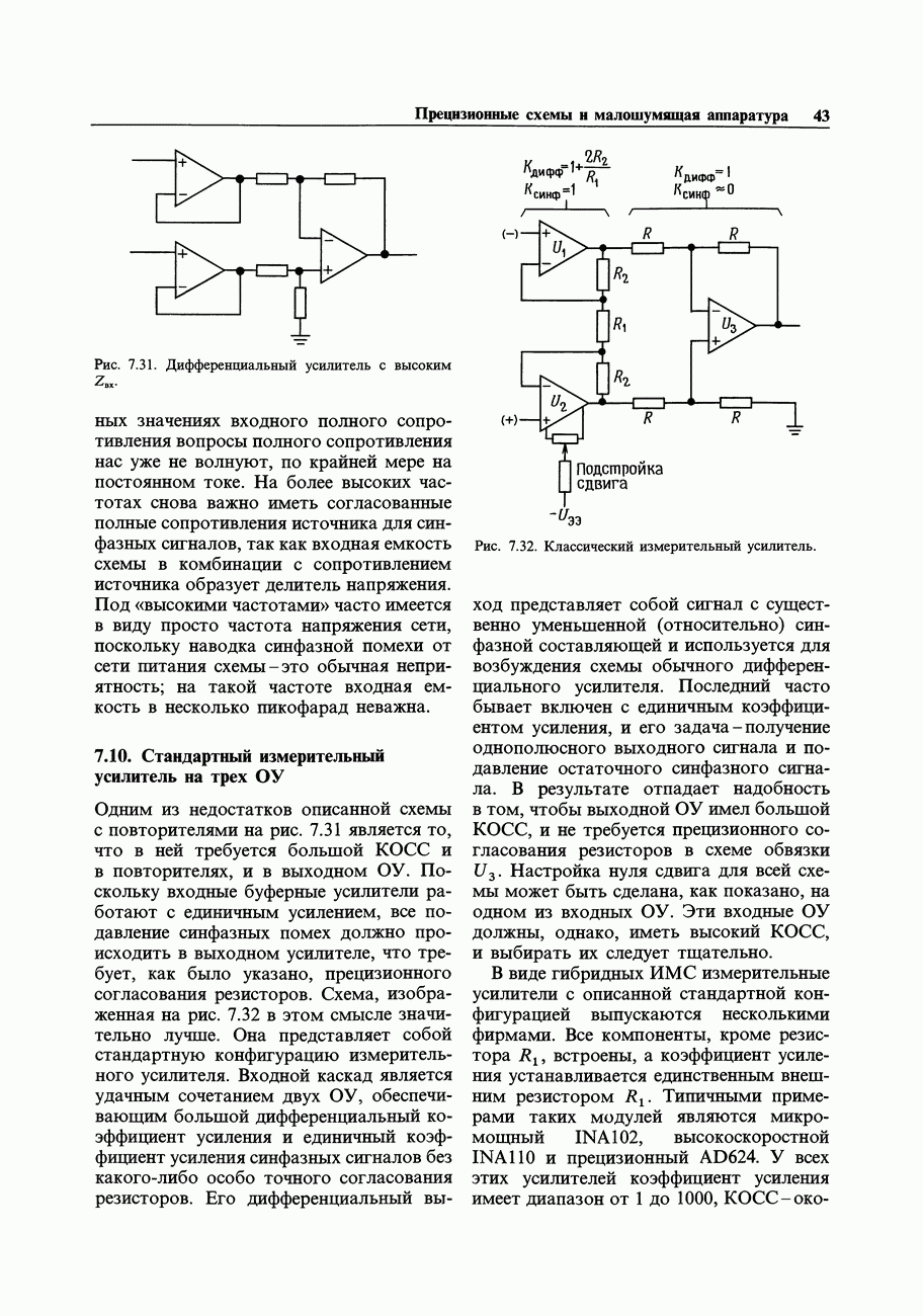 При этом время установления грубо можно оценить как Попробуем применить наш прогноз к реальности. Стоит отметить несколько моментов: (а) наша простая модель дает нам только нижнюю границу фактического значения времени установления в реальной схеме; всегда нужно проверить еще ограниченное скоростью нарастания время нарастания, которое может быть определяющим; (б) даже если скорость нарастания не создает проблем, время установления может быть много больше, чем в нашей идеализированной «однополюсной» модели; это зависит от схемы компенсации ОУ и запаса по фазе; (в) ОУ устанавливается тем быстрее, чем лучше применяемая схема частотной компенсации обеспечивает зависимость сдвига фазы от частоты в разомкнутой петле в виде прямой линии при логарифмическом масштабе (например, В табл. 7.3 приведен ряд быстродействующих ОУ для применений, требующих большого значения Погрешность коэффициента усиления.Существует еще одна погрешность, причиной которой является конечное значение коэффициента усиления без ОС, а именно: погрешность коэффициента усиления при замкнутой ОС из-за конечного петлевого усиления.