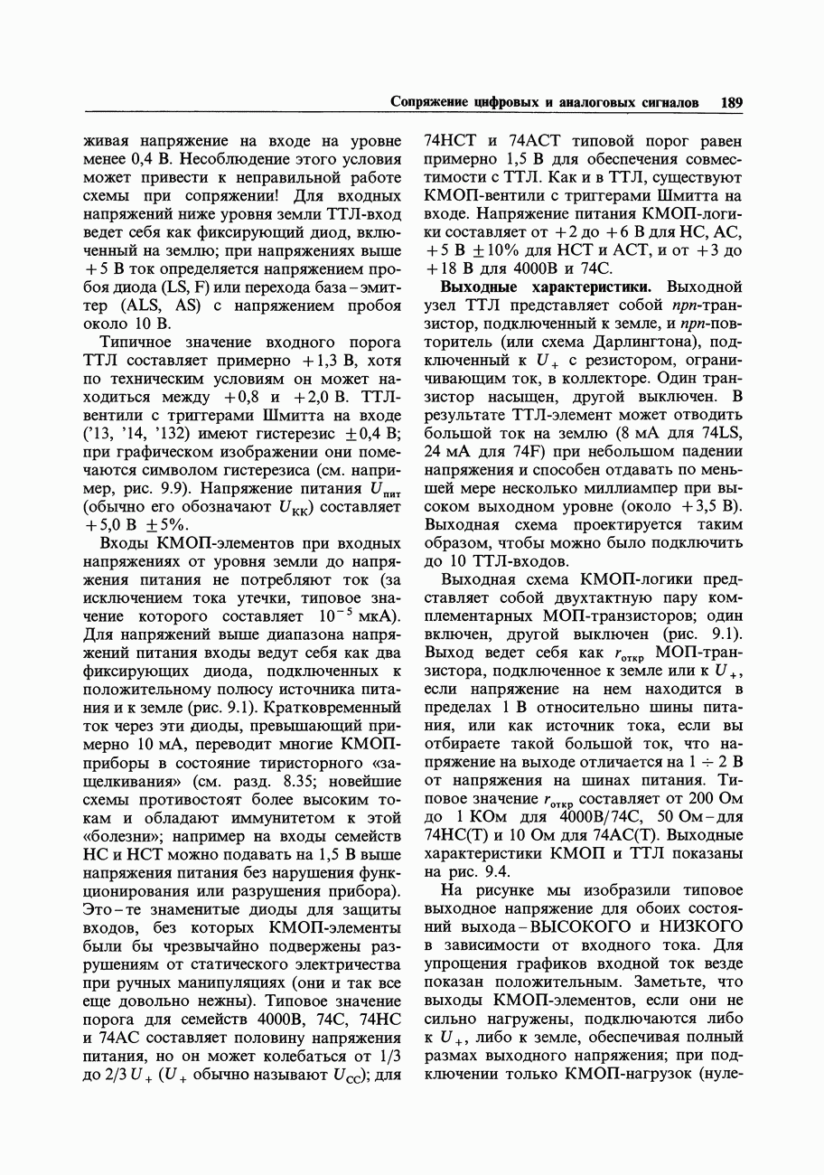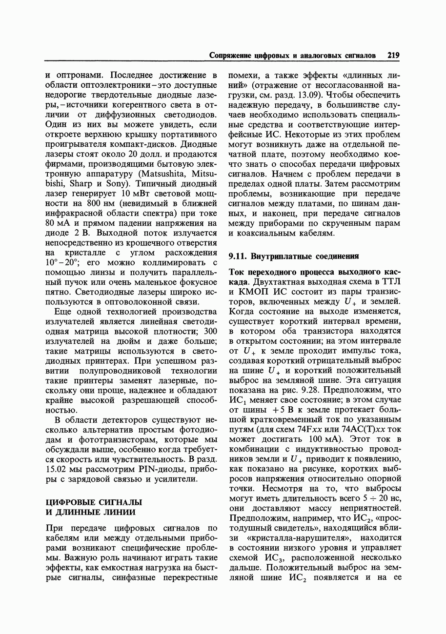 где В, как обычно, - коэффициент передачи цепи обратной связи. Разумеется, в некоторых схемах, таких как фильтры, В может также зависеть от частоты. Упражнение 7.3. Выведите представленное выше выражение для Переходные нелинейные искажения и выходное сопротивление.Некоторые ОУ используют простой пушпульный выходной каскад без смещения баз на два диодных перепада в разные стороны, как описывалось в разд. 2.15. Это приводит к искажениям класса В при значениях выходного сигнала, близких к нулю, так как возбуждающий повторитель каскад должен давать напряжению баз приращение каждый раз, когда выходной ток проходит через нуль (рис. 7.15).
