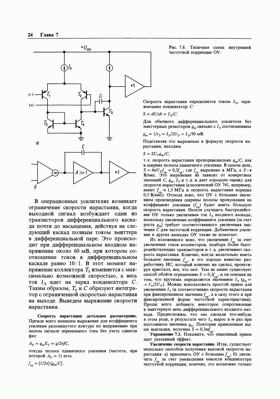 Рис. 7.8. Типичная схема внутренней частотной коррекции ОУ. Из изложенного ясно, что увеличение Упражнение 7.1. Покажите, что описанный прием дает указанный эффект. Увеличение скорости нарастания. Итак, существует несколько способов получения высокой скорости нарастания: а) применить ОУ с большим