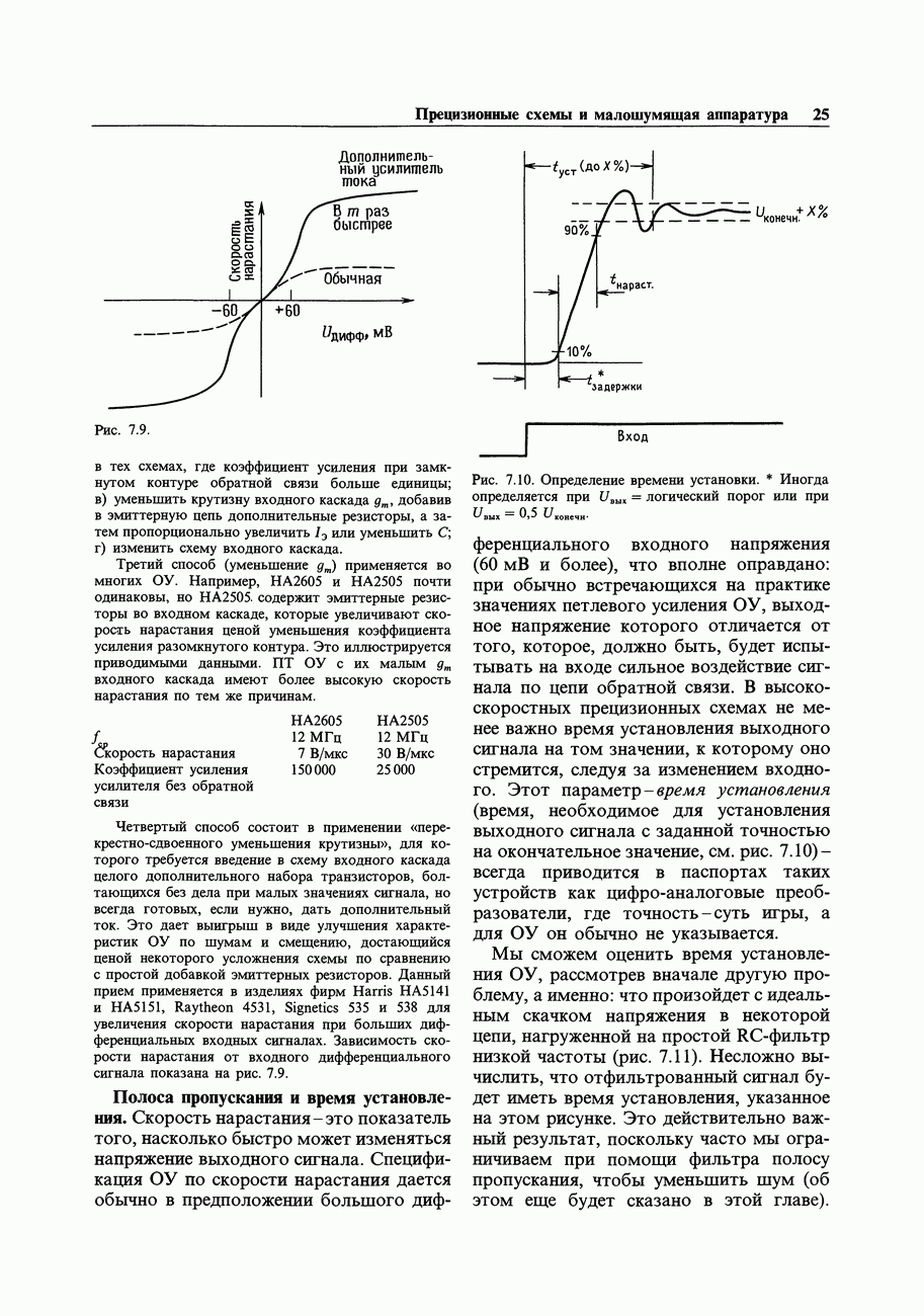 Четвертый способ состоит в применении «перекрестно-сдвоенного уменьшения крутизны», для которого требуется введение в схему входного каскада целого дополнительного набора транзисторов, болтающихся без дела при малых значениях сигнала, но всегда готовых, если нужно, дать дополнительный ток. Это дает выигрыш в виде улучшения характеристик ОУ по шумам и смещению, достающийся ценой некоторого усложнения схемы по сравнению с простой добавкой эмиттерных резисторов. Данный прием применяется в изделиях фирм Harris Полоса пропускания и время установления.Скорость нарастания - это показатель того, насколько быстро может изменяться напряжение выходного сигнала.