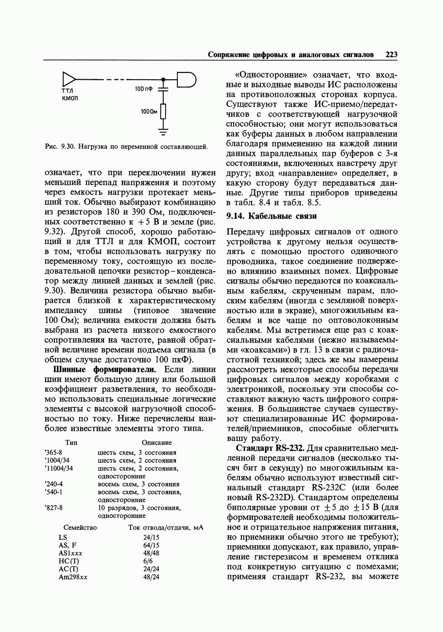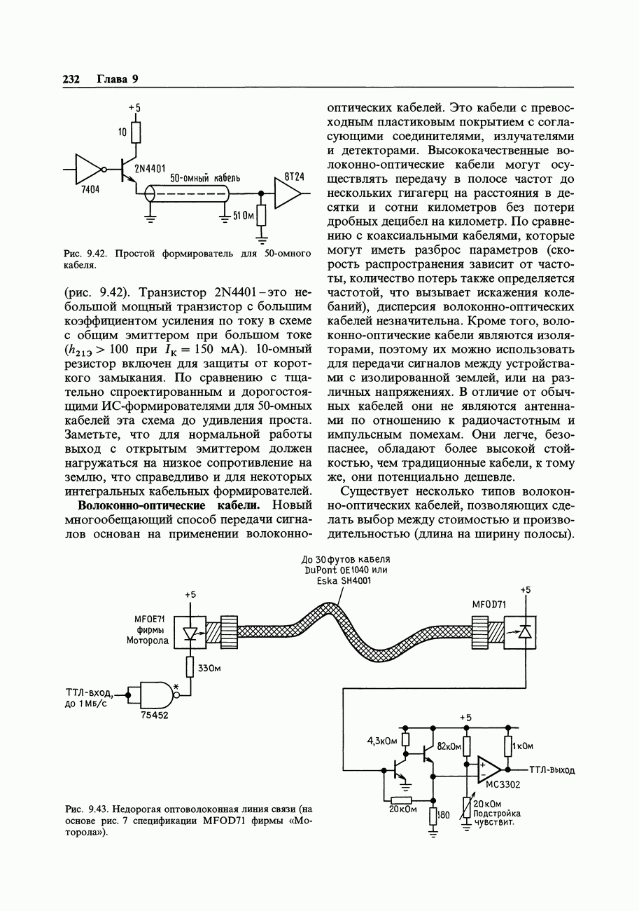 Существуют два способа решения этих вопросов. Один из них состоит в добавлении последовательно выходу резистора и введении обратной связи на высоких частотах непосредственно с выхода ОУ, а на низких частотах и постоянном токе - от точки присоединения кабеля (рис. 7.17). Конкретные значения параметров, указанные на второй схеме, характерны для данного ОУ и схемы его включения и дают представление о том, какая емкость может служить нагрузкой. Но такой прием ухудшает высокочастотные характеристики, так как обратная связь на высоких частотах не влияет на сигнал на кабеле. Буферные усилители мощности с единичным коэффициентом усиления.