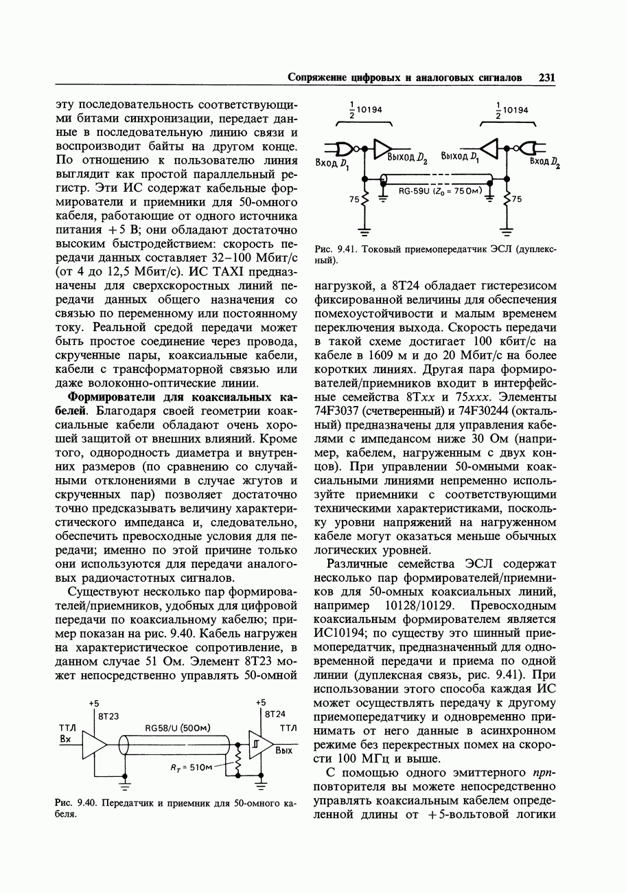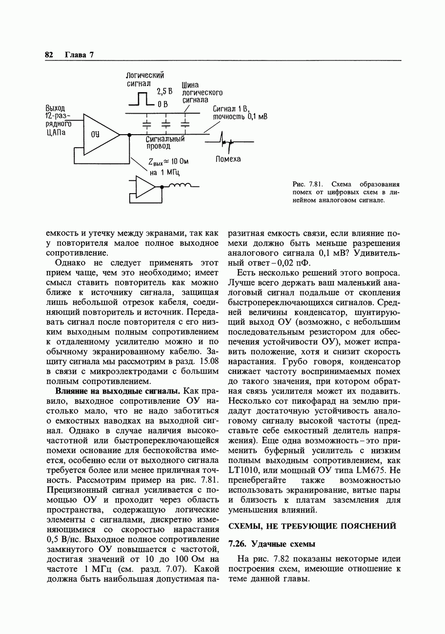 Рис. 7.18. Если метод расщепления цепи обратной связи нельзя применить, то лучшее, что можно Заметим, что приведенный пример выглядел бы иначе, если бы кабель был включен на свое характеристическое сопротивление. Он действовал бы как чисто активное сопротивление в пределах от 50 до 100 Ом в зависимости от типа кабеля. В этом случае буферный усилитель был бы обязателен и должен был давать ток На схему из предыдущего примера не влияют выходные параметры ОУ, поскольку она работает, в сущности, на постоянном токе.