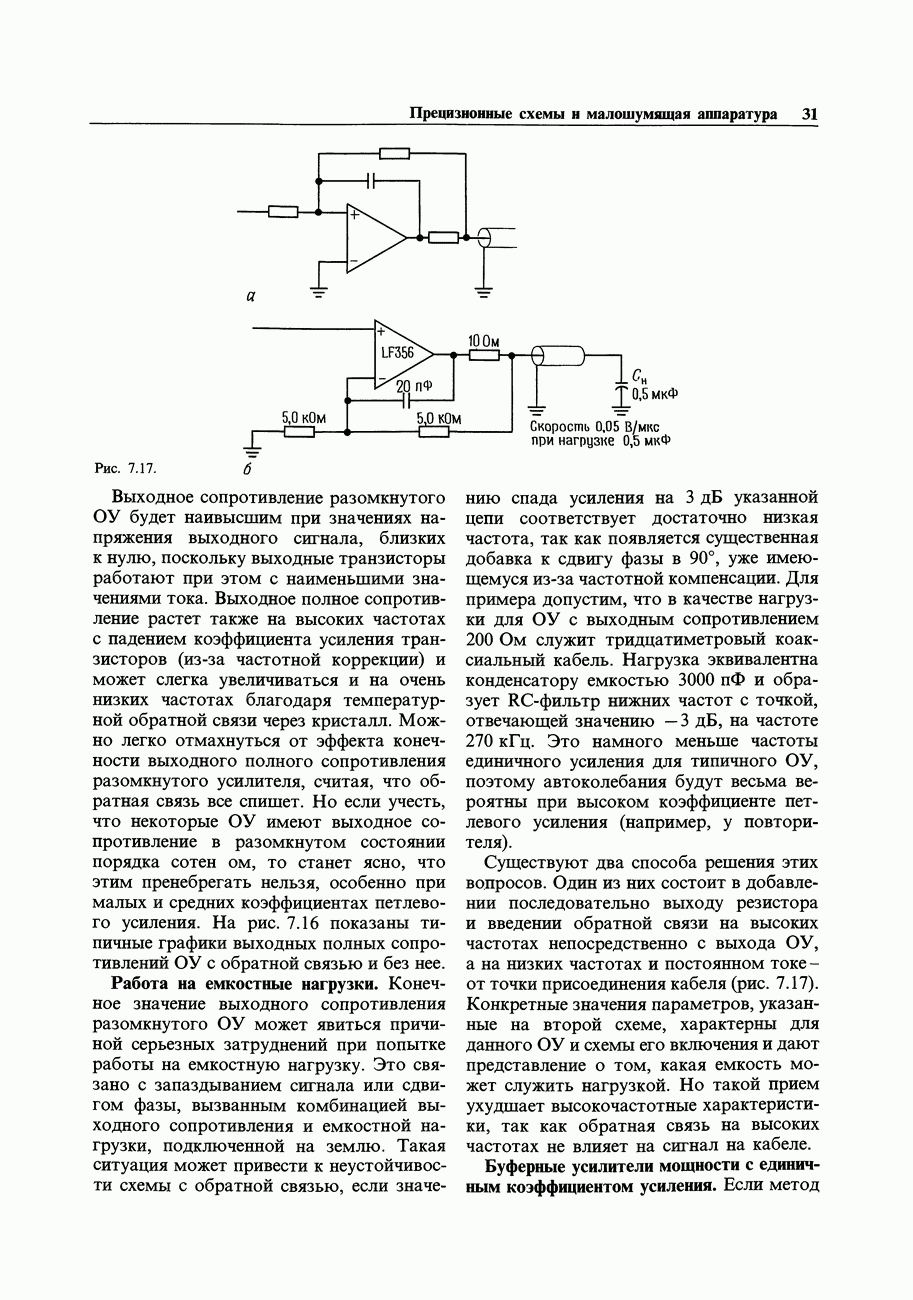 Рис. 7.17. Выходное сопротивление разомкнутого ОУ будет наивысшим при значениях напряжения выходного сигнала, близких к нулю, поскольку выходные транзисторы работают при этом с наименьшими значениями тока. Выходное полное сопротивление растет также на высоких частотах с падением коэффициента усиления транзисторов (из-за частотной коррекции) и может слегка увеличиваться и на очень низких частотах благодаря температурной обратной связи через кристалл. Можно легко отмахнуться от эффекта конечности выходного полного сопротивления разомкнутого усилителя, считая, что обратная связь все спишет. Но если учесть, что некоторые ОУ имеют выходное сопротивление в разомкнутом состоянии порядка сотен ом, то станет ясно, что этим пренебрегать нельзя, особенно при малых и средних коэффициентах петлевого усиления. На рис. 7.16 показаны типичные графики выходных полных сопротивлений ОУ с обратной связью и без нее. Работа на емкостные нагрузки.Конечное значение выходного сопротивления разомкнутого ОУ может явиться причиной серьезных затруднений при попытке работы на емкостную нагрузку. Это связано с запаздыванием сигнала или сдвигом фазы, вызванным комбинацией выходного сопротивления и емкостной нагрузки, подключенной на землю. Такая ситуация может привести к неустойчивости схемы с обратной связью, если значению спада усиления на 3 дБ указанной цепи соответствует достаточно низкая частота, так как появляется существенная добавка к сдвигу фазы в 90°, уже имеющемуся из-за частотной компенсации. Для примера допустим, что в качестве нагрузки для ОУ с выходным сопротивлением 200 Ом служит тридцатиметровый коаксиальный кабель. Нагрузка эквивалентна конденсатору емкостью и образует -фильтр нижних частот с точкой, отвечающей значению —3 дБ, на частоте . Это намного меньше частоты единичного усиления для типичного ОУ, поэтому автоколебания будут весьма вероятны при высоком коэффициенте петлевого усиления (например, у повторителя).